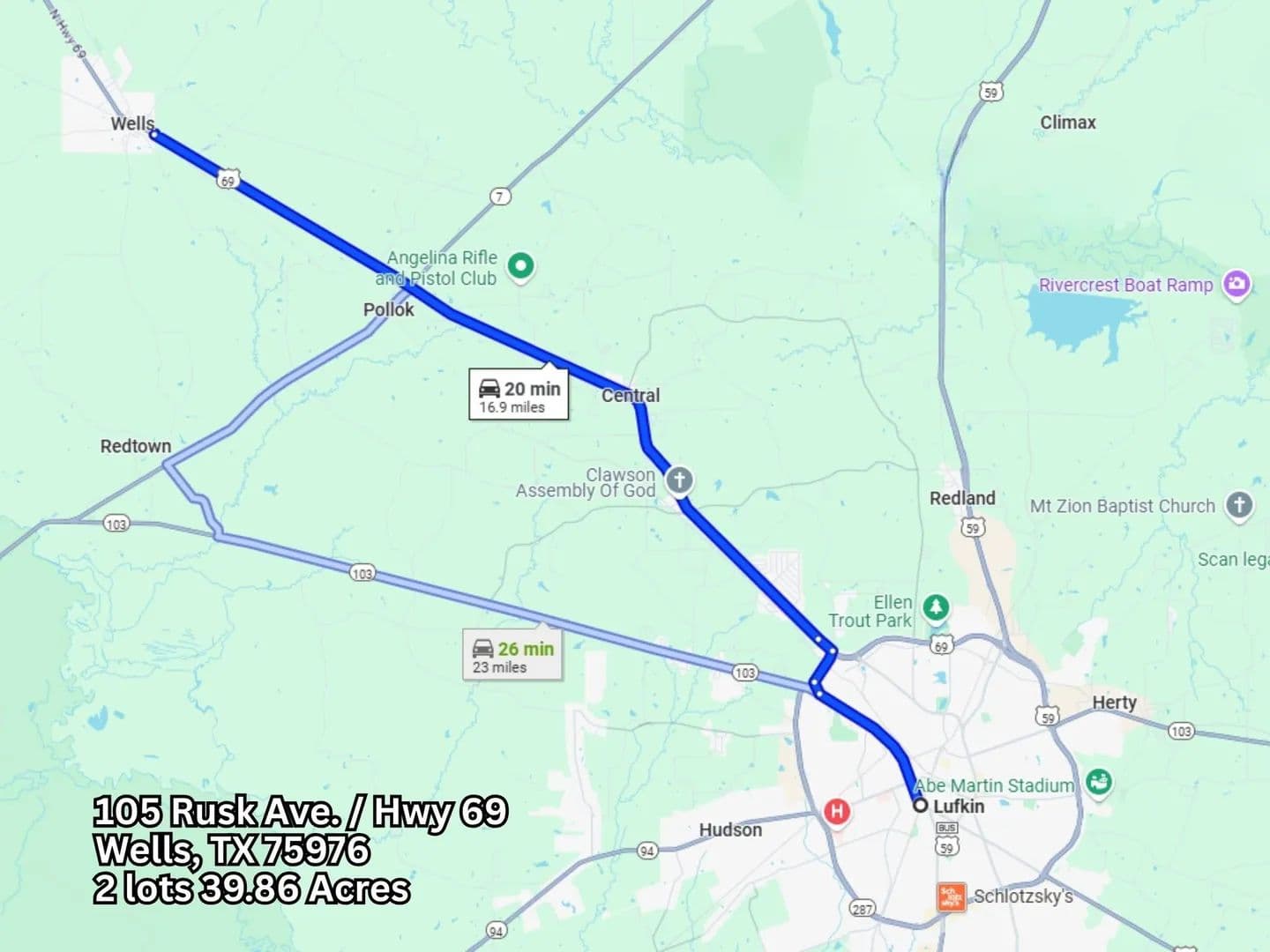 Unlock the potential of 39+ acres of prime land, perfectly positioned for commercial development. Located just off Hwy 69 in a high-visibility corridor, this expansive property offers outstanding access to major roadways and nearby amenities—an ideal setting for investors, developers, or business owners seeking growth opportunities. Only 20 minutes from Lufkin and right outside Wells, the location serves both local residents and surrounding communities, making it a strong choice for retail, industrial, hospitality, or mixed-use concepts. With the area experiencing steady growth, this site presents a strategic opportunity to get ahead of future development. Don’t miss your chance to secure a significant tract of land in a rapidly expanding market and bring your vision to life.