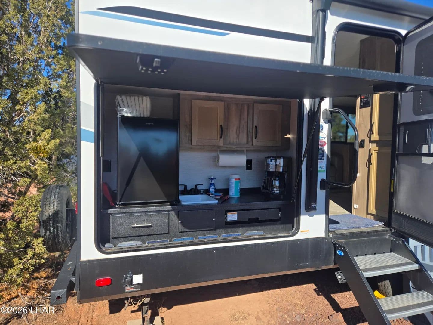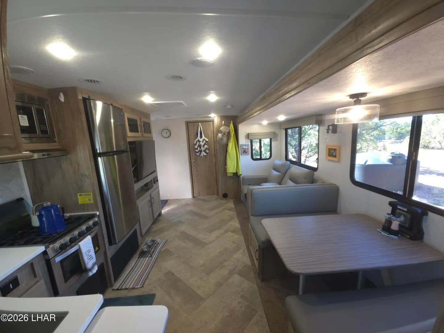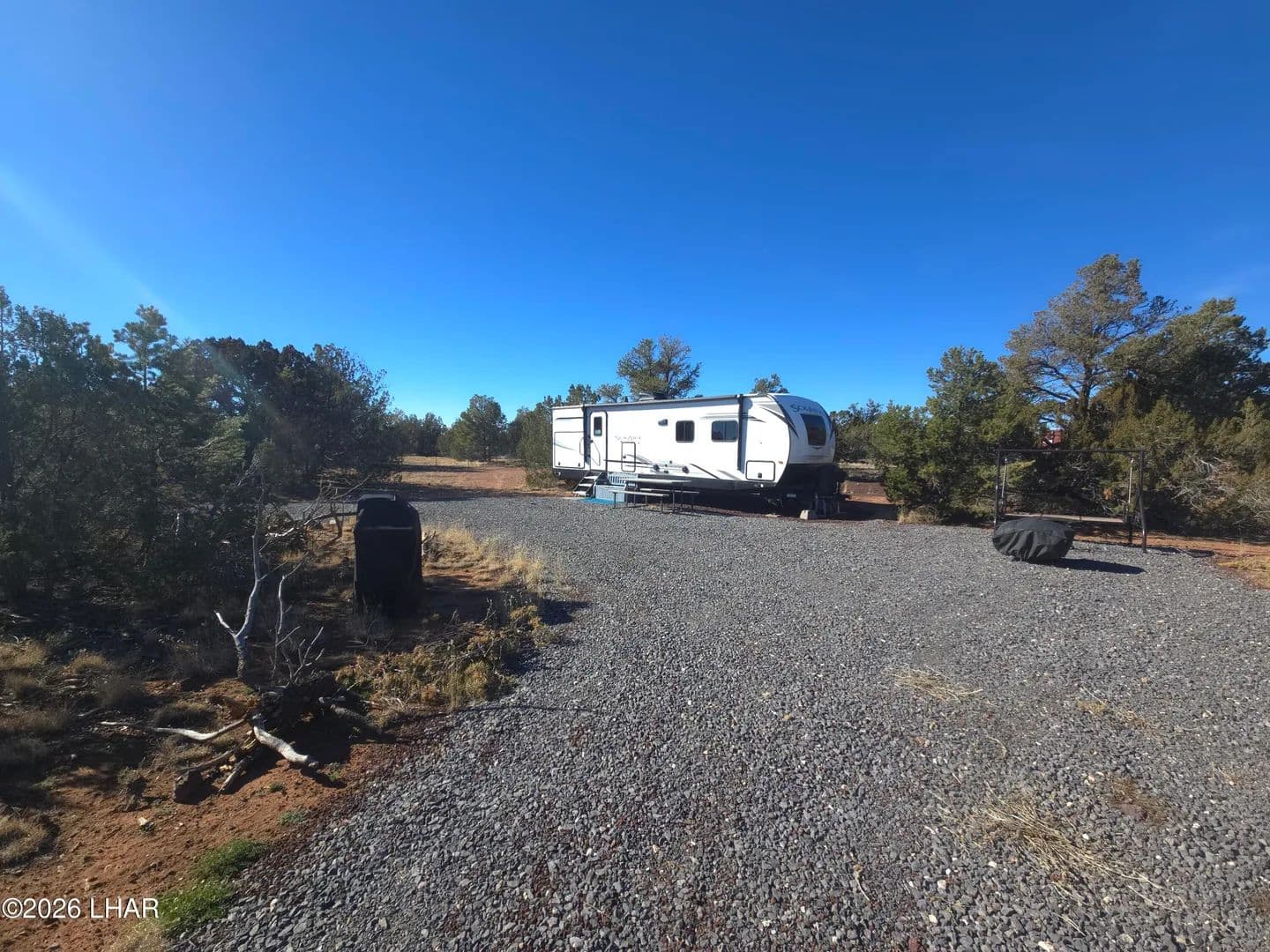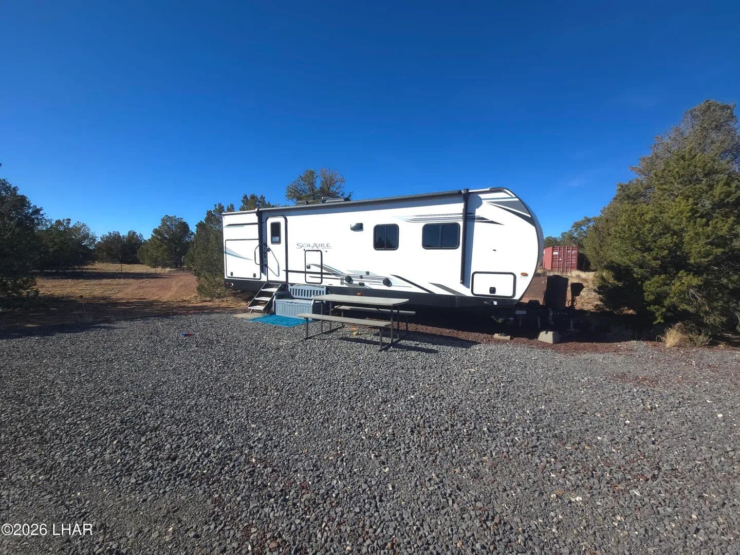 Open air and Blue skies on this beautiful mountain retreat! Fully fenced and locked gates are just a couple of the improvements on this property! 2500 gallon water storage has more than enough for your needs! Solar already in place and ready for use. Lots of mature Juniper and pinion pines for lots of shade. Cindered driveway in with a huge area cleared for building your dream getaway or hunker down in the 2023 - 1 bd 1 bath RV included. You also could make the 40 ft connex into a tiny home. So many possibilities!