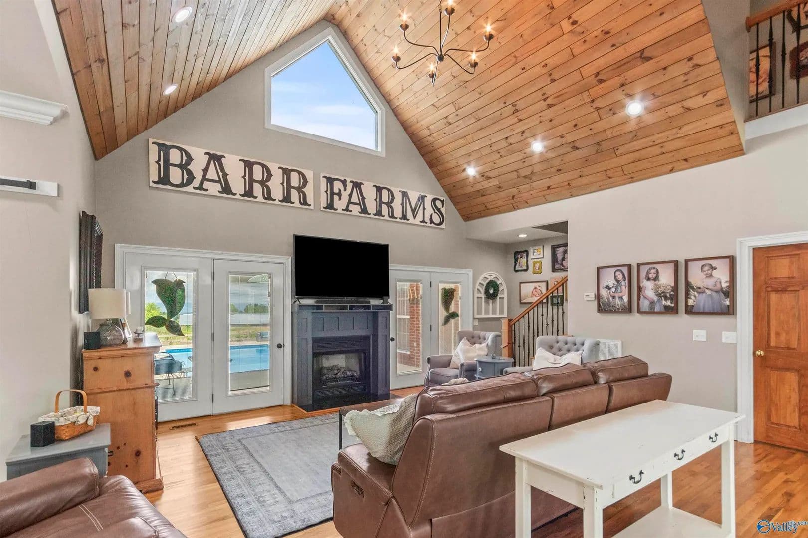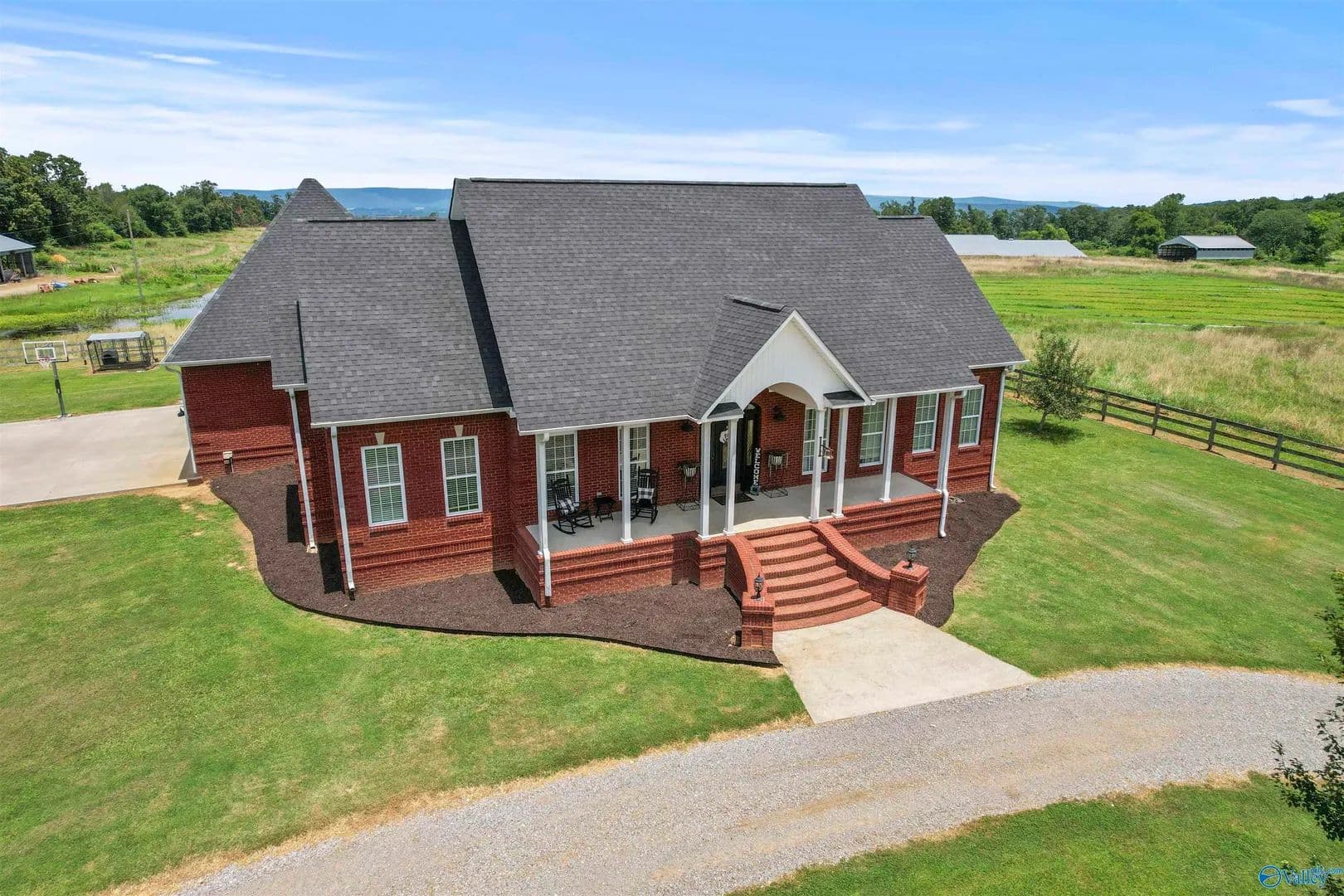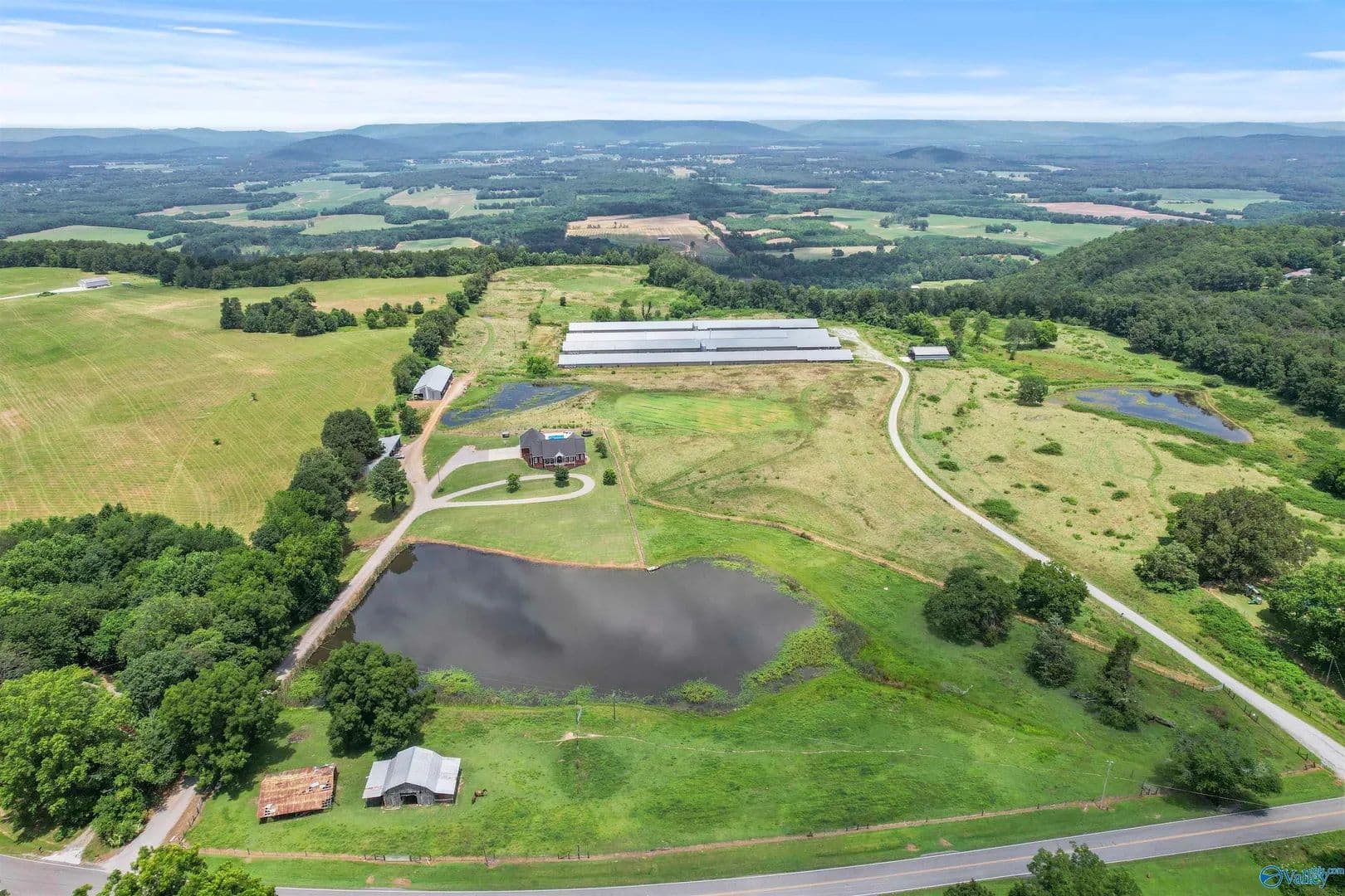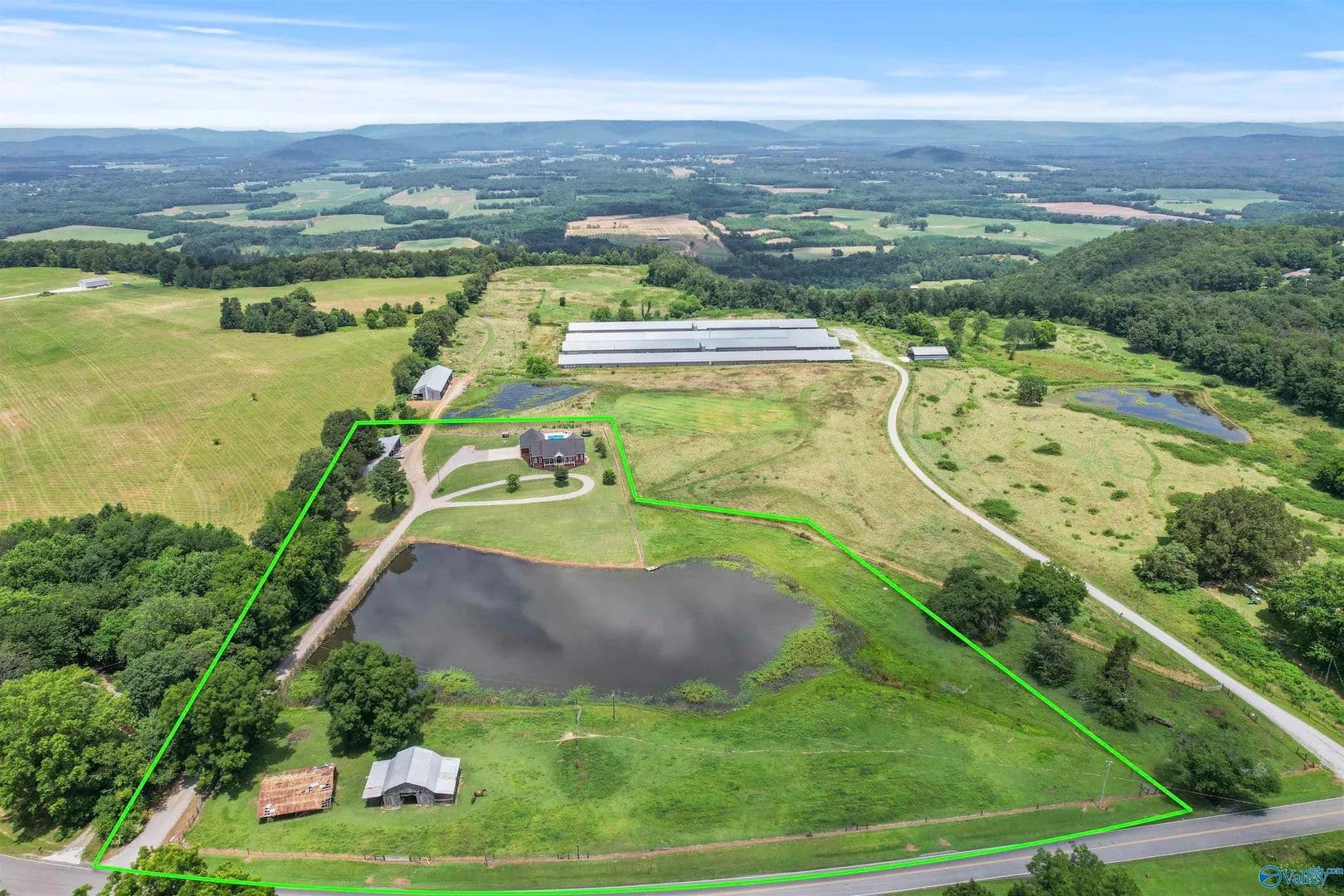 Price Reduction! These views!!! The property backs up to the bluff, offering serene views—and even better, the empty chicken houses behind the property are scheduled to be torn down, opening up a clear, unobstructed view of the entire bluff soon. The home features a spacious 4-bedroom, 3-bath home with a bonus room. Step outside and enjoy your own private saltwater pool, perfect for summer days and entertaining. Also on the property is a 3 acre stocked pond, a 5 bay shop and a storm shelter! This stunning home combines privacy, comfort, and breathtaking scenery. Don’t miss this opportunity to own nearly 8 beautiful acres! Pending Survey. Boundary lines are approximate.