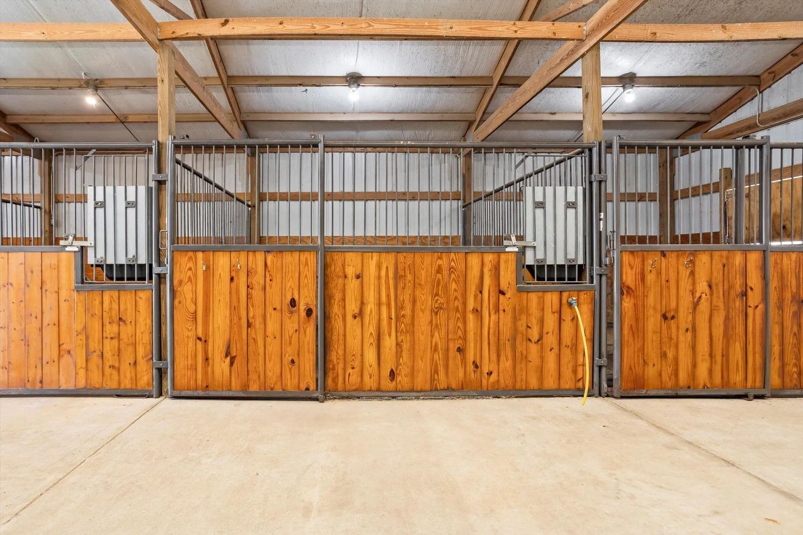 The Barn - The 6-stall center aisle horse barn has 12x12 Horseman's Choice stalls with sliding doors & pull-out feeders, 15'7'' wide concrete aisle, large tack room lounge with sink and a hay/equipment overhang to the side. Grassy pastures have shade trees and can be viewed from the home. This is a perfect set-up for a hobby farm and horseback riding.