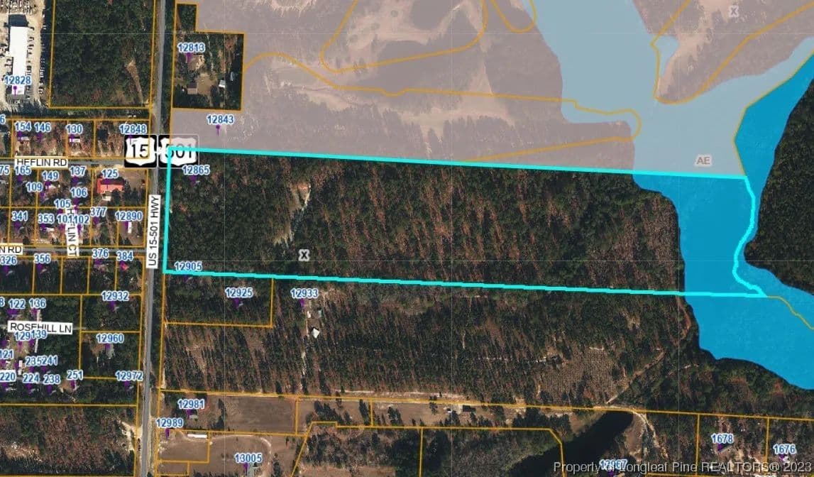 BACK ON MARKET DUE TO NO FAULT OF SELLERS! ACREAGE AND LOCATION! Perfect for development or a beautiful homesite. Roughly 35.5 acres located in Moore County on US HWY 15/501, just outside Aberdeen city limits, next to Legacy Lakes! Fantastic rectangular shape, with approximately 580 feet of public road frontage. The depth of the property is estimated to be 2700 ft. The land is level at the front with a cleared area, and gently rolling as you go further back towards the pond. There is an existing well at the front of the property to the right of the house. The house is not inhabitable. Buyer to have survey completed for accuracy. There is an area of wetlands/flood zone at the rear of the property, where the stream and the pond are, as pictured in attached photos. Estimated area is 6 acres where flood zone and wetlands are, using GIS measuring tools.