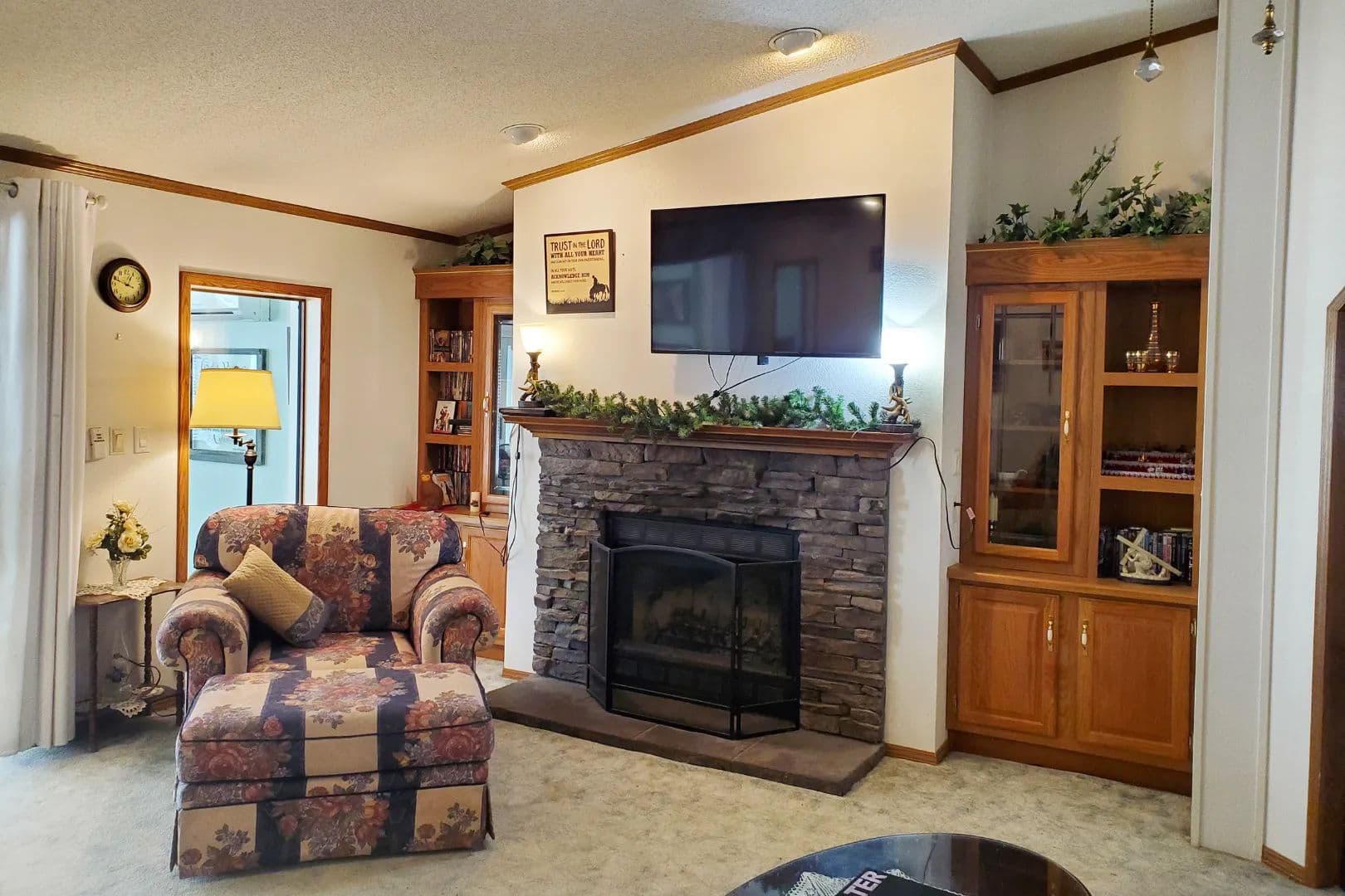* Fireplace in the living room.