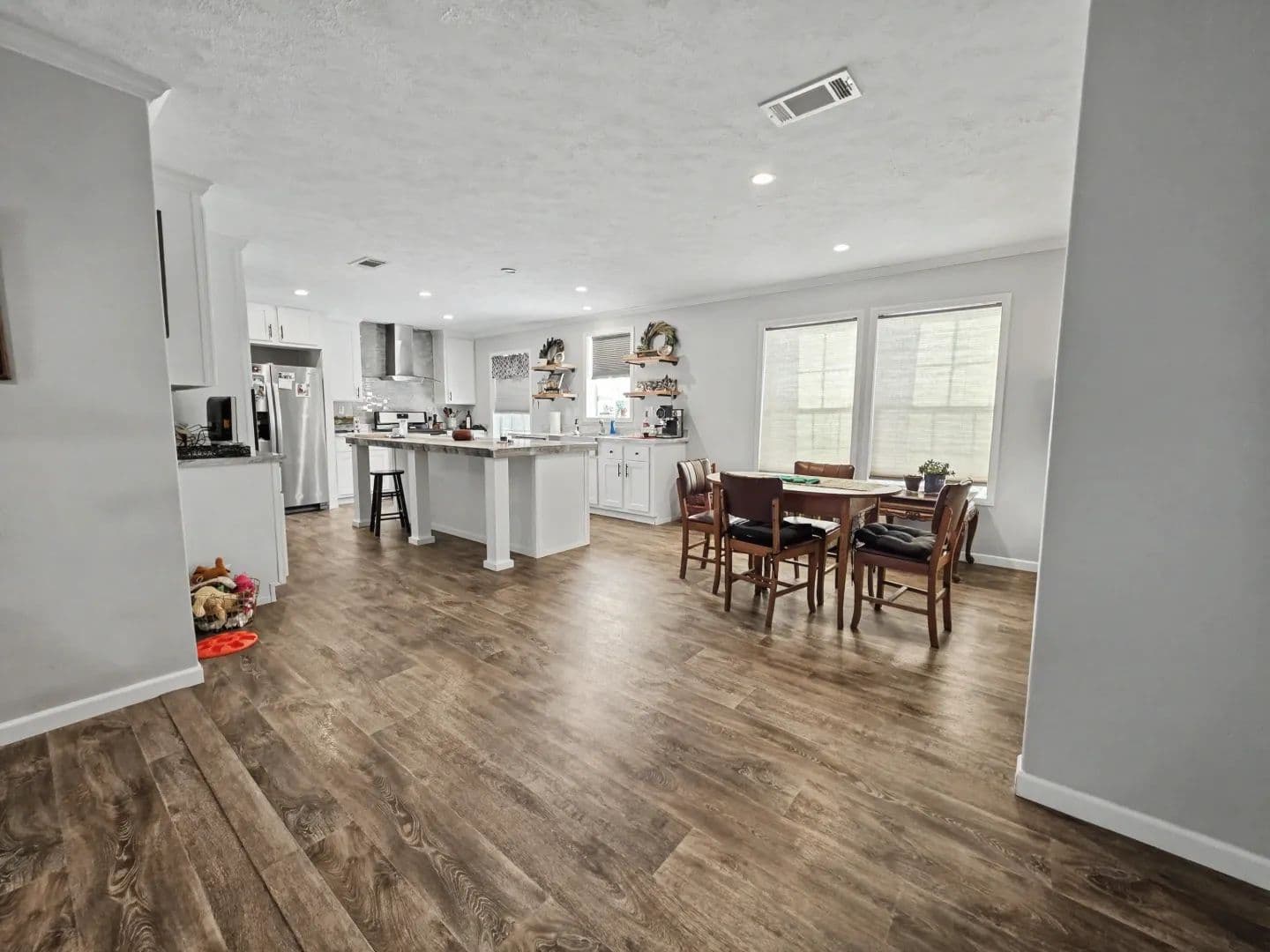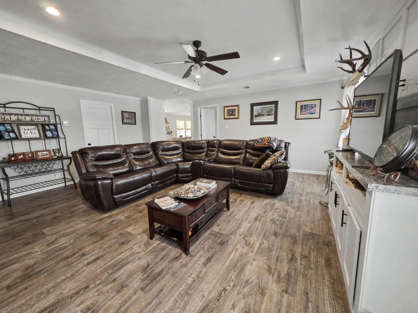 Built in 2021, the 2,305-square-foot manufactured home offers a true “like-new” feel, blending modern comfort with rural charm. Featuring four bedrooms and two full bathrooms, the home includes upgraded windows and enhanced exterior wall construction to improve energy efficiency. The spacious, open layout allows for abundant natural light and comfortable everyday living. A walk-out porch overlooks the surrounding landscape, creating a peaceful setting for morning coffee or evening relaxation, while the covered back patio provides an inviting space for cookouts, gatherings with family and friends, and evenings spent around the fire pit.