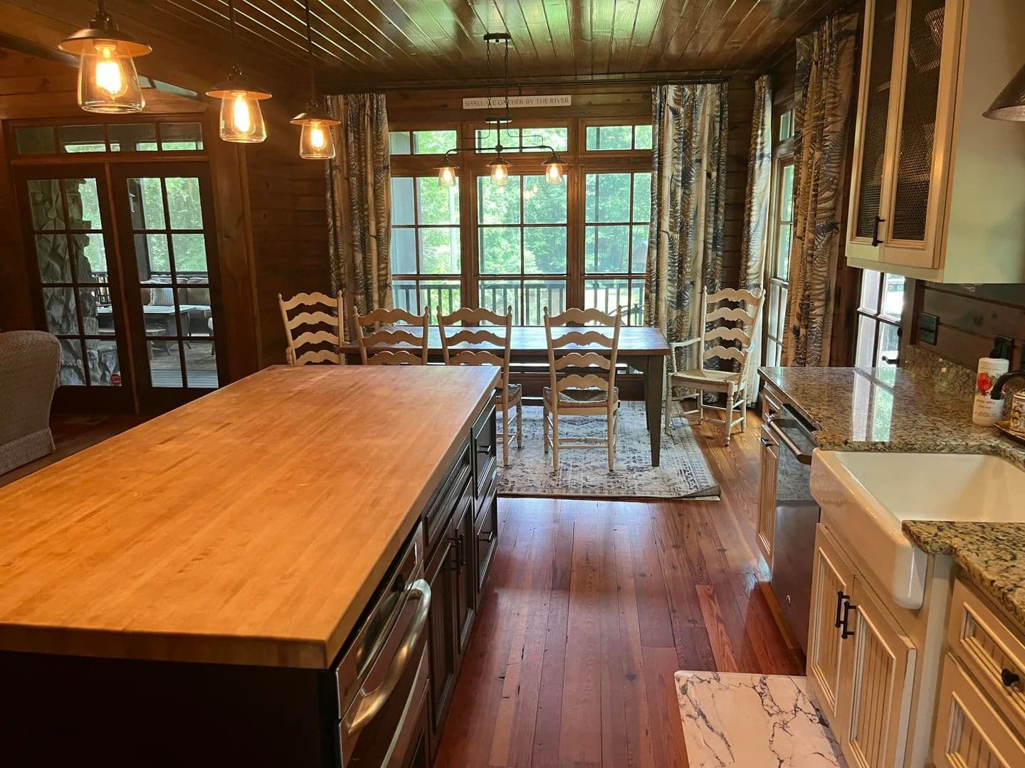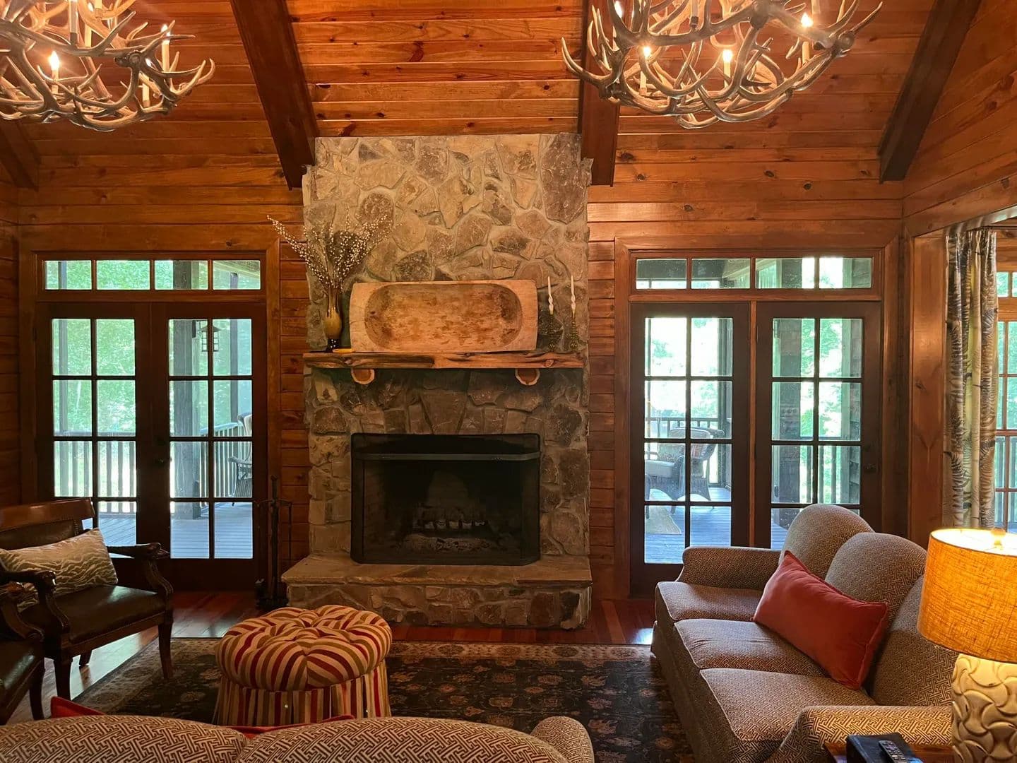 Main Level: A spacious kitchen with custom-designed cabinets and a large island seating four, an inviting family room, a luxurious master suite, a half bath, and a grand stone fireplace adorned with beautiful deer chandeliers, enhancing the home's hunting lodge ambiance. Step onto the screened-in deck, complete with a second fireplace, and take in breathtaking river views.