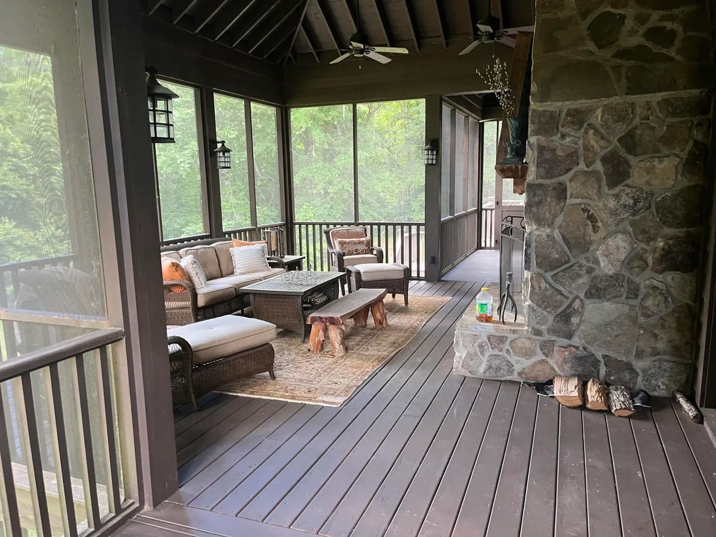 Lower Level: A second living area, an additional bedroom, and a full bath, along with another screened-in entertainment area, provide ample space for guests.