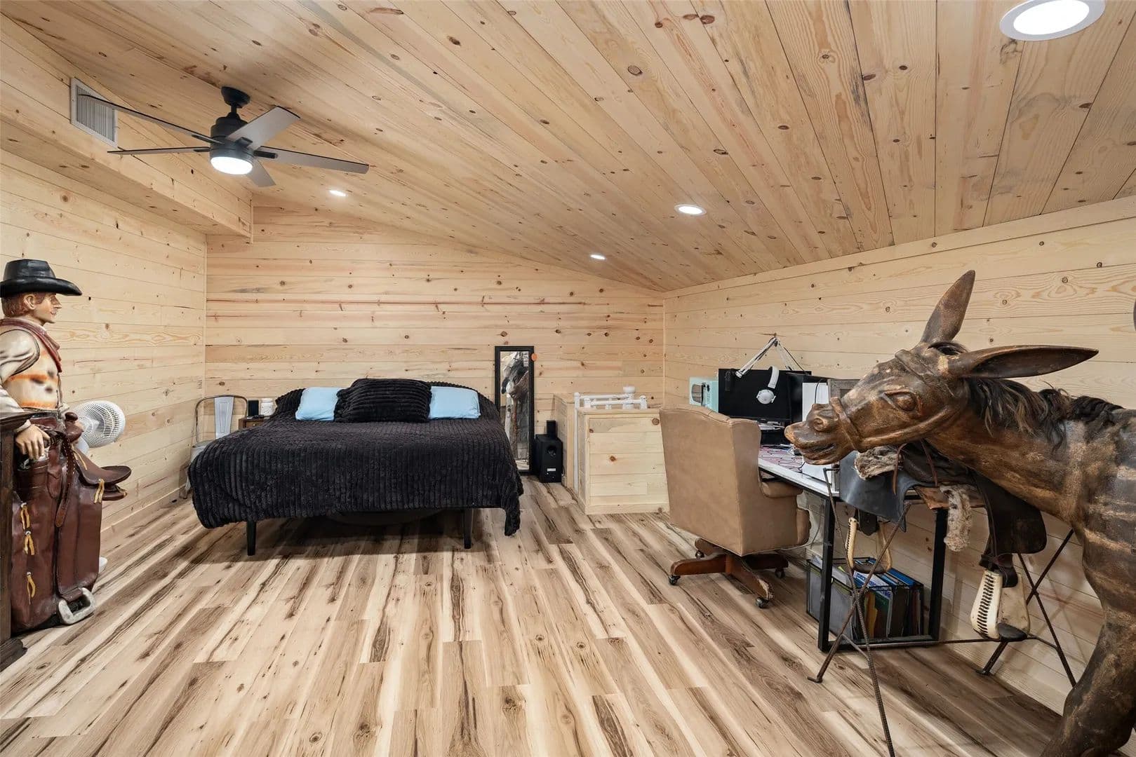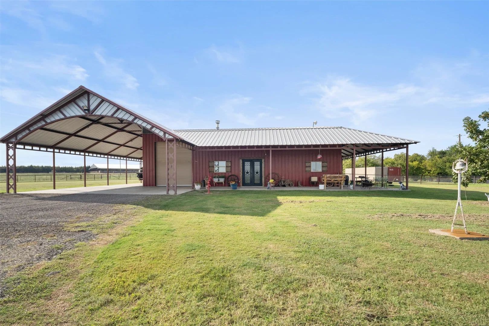 As you pass through the custom gated entrance, the majestic ranch views unfold. Perched on a gentle hilltop, a stunning barndominium stands alongside a classic windmill. The surrounding pastures are alive with the sight of cattle, the views are picturesque. More than a property it's a private retreat where the big sky and quiet landscape create a sense of freedom. Custom double doors with Texas star accents say come on in. The home's soaring ceilings and open floor plan are breathtaking. The living area easily accomodates big sofas, the wood burning stove is a masterpiece. A stunning kitchen with a rugged, chiseled granite island serves as the centerpiece. The faux stone walls add texture, the entire kitchen is a visual delight, stainless appliances are top of the line. The primary suite is a true retreat, with a relaxing en-suite BA. For those working from home or seeking a quiet space for hobbies or home school, the home office provides the perfect, sunlit spot to focus and create. With 4 BR, 2.1 BA, this home is designed for both comfort and convenience. Hickory hardwood floors upstairs, tasteful knotty pine tongue and groove walls, beams, are only a few of the features that add warmth to this wide open space. The over 3,000 sq ft wraparound porch showcases the ranch, enjoy quiet country sunsets or watch the storm roll in. Extended covered parking will accommodate the height of an RV, multiple vehicles. For the discerning rancher, with over 12+ acres of prime agricultural land, fenced and cross-fenced for efficient, safe cattle management. The quality of the high-end fencing speaks to the property's superior standards. A beautiful stock tank with fountain, provides a reliable water source for your herd. Located within competitive Trenton ISD, close to State HWY 121 & 78, shopping and restaurants. Major thoroughfares provide quick and easy access to McKinney, Sherman, Melissa, Anna, Bonham, Greenville.