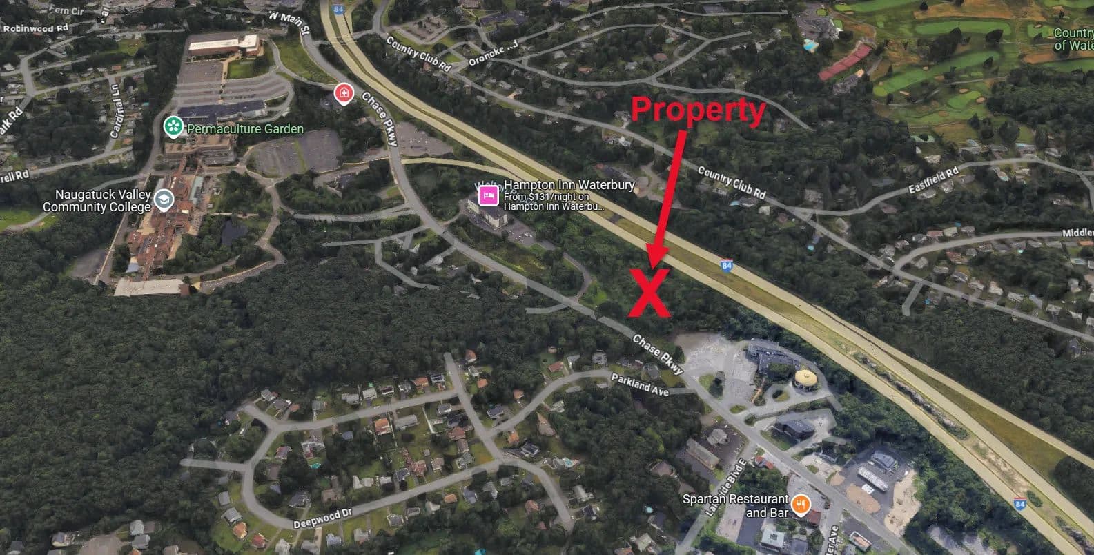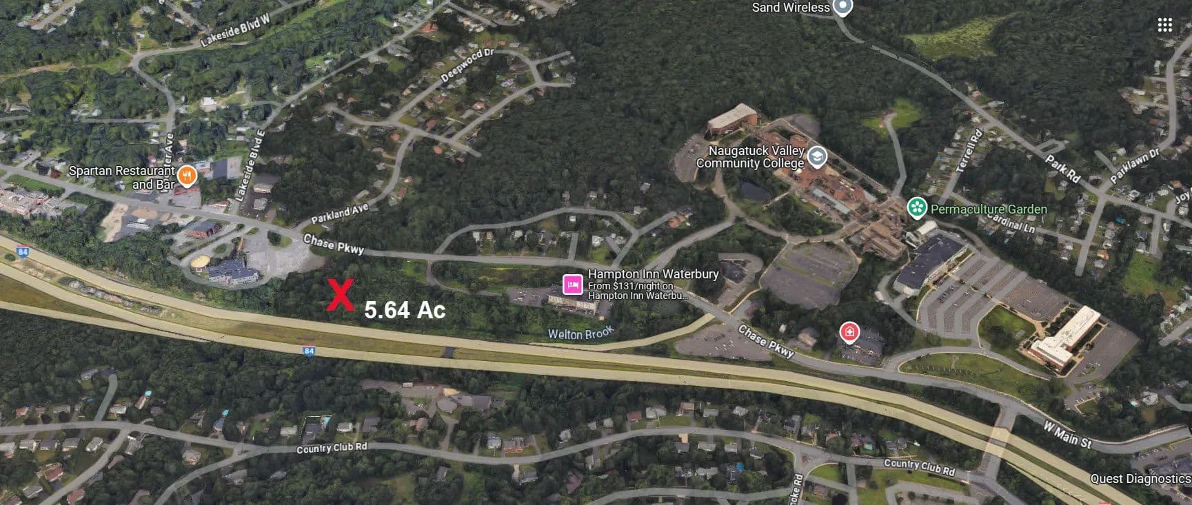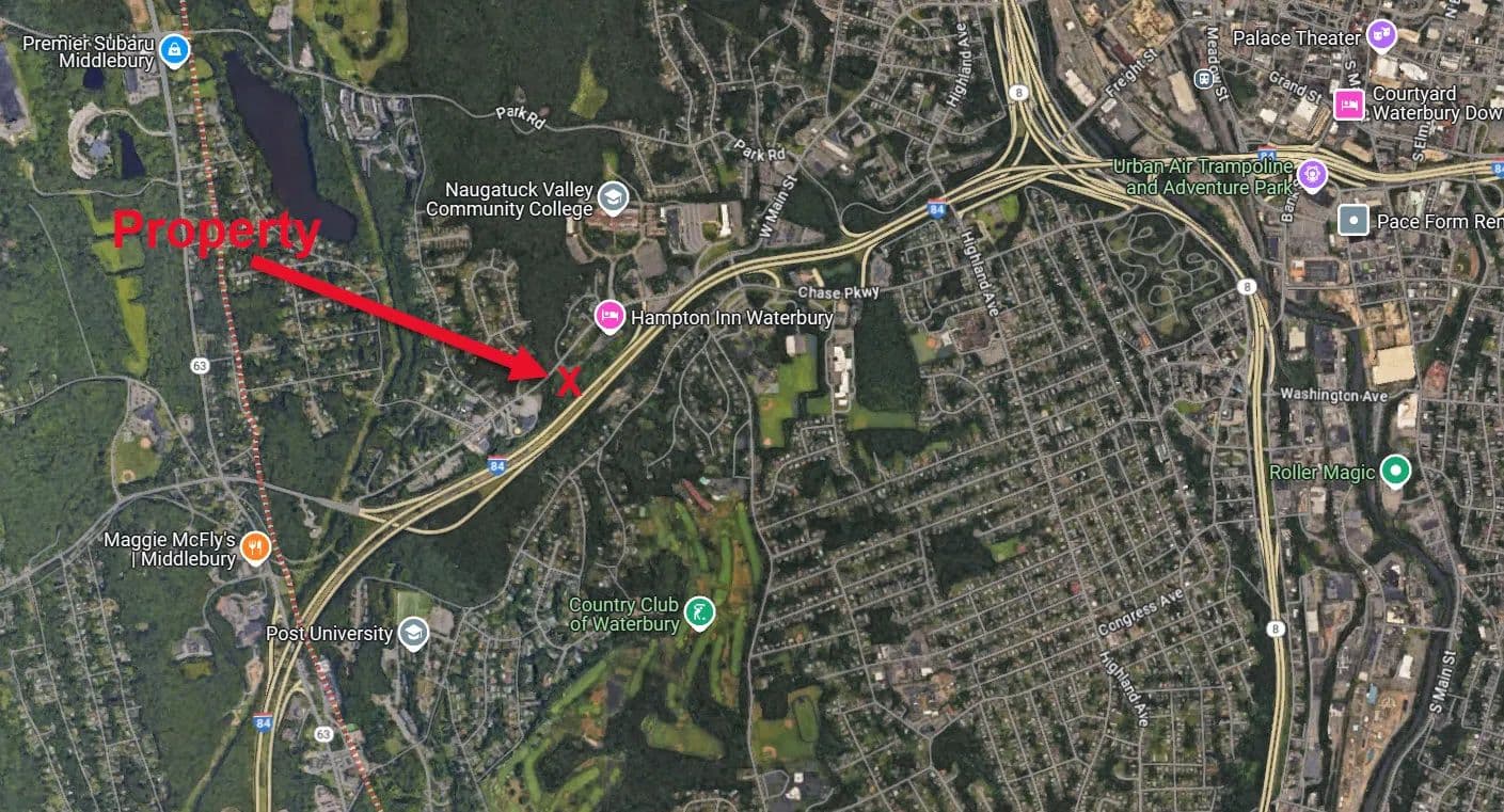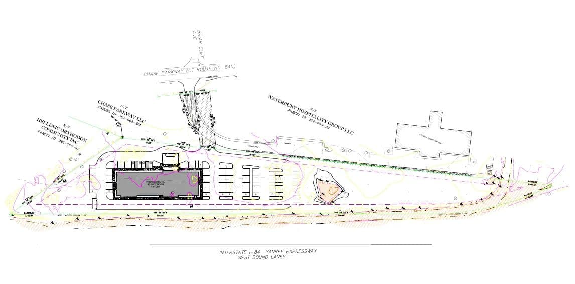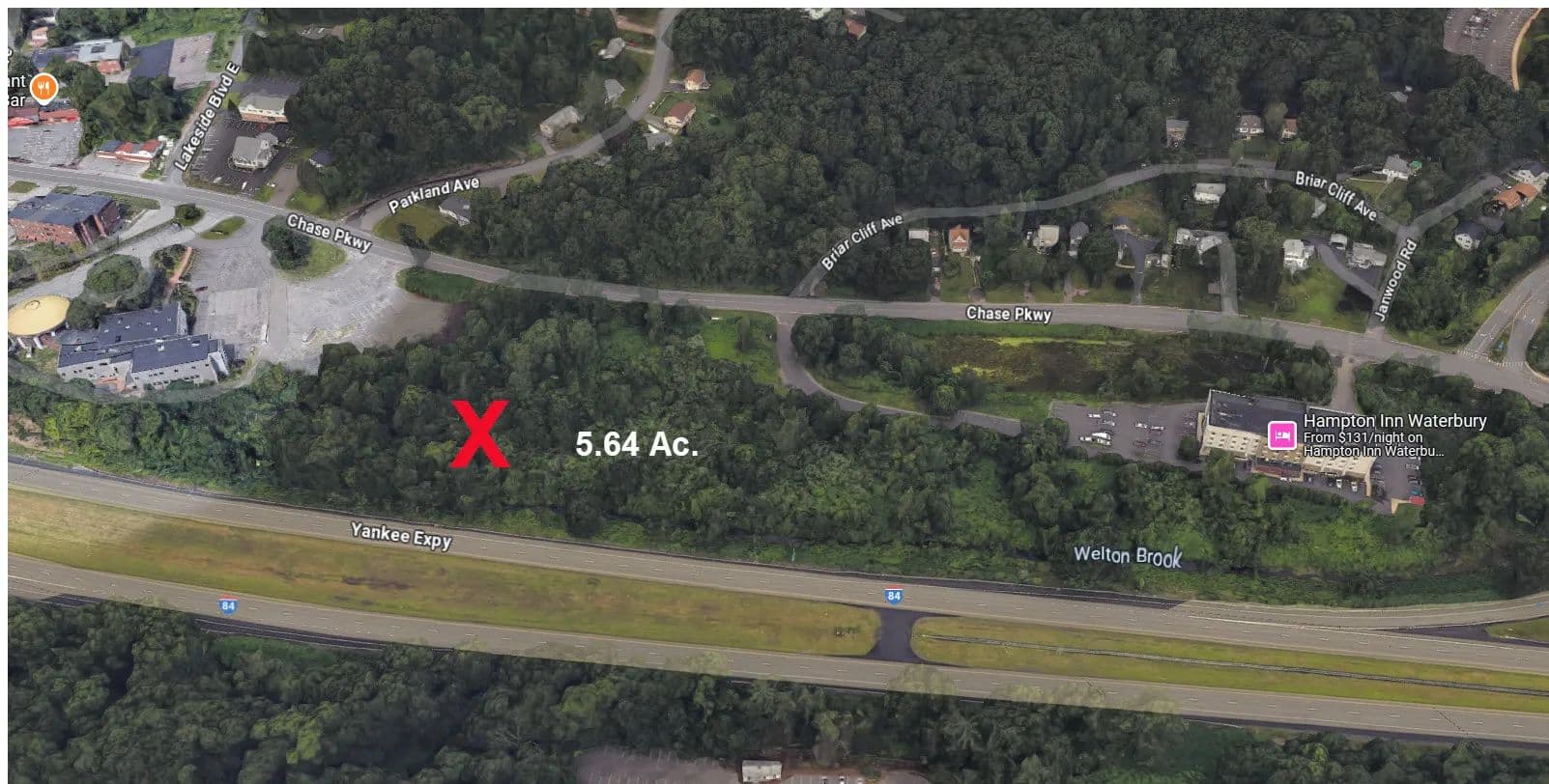 Presenting a rare opportunity to acquire a strategically located 5.64-acre commercial parcel in the heart of Waterbury, Connecticut. Directly adjacent to the Hampton Inn and visible from Interstate 84, the site offers synergy with established hotel traffic and infrastructure. The proposed site plan for hotel development makes it an ideal candidate for hospitality developers, flagged hotel brands, or investors seeking exposure in a high-demand lodging corridor. Just off I-84, less than ¼ mile from Exits 17 & 18 in Waterbury, five minutes' drive from downtown's shops, dining, and entertainment, Mattatuck Museum, Brass Mill Center Mall, Naugatuck Valley Community College, Post University, and the University of Connecticut (Waterbury Campus). The amusement and water park at Lake Compounce is only 15 miles away. NOTE: Since this lot was not assigned a Street Number at the time it is being listed, the address 887 Chase Pkwy. is being used temporarily just so an accurate map location shows