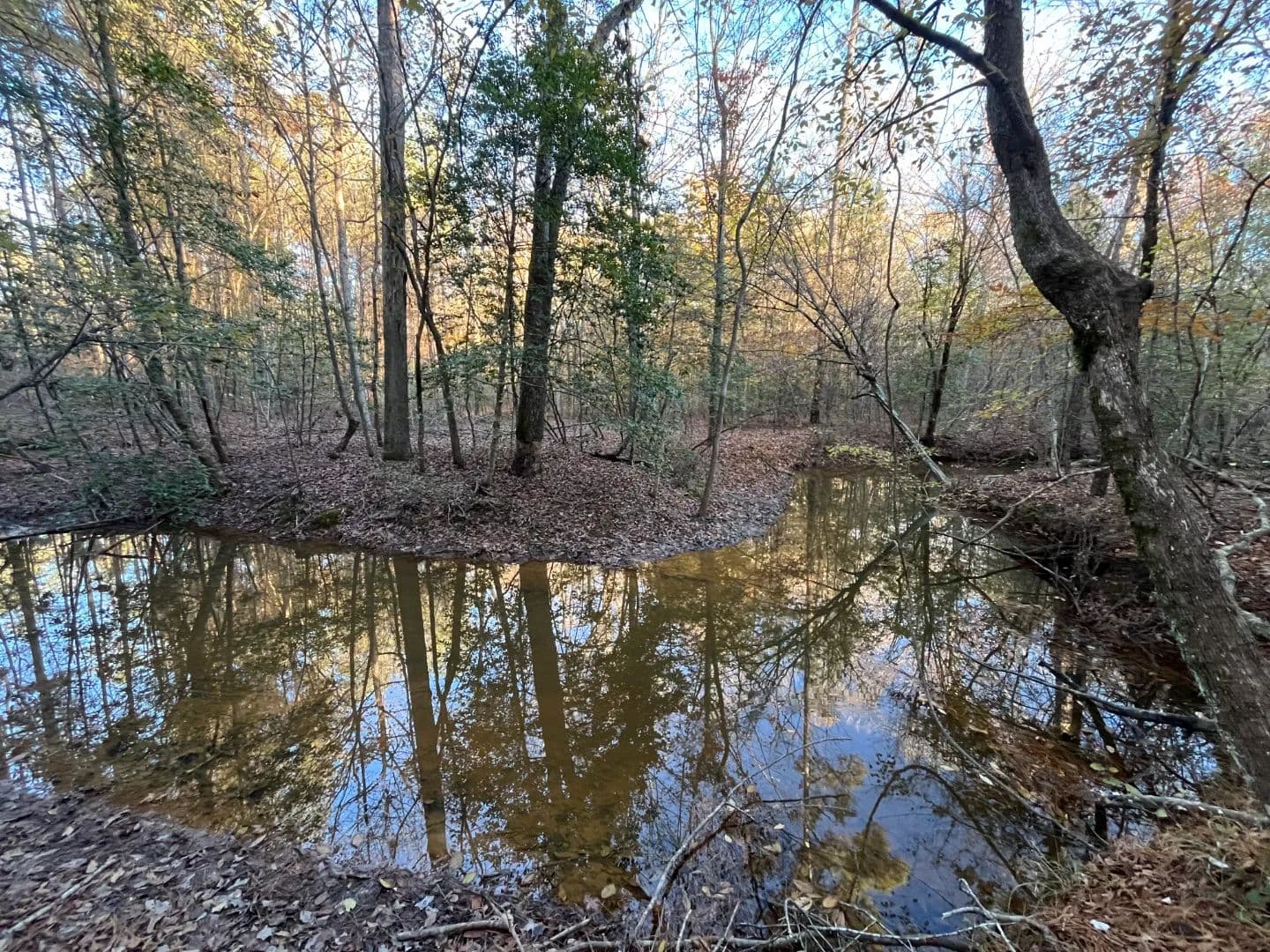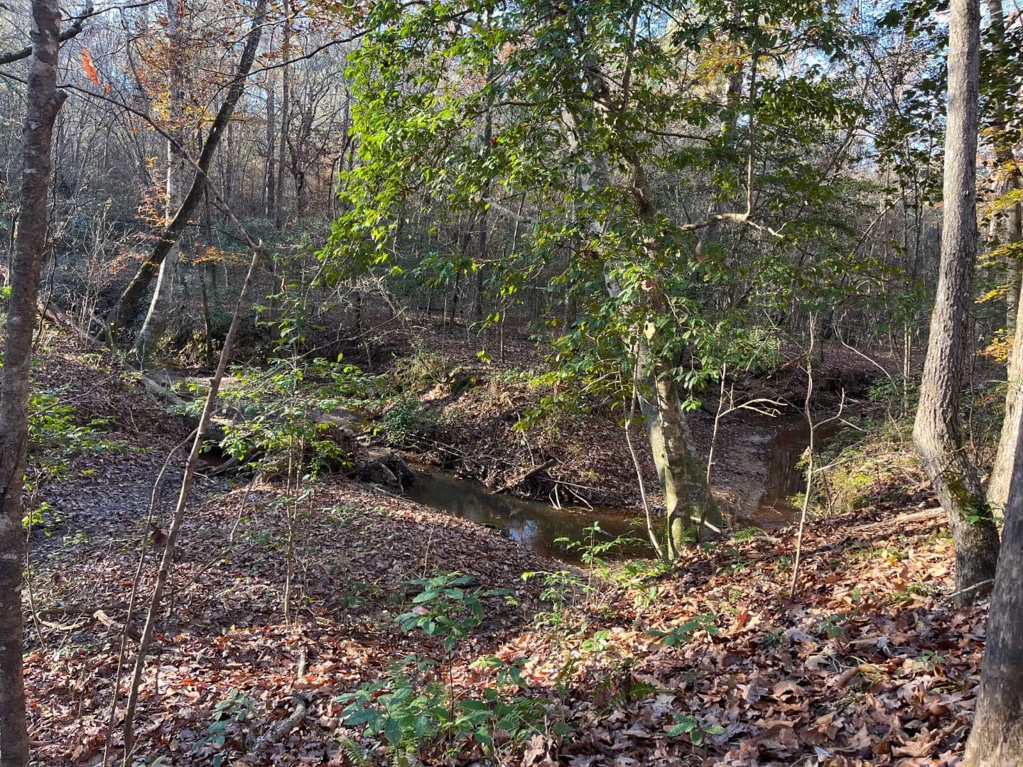 A hardwood creek bottom runs the length of the property from north to south, and the creek holds water year-round. The creek bottom is lined with a healthy stand of upland hardwoods, including plenty of acorn-producing oaks. Most of the pine timber was cut years back, and the tract has filled in with a thick mix of natural regeneration that provides excellent cover.