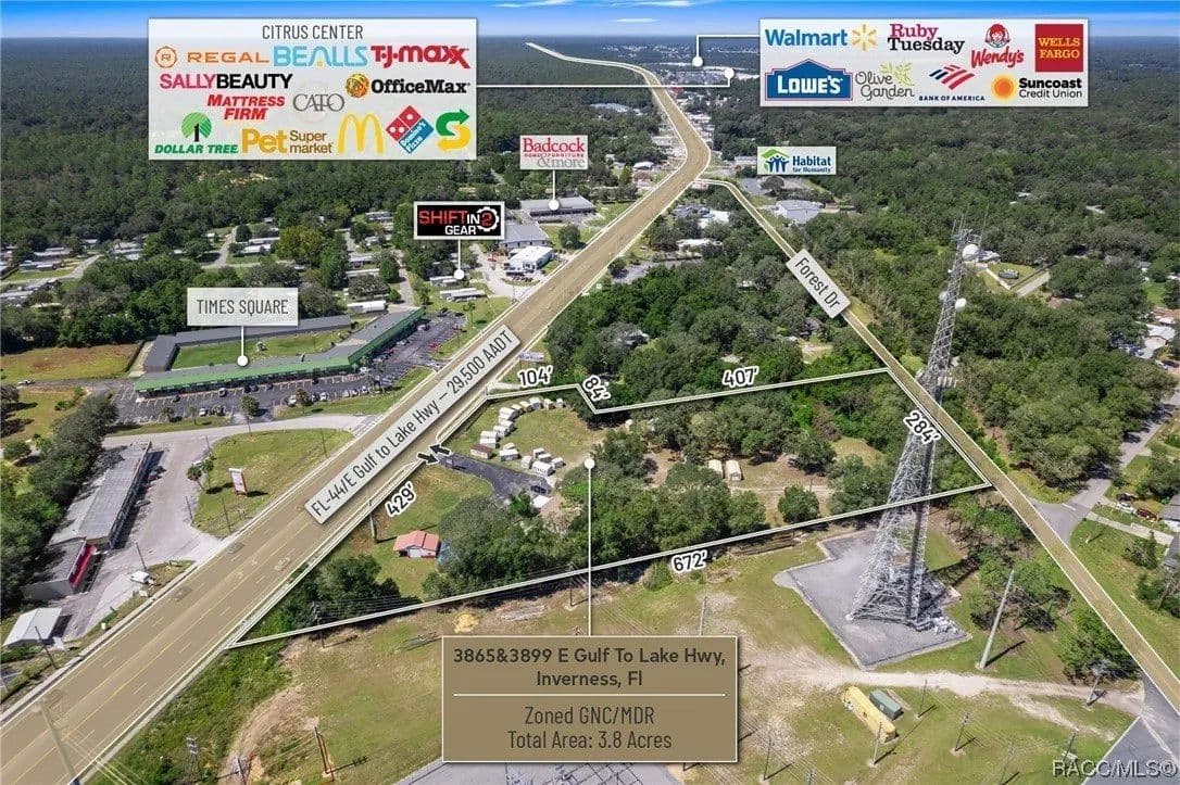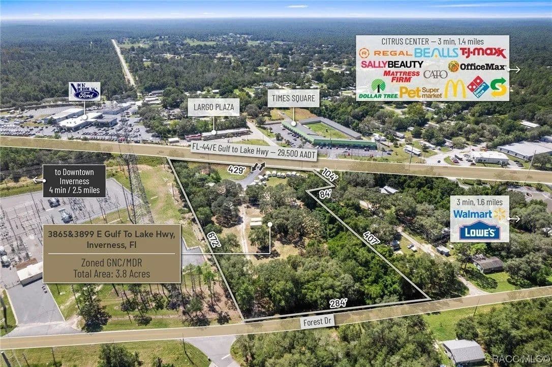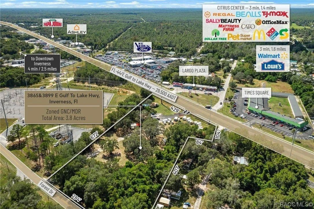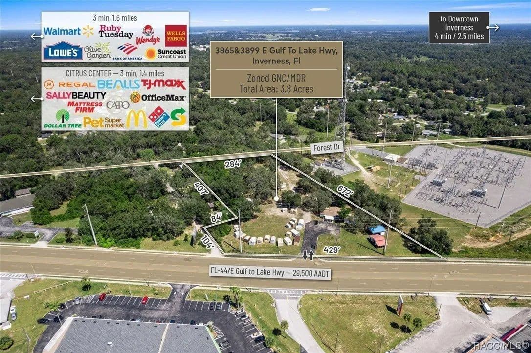 This large and rare 3.8 acres of land zoned GNC Commercial features 429' of Highway frontage on SR 44 (29,500 AADT) just West of the signalized intersection at Independence Hwy. This location offers high visibility and ingress and egress from both East and Westbound traffic via the open median on SR 44 and furthermore street to street access from SR 44 to Forest Drive. Convenience is at your doorstep with this property, as it enjoys proximity to Downtown Inverness (3.6 Miles), Lecanto (7.3 Miles), Hernando (4.2 Miles), and Crystal River (15.1 Miles). In addition, you're just a stone's throw away from Tj Mx (1.3 Miles), Walmart (1.6 Miles), and more national retail. General Commercial Zoning allows for a variety of uses including Retail, Medical/Professional Office, Automotive, ALF, multi-family, C-Store, Banks, Car Wash Facilities, and more. Located in Citrus County, Florida a bustling community of 155,582 residences growing at 1.29% exceeding the national average and part of the Tampa-St. Petersburg MSA offers a promising environment for businesses seeking growth opportunities. Disclaimer: All information provided herein is for marketing purposes only and is not guaranteed for accuracy. Prospective buyers or tenants are encouraged to conduct their own independent due diligence. The seller, broker, and associated parties make no representations or warranties, expressed or implied, as to the accuracy or completeness of this information. All dimensions, zoning details, financial data, and other property-related facts should be independently verified. Please consult with appropriate licensed professionals before making any investment or purchasing decisions.