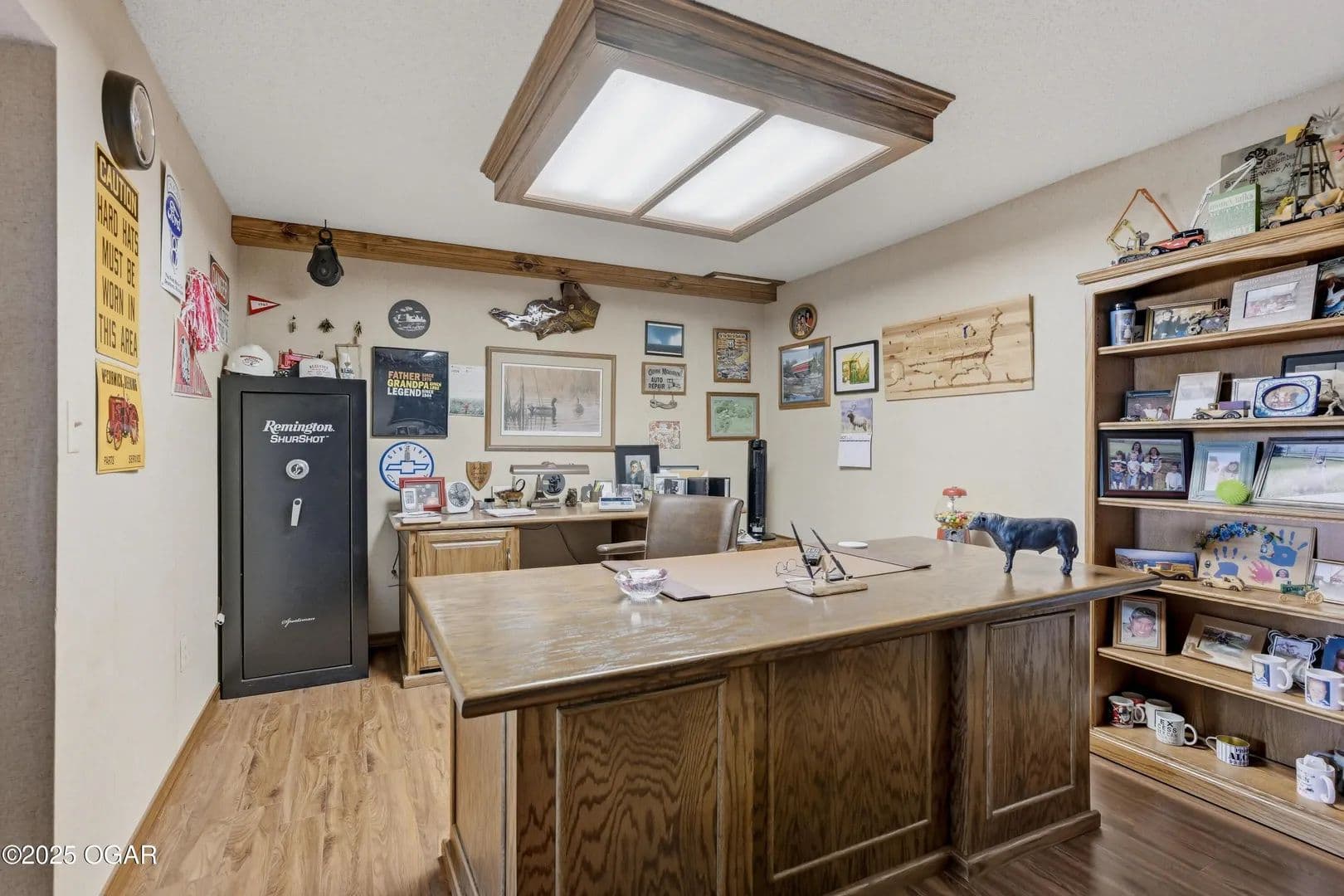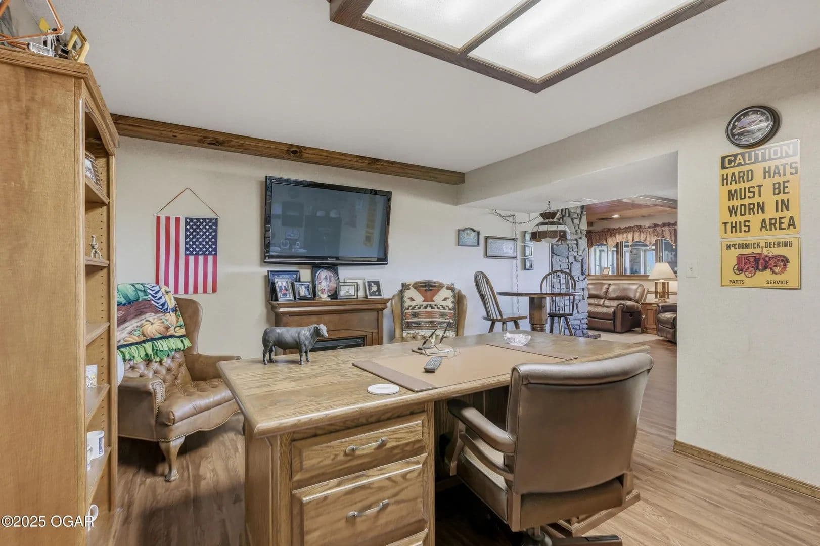 The finished basement offers abundant living space with areas for recreation, a second wood-burning fireplace, a hearth room & bar, an office with half bath, and a second family room surrounded with windows and an electric fireplace. A non-conforming bedroom doubles as a safe room for peace of mind.