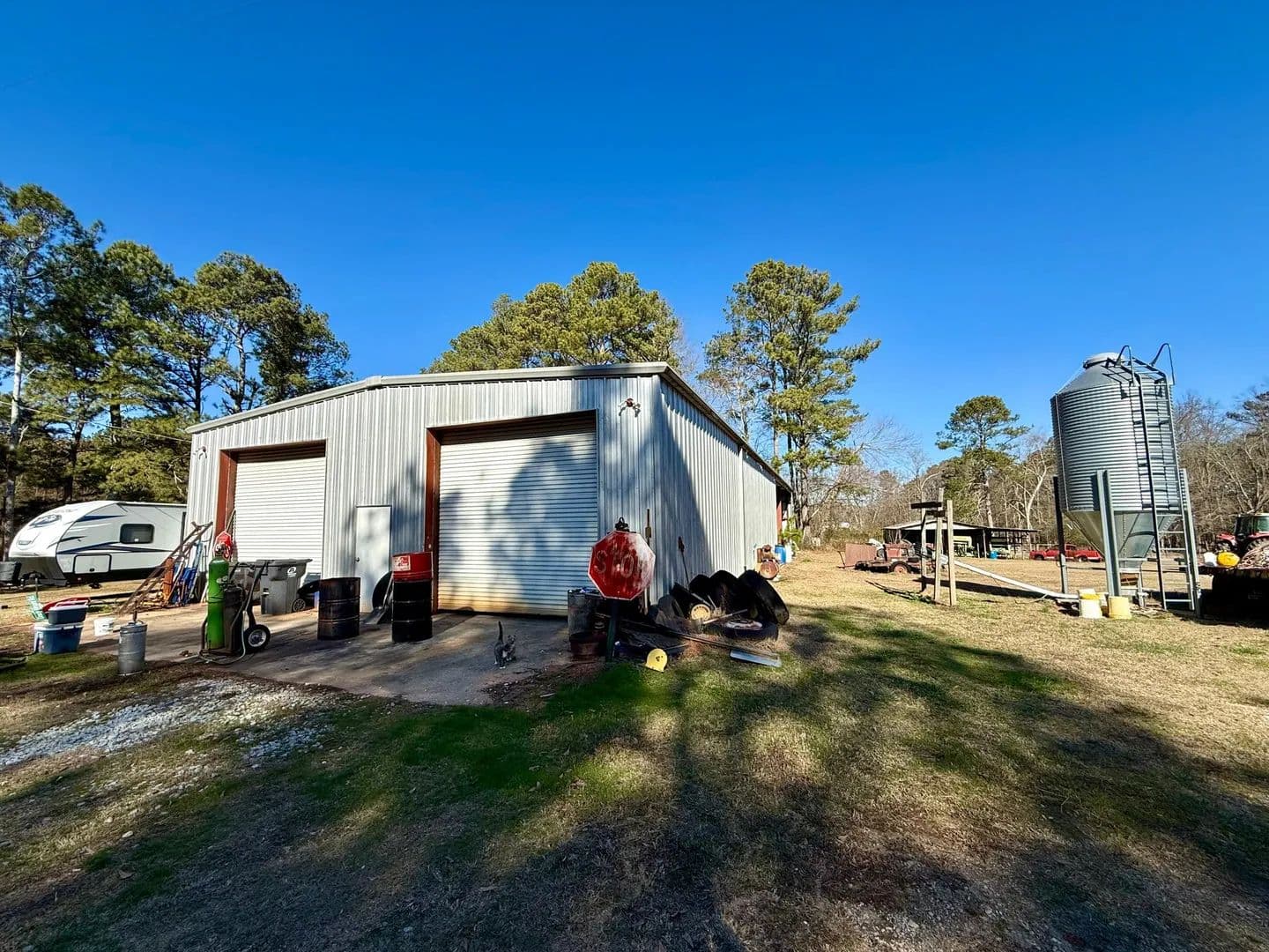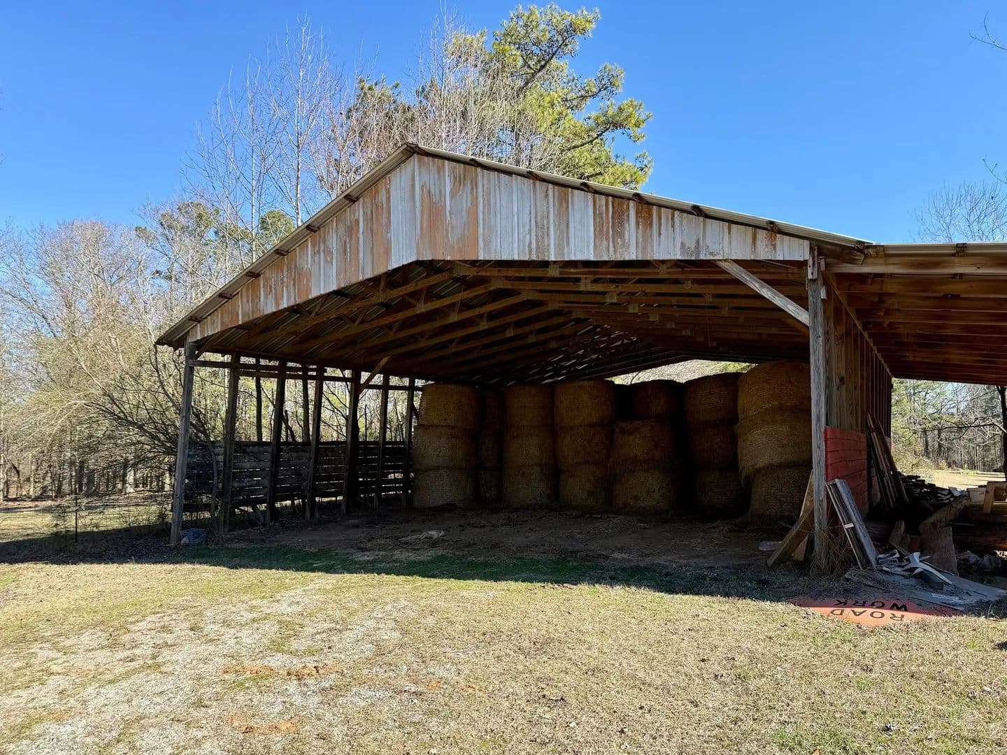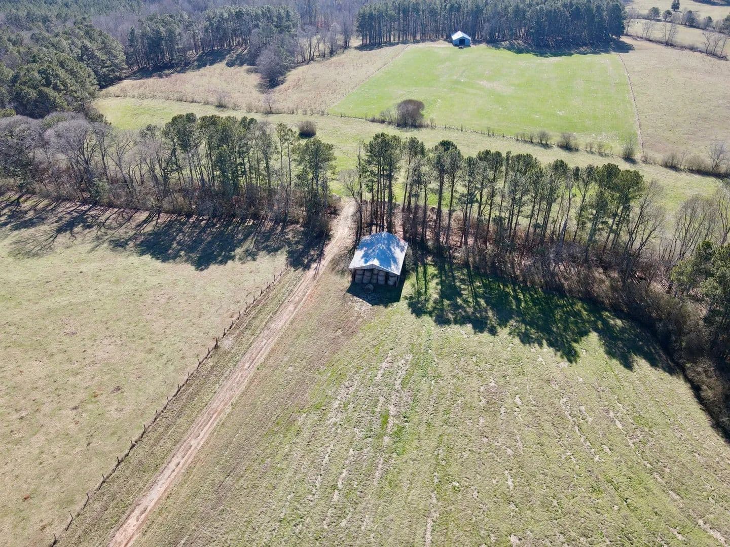 The farm is well improved with several functional outbuildings, including a 36×96 finished shop building, 60×50 pole barn, 36×32 equipment shed, and 36×48 hay barn, offering ample space for equipment storage, hay, and day-to-day farm operations.