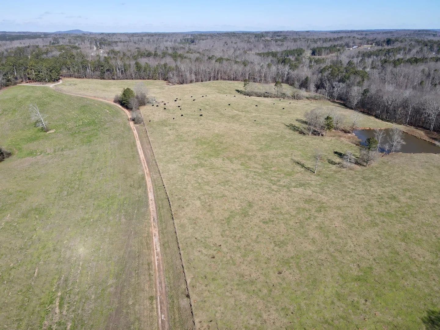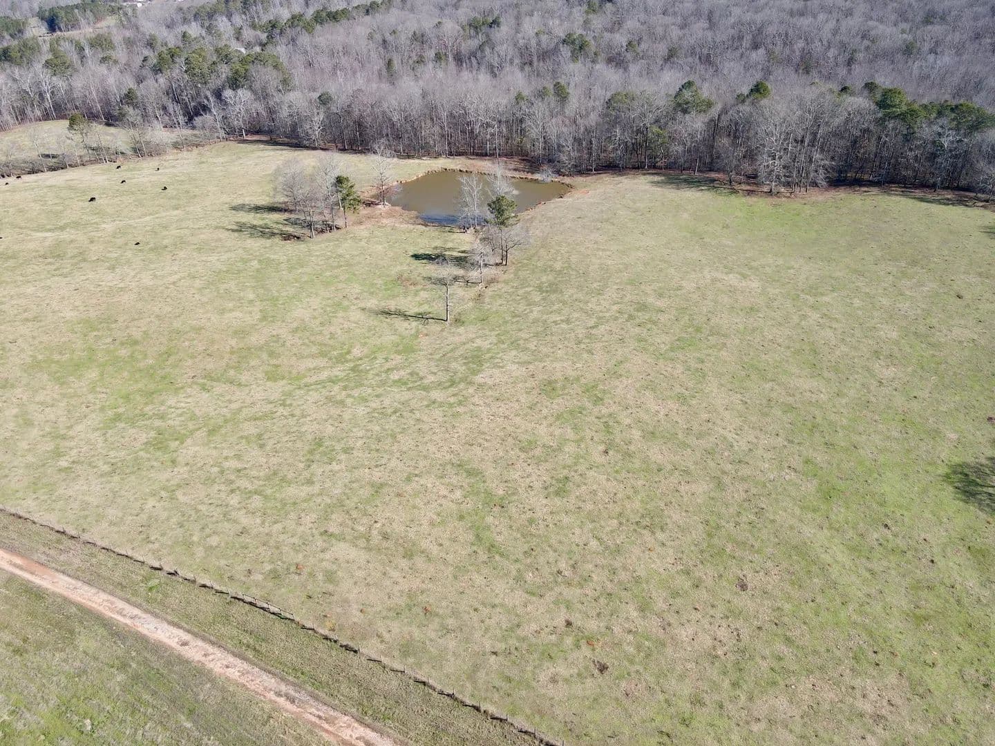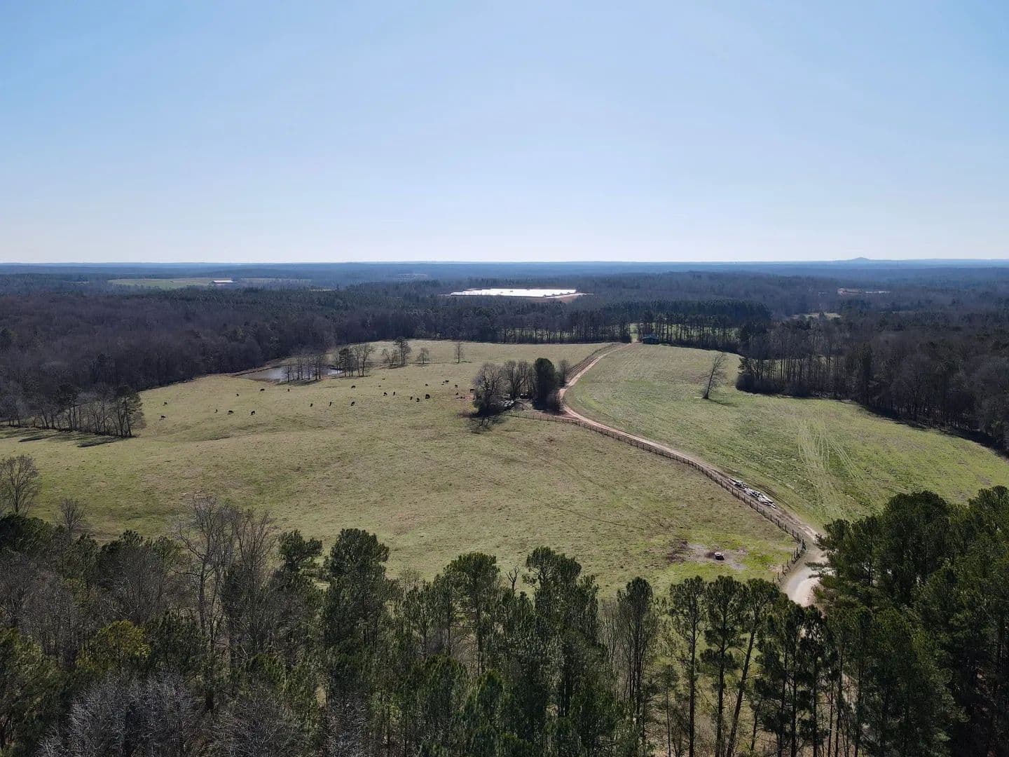 The land is comprised primarily of open pasture, fully fenced and currently used for cattle grazing and hay production. The pasture lays well and has been well maintained, supporting efficient livestock management. A large lake is located on the property, providing a reliable water source for cattle as well as scenic appeal.