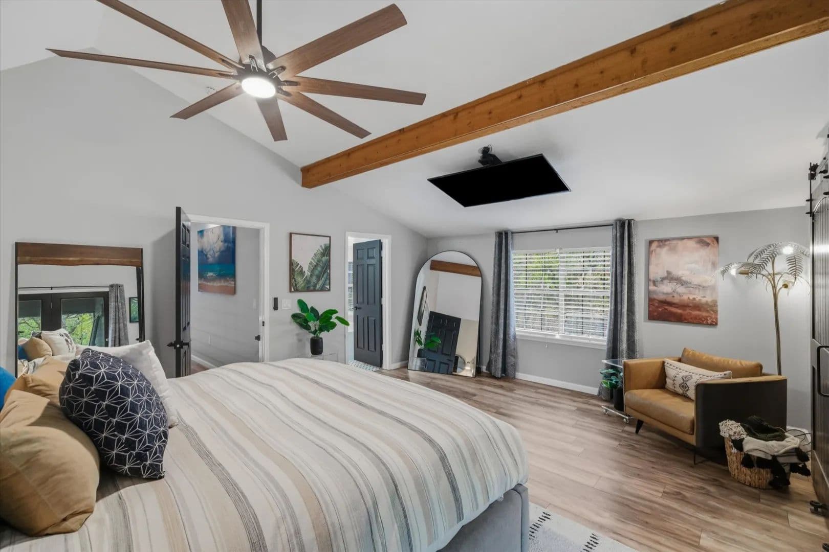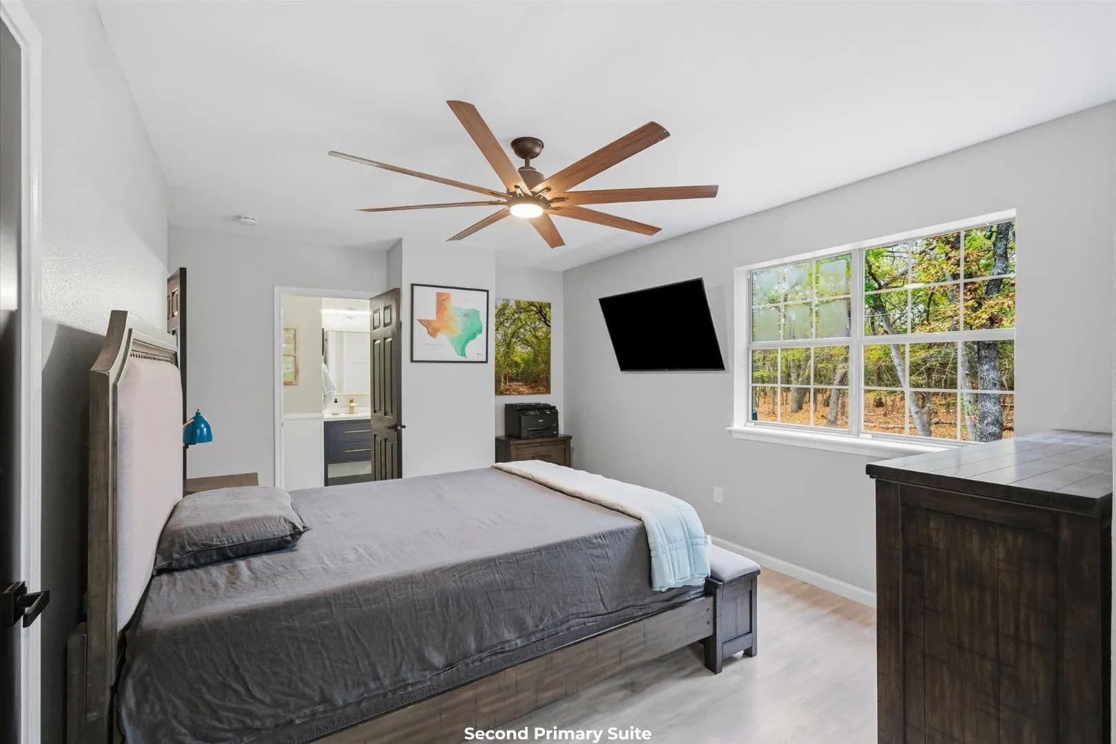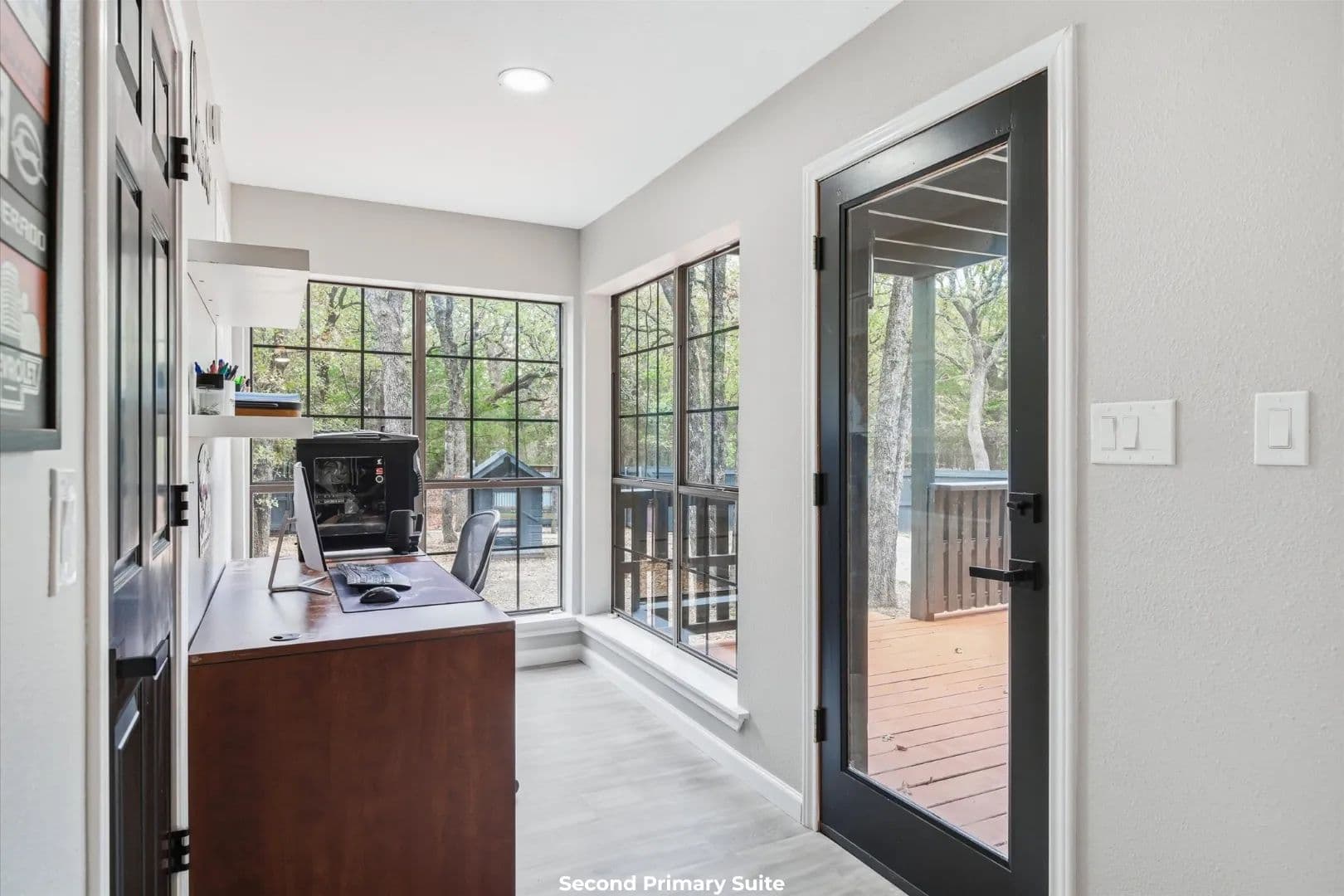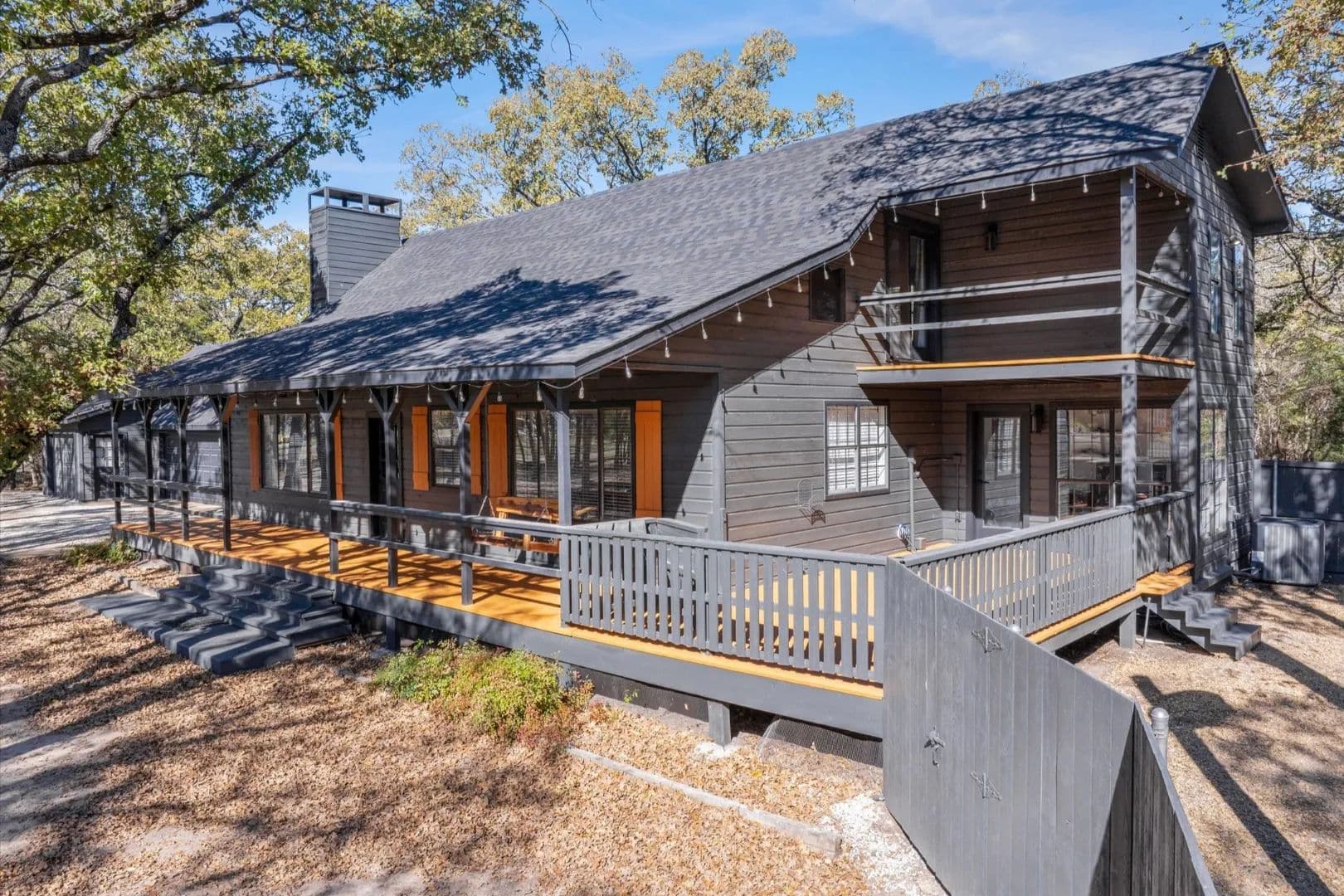 Surrounded by mature trees, private walking trails, and peaceful East Texas scenery, this beautifully remodeled home in Poetry, Texas delivers a lifestyle few properties can offer. Nestled deep in the woods within a highly sought after area, this home blends privacy, character, and modern comfort with thoughtful upgrades throughout. Bold cedar plank siding, recently replaced roof & HVAC with duct work, whole home water filtration and softener system, monitored wireless alarm, and oversized front and back decks create a striking first impression and invite outdoor living year round. Inside, soaring vaulted ceilings with exposed wood beams, modern railings, and expansive windows flood the home with natural light and showcase the surrounding wooded views. Main living area is anchored by a cozy fireplace and flows seamlessly into the kitchen and dining space, creating an inviting layout ideal for everyday living and entertaining. Kitchen features granite, SS appliances, a pantry, and generous workspace designed for functionality and style. Home offers 2 spacious primary suites, each with large closets & private ensuite baths. One primary includes a dedicated office or nursery with oversized windows, providing a quiet and inspiring space for working from home or creative use. 2nd primary suite serves as a private retreat with dramatic ceilings, wood beam accents, and direct access to the outdoors. Upstairs loft style living area overlooks the main living room with soaring ceilings, offering