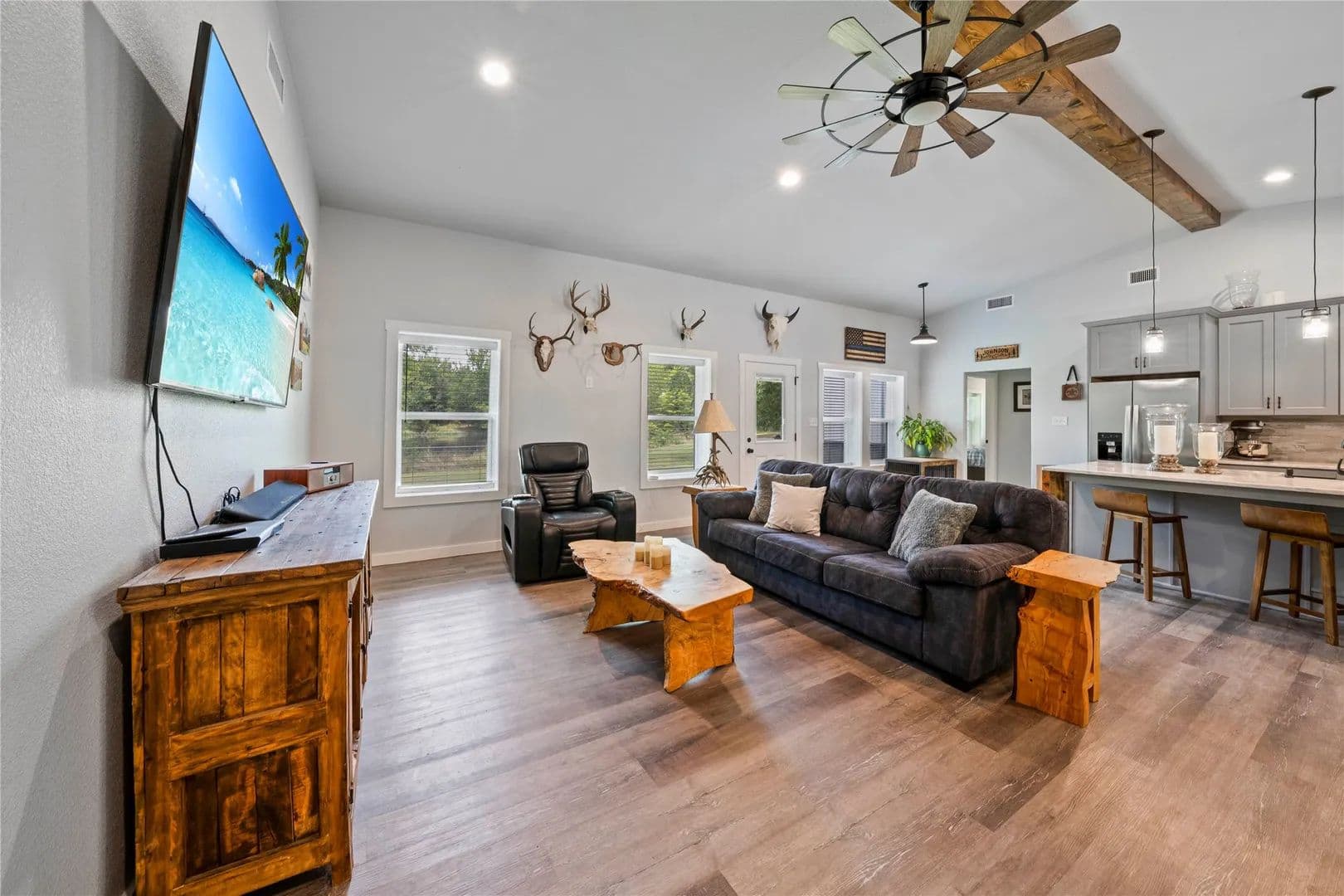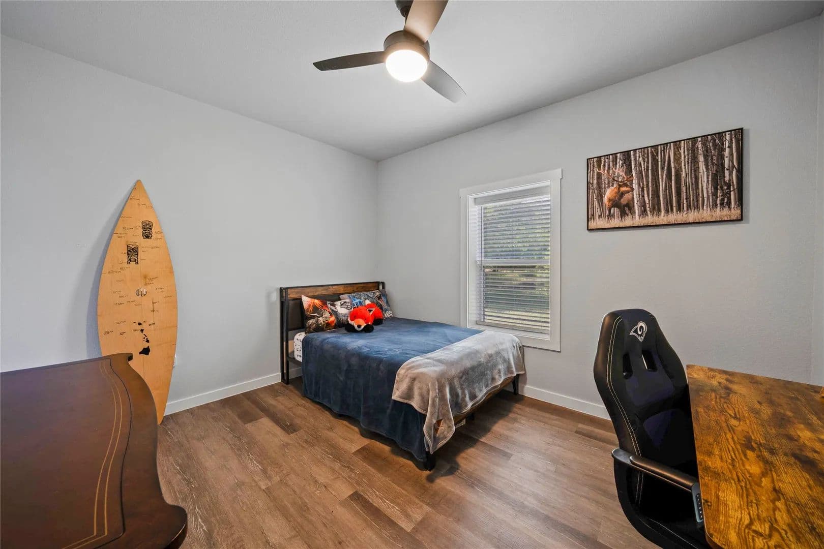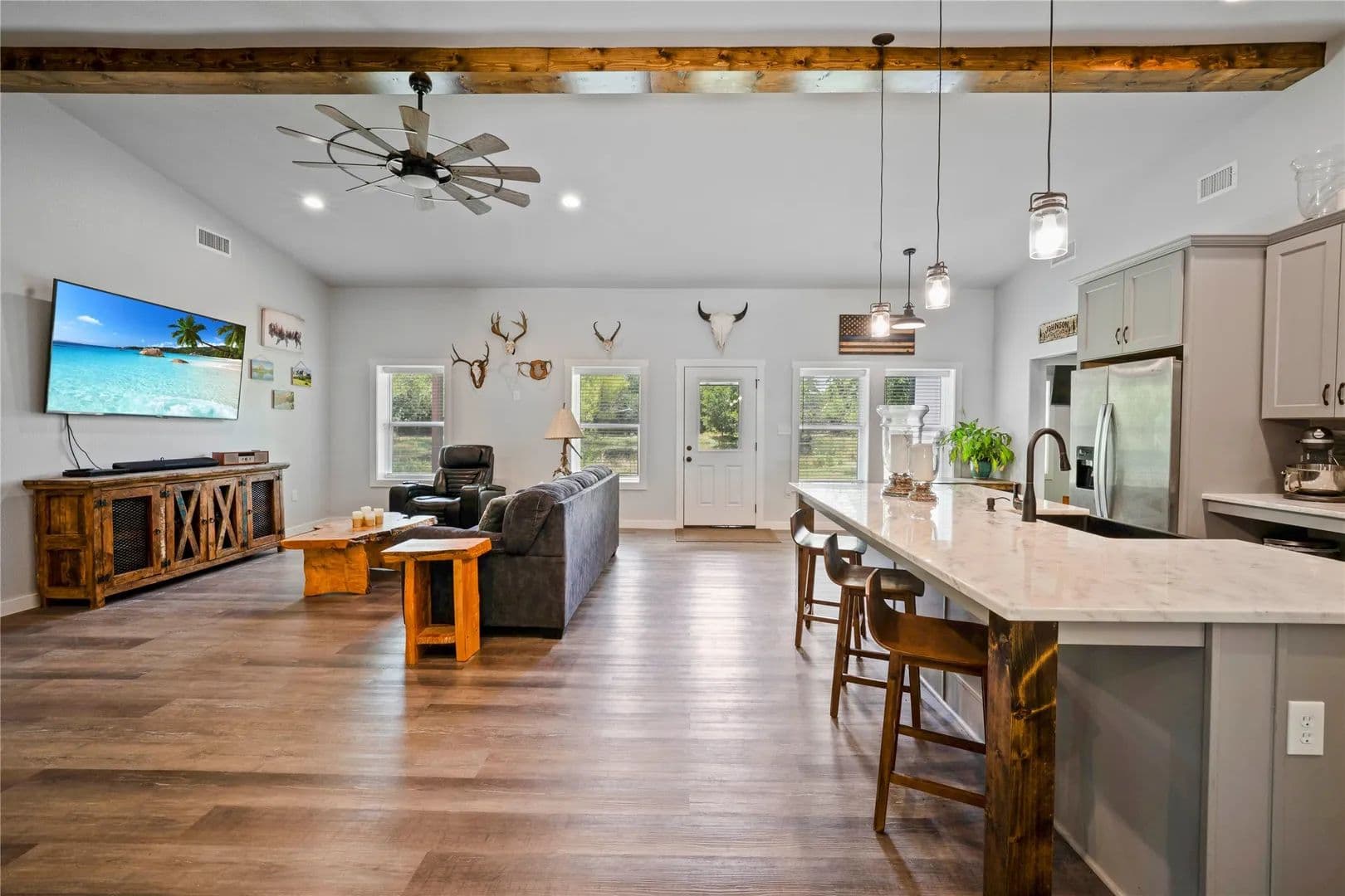 Completed in April 2024, the main residence, nearly 1,000 sq ft shop, and fully-equipped ADU are move-in ready and designed with versatility in mind. The main home features 3 spacious bedrooms, 2 full bathrooms, a dedicated office at the front of the home, and a flexible bonus room that can easily serve as a formal dining room, media space, or additional living area. The open-concept living area is flooded with natural light and centers around a show-stopping kitchen with a large island, sleek quartz countertops, and abundant storage—perfect for everyday living and entertaining alike. The private primary suite is thoughtfully situated in its own wing and features a spa-like ensuite bath and a generous walk-in closet.The fully finished ADU includes a bedroom, bathroom, and kitchen, making it ideal for multigenerational living, guests, or potential income as a rental. Outside, a peaceful pond enhances the tranquil setting, while the expansive shop offers space for hobbies, storage, or even a home-based business. The property is also equipped with three fiber internet lines, making it well-suited for remote work or streaming.