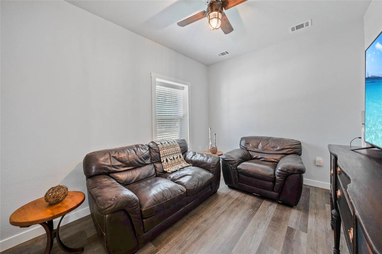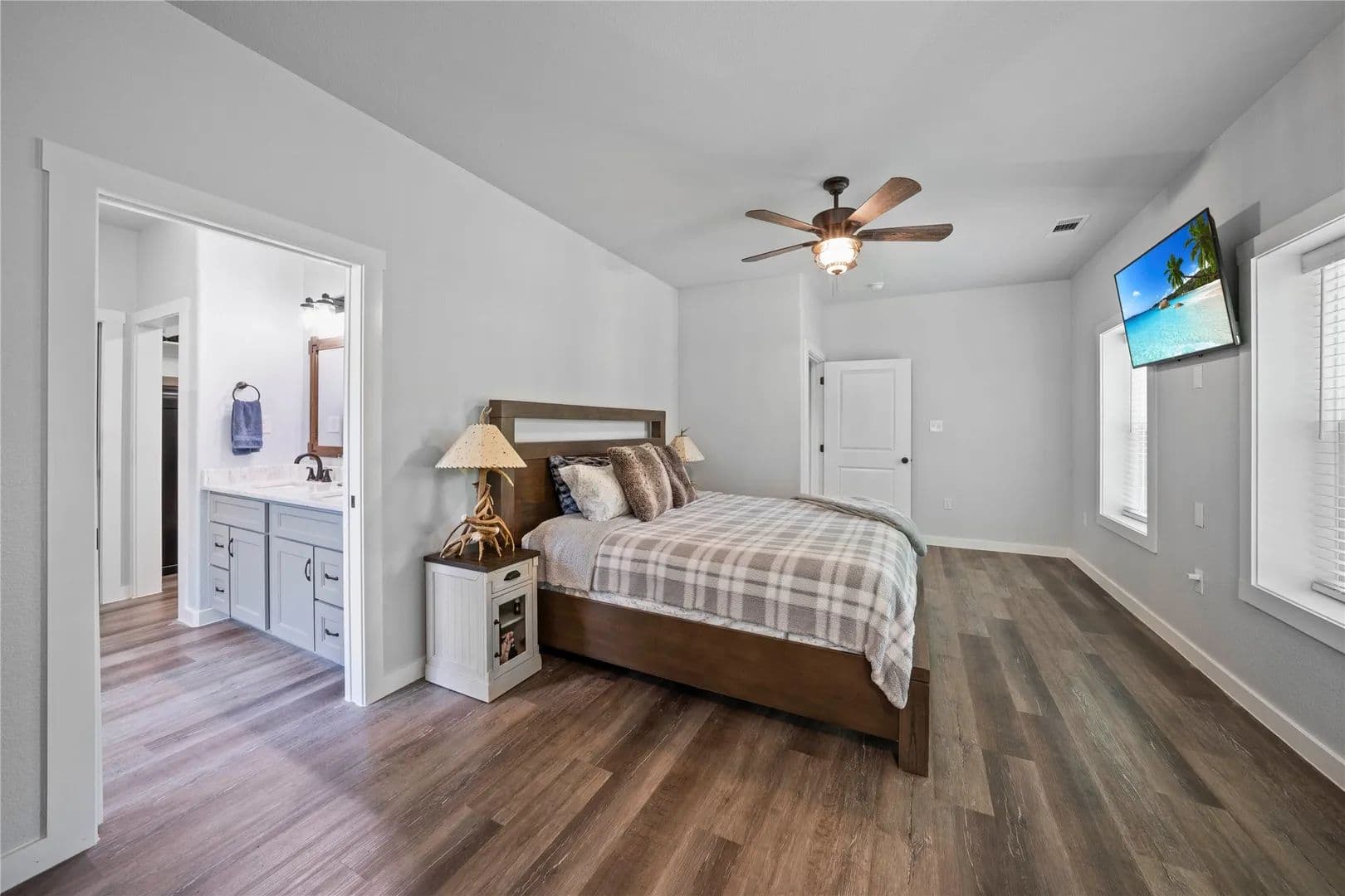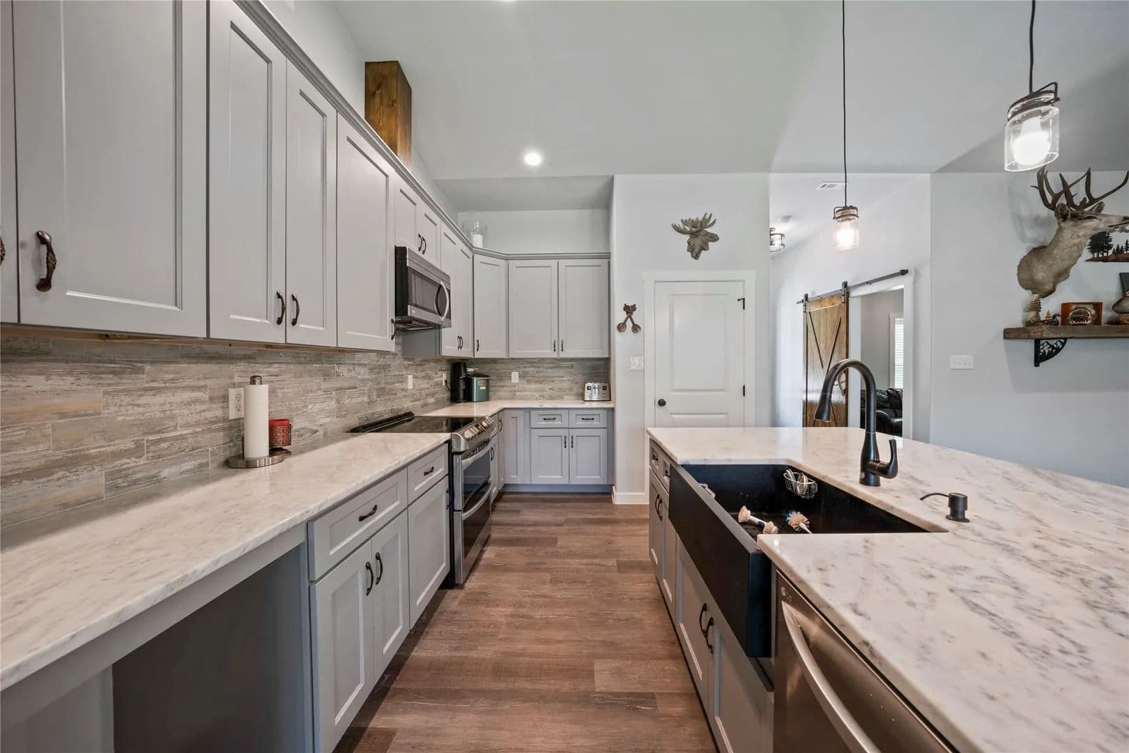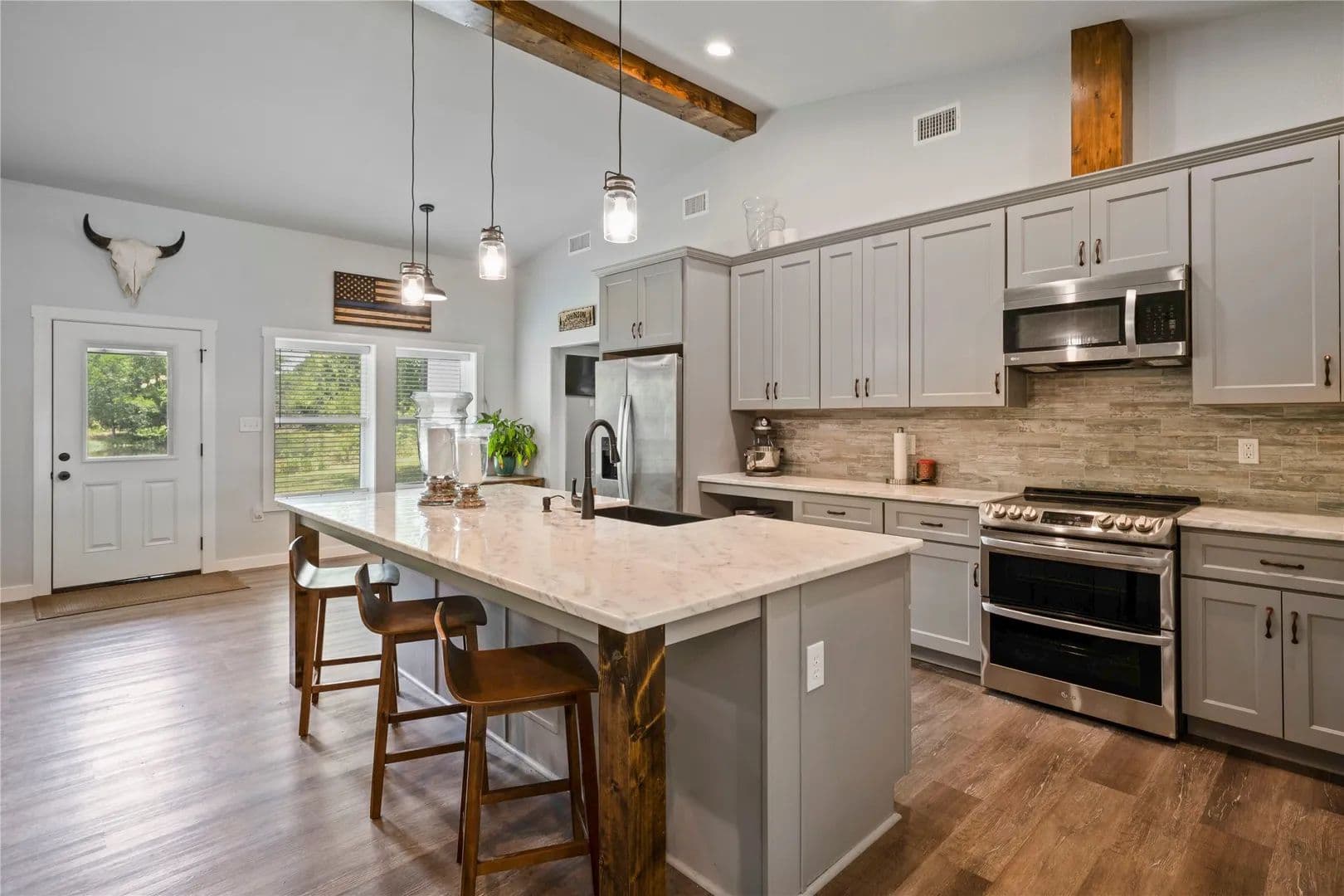 Completed in April 2024, the main residence, nearly 1,000 sq ft shop, and fully-equipped ADU are move-in ready and designed with versatility in mind. The main home features 3 spacious bedrooms, 2 full bathrooms, a dedicated office at the front of the home, and a flexible bonus room that can easily serve as a formal dining room, media space, or additional living area. The open-concept living area is flooded with natural light and centers around a show-stopping kitchen with a large island, sleek quartz countertops, and abundant storage—perfect for everyday living and entertaining alike. The private primary suite is thoughtfully situated in its own wing and features a spa-like ensuite bath and a generous walk-in closet.The fully finished ADU includes a bedroom, bathroom, and kitchen, making it ideal for multigenerational living, guests, or potential income as a rental. Outside, a peaceful pond enhances the tranquil setting, while the expansive shop offers space for hobbies, storage, or even a home-based business. The property is also equipped with three fiber internet lines, making it well-suited for remote work or streaming.