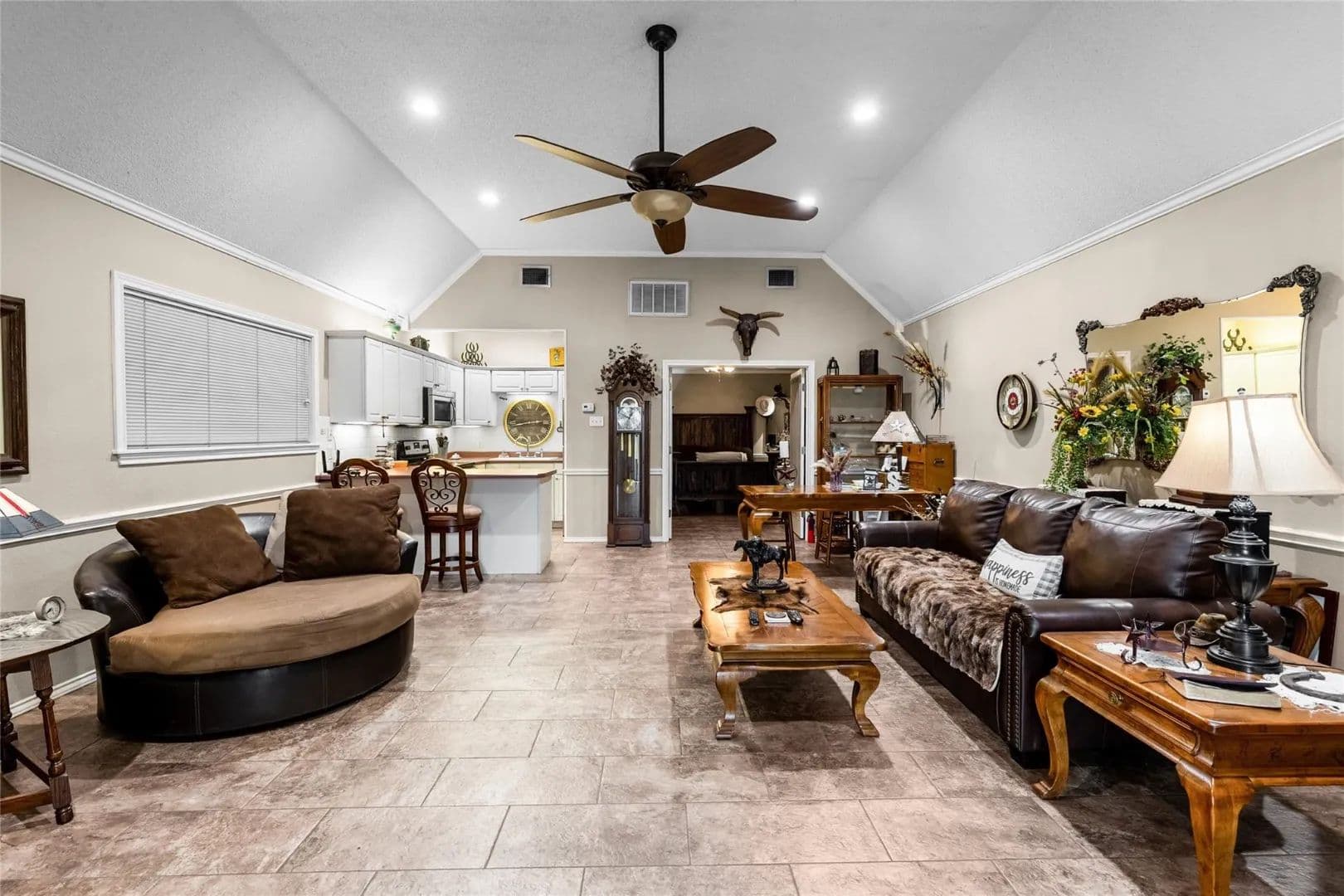 For guests, you'll find a workshop with an apartment that includes a kitchen, living room, and bedroom with bathroom. For those big gatherings, the workshop has an additional full kitchen and large bay area, adding versatility for parties, a hobby area, workshop, or flex space.