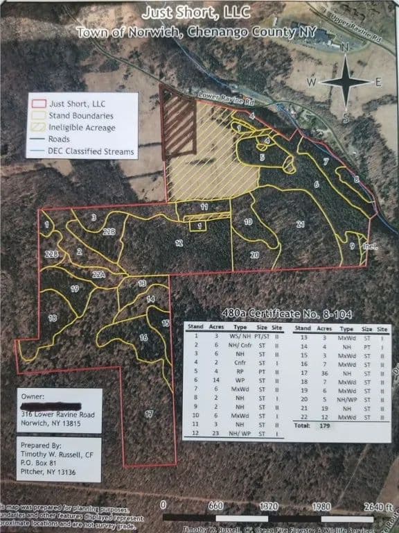 Hunting and recreational dream property - unique opportunity to purchase 211.33 acres in beautiful Chenango County. Diverse mix of hardwood(maple,cherry, birch, oak) and pine, as well as a beautiful open hillside offering great views of the surrounding landscape. Wildlife abounds on this hunting paradise with excellent deer and turkey results as well as a 1,620 feet of frontage along Gilmoure Brook for additional recreational opportunities. Property also features fantastic hillside and panoramic views as well as a producing spring on the open field. 179 acres managed thru the NYS 480a Forestry Management Program - in addition to the potential for ongoing income thru the forestry program, the property offers significantly reduced annual property tax obligations giving the opportunity to own in excess of 200 acres at a low annual cost basis. If searching for large parcels with diverse opportunities for recreation and future income potential through periodic timber harvesting, please consider the long-term investment return and low property taxes offered through the 480a program. Please copy the link below to your browser for more information on the 480a program: https://www.dec.ny.gov/lands/5236.html . Less than one mile to State Hwy 12 and the amenities of the charming small-town community of Norwich, NY.