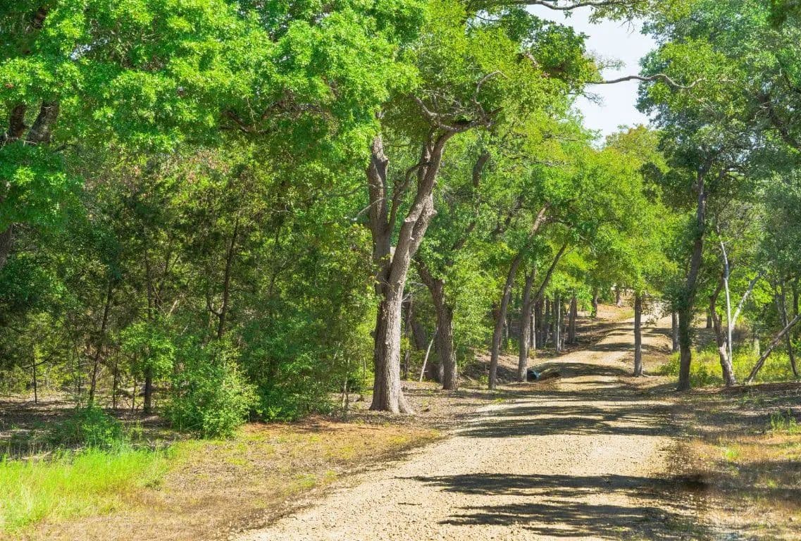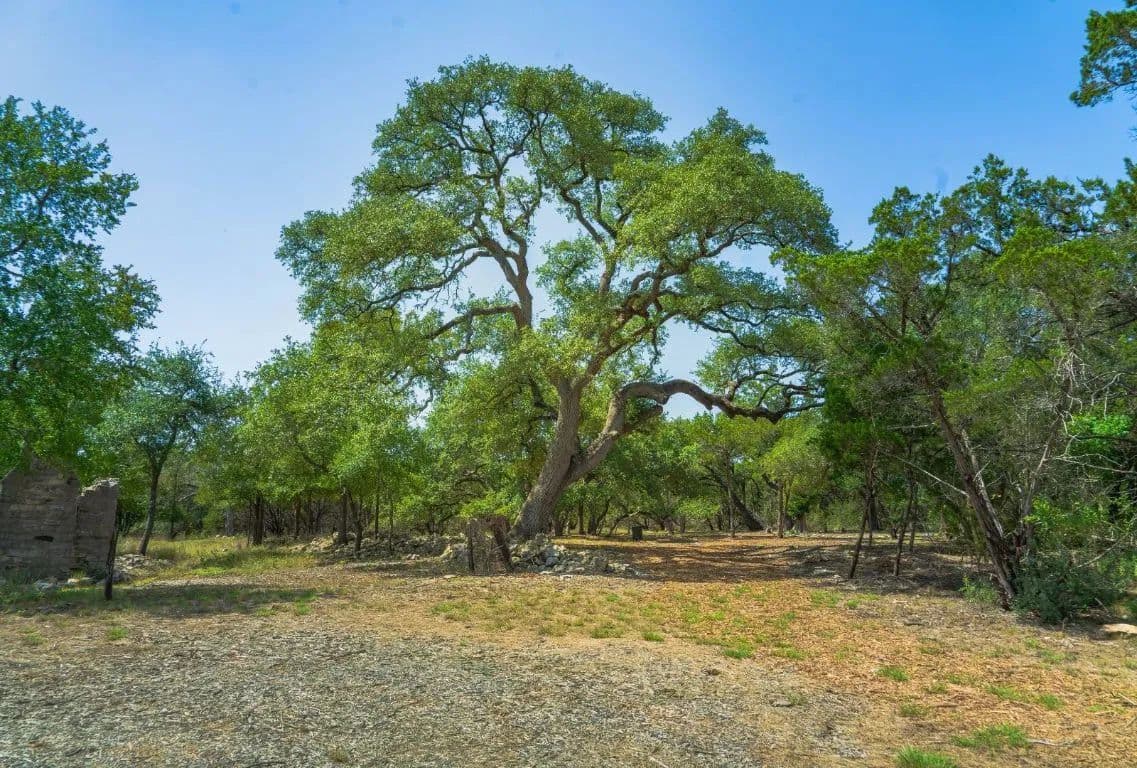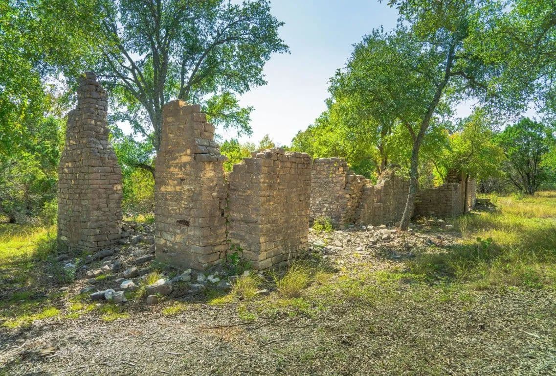 This private 15-acre estate features large live oaks and fascinating 19th-century ruins. The current owners have strategically cleared a potential build site, constructed an entryway, and built a 1/3 mile road. Optional plans for a luxury home are also available. The property offers abundant wildlife, complete privacy at the end of a dead-end road, and no through traffic in the entire neighborhood.