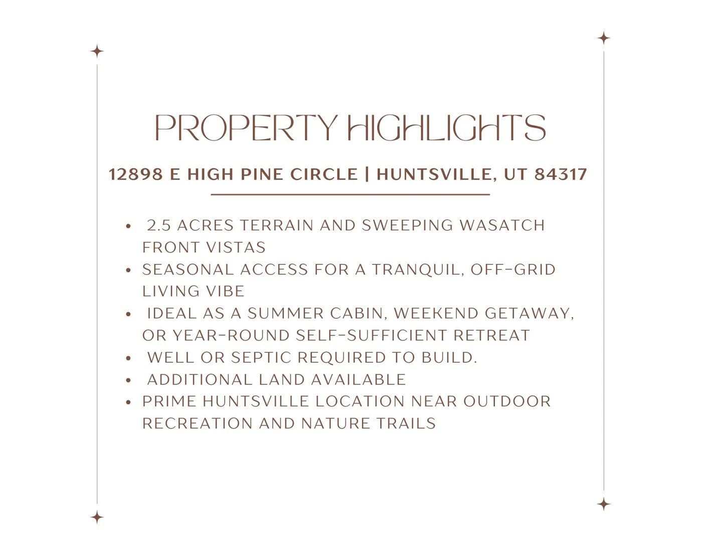 Escape to your private mountain sanctuary on a 2.5-acre parcel perched on the back side of the Wasatch Front in the Evergreen Area of Huntsville. This elevated lot delivers dramatic, unobstructed views across the valley to the surrounding peaks, making every sunset a postcard moment. Seasonal access ensures a peaceful, off-grid vibe— weekend basecamp, or a self-sufficient retreat you can enjoy year after year. Roads are not paved or maintained in this area. Cell coverage is spotty. Build the retreat you’ve envisioned. If you’re seeking more space, additional land is available. TAX ID: 23-024-0017 Offered at $74,000. Google map the lot location before you go. (2.5 miles up Evergreen Park Dr take left on High Pine then may your way down to the lot. Sign on property. Sloped lot, will need excavation. At this price a fantastic buy and hold.