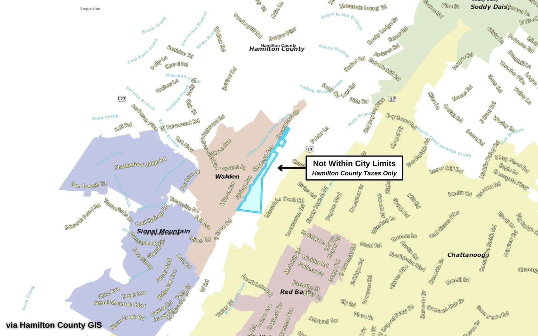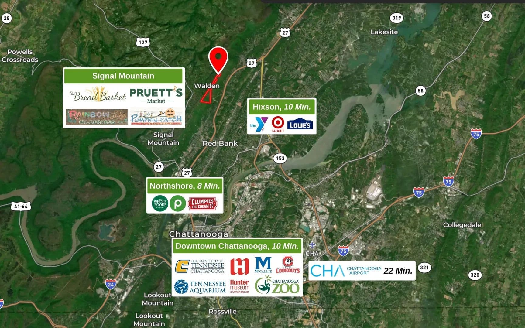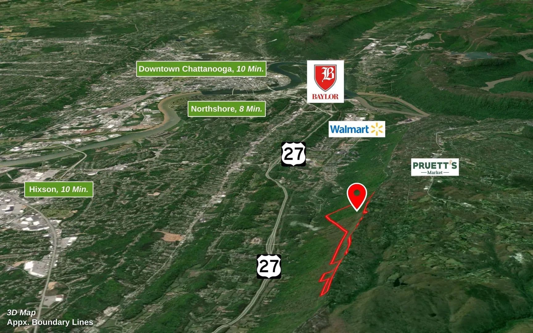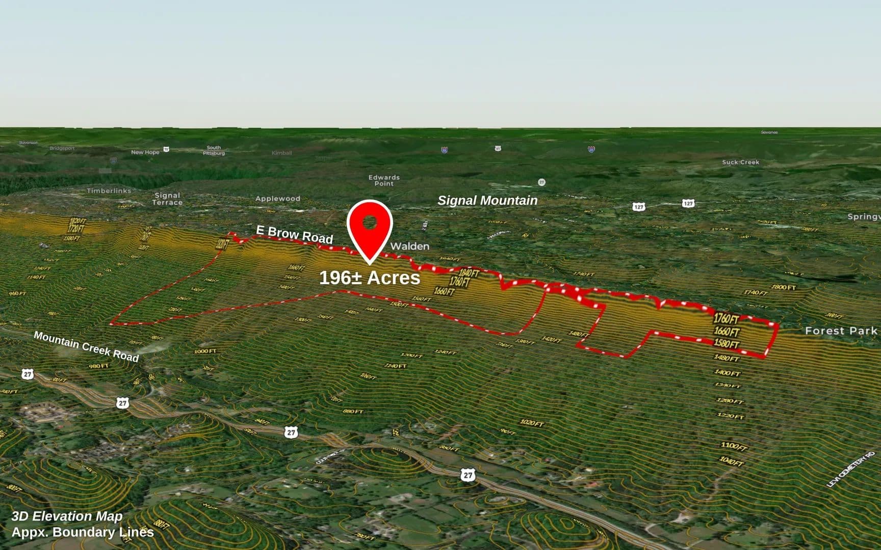 Access on Mountain Creek Road via a recently recorded easement. Additional 3,500+/- feet along E. Brow Road. Privacy and prime convenience are found here: 2 minutes to Highway 27 (Corridor J), 10 minutes to Baylor School, 10 minutes to Northshore, and 12 minutes to Downtown Chattanooga. With county taxes only and no state income tax in Tennessee, this property offers both financial and lifestyle benefits. Whether you choose to develop a handful of exclusive homes, preserve the land, or create a recreational paradise, the 196.98± acres offer versatile potential that's nearly impossible to replicate.