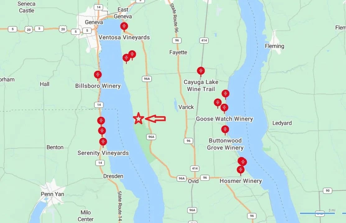 Other nearby destinations include Geneva, Seneca Falls, Watkins Glen, Ithaca, and Hector.