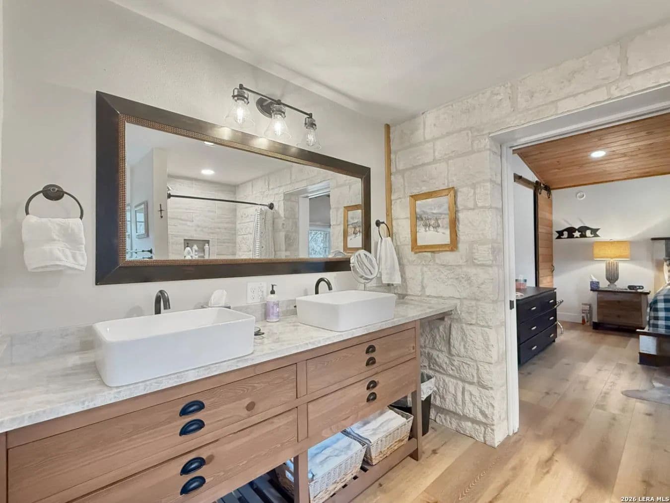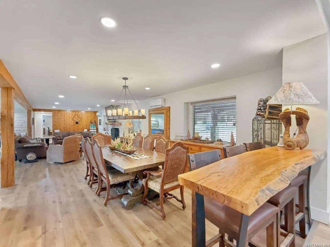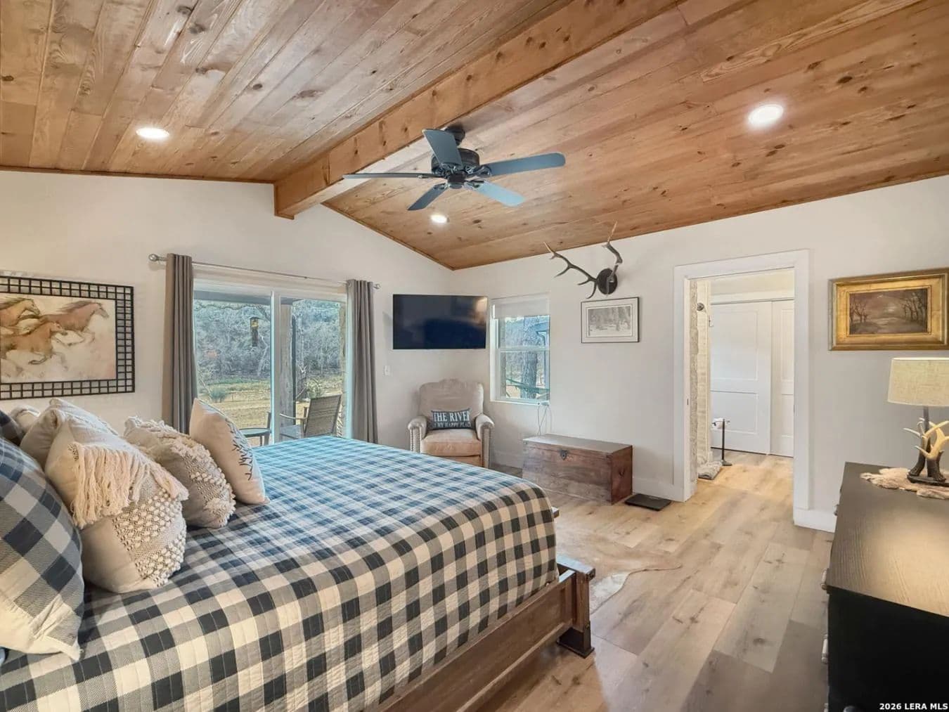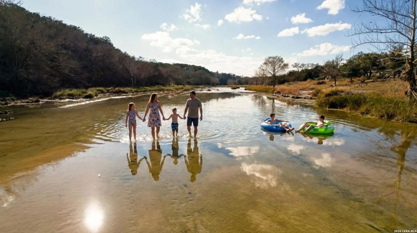 Your Own Private Stretch of the Guadalupe Tucked behind a custom iron ranch gate on Rock Bottom Road, this extensively renovated Hill Country retreat delivers the rare combination of riverfront living, generous acreage, and a home built to gather - whether that means family weekends, corporate retreats, or a thriving short-term rental operation. Neighboring the legendary MO Ranch and framed by an 80-foot limestone bluff rising from the North Fork of the Guadalupe River, this is the kind of property people drive the Hill Country hoping to find. The main residence is a two-story, stone-and-metal-roof home that was taken down to the studs and thoughtfully rebuilt in 2020 with modern infrastructure - new PEX plumbing, mini-split HVAC throughout, and LED lighting - while preserving the authentic Texas character that makes it special. Wood paneling in the great room wall with historic cattle ranch brands, a floor-to-ceiling limestone fireplace, live-edge bar tops, and hand-selected western furnishings give the interiors a warmth and identity that no new build can replicate. The open-concept kitchen, dining, and living area is designed for large groups. A massive quartzite-topped island anchors the kitchen, surrounded by white shaker cabinetry, subway tile backsplash, open wood shelving, and stainless appliances. The adjacent dining room seats ten comfortably at a trestle table, with additional bar seating at a stunning live-edge pecan slab counter. Beyond, the great room offers plush seating around the stone fireplace with a mounted TV with sound sound and wood mantel - the perfect spot after a day on the river. Step through 16' sliding glass doors to discover the property's true magic: a sweeping backyard that rolls gently down to your own stretch of the Guadalupe. A concrete patio with Adirondack chairs surrounds a steel fire pit, and a timber-frame pavilion houses an outdoor kitchen with multiple grills, ceiling fans, and room to host a proper Texas barbecue. Views from here take in the river bottom, the dramatic rock bluff across the water, and nothing but open sky and Hill Country canopy beyond. The home sleeps 16 as configured, with the potential to accommodate 24. The master suite features vaulted wood-plank ceilings, a king bed, sliding door access to a private deck, a leather recliner, and a spa-style bath with dual vessel sinks on a cypress wood vanity set against an interior limestone wall. A second king bedroom offers similarly refined finishes with its own patio access. The expansive upstairs bunk room - with multiple bunk beds, a full bed, a daybed, and an adjoining game room - is a dream for families or groups. The game room delivers with a pool table, foosball, shuffleboard, mounted deer, shiplap walls, and its own sitting area. A nine-person hot tub, purchased in 2021 and regularly serviced, rounds out the entertainment offerings. Additional spaces include a western-themed sitting room with Hill Country art and a horse saddle display, a secondary living area with sectional sofa, a coffee bar nook, and a charming powder room with a reclaimed cypress wood longhorn vanity and hammered copper sink. Every bathroom has been updated with tile showers, quality fixtures, and thoughtful details. The property spans multiple parcels along Rock Bottom Road with mature live oak groves, wildlife feeders, and a covered chuck wagon near the river - a nod to the ranching heritage of the area. A well with UV filtration system and 3, 000-gallon storage tank ensures reliable water. A storage shed and ample parking handle the practical side of hosting. Located minutes from Hunt, Ingram, and Kerrville, you're close to wineries, outfitters, and the vibrant culture of the Hill Country - yet behind that ranch gate, you could be a hundred miles from anywhere. Whether you're seeking a legacy family compound, a turnkey vacation rental, or simply a place where the river is your backyard and the stars are your ceiling, Rock Bottom delivers.