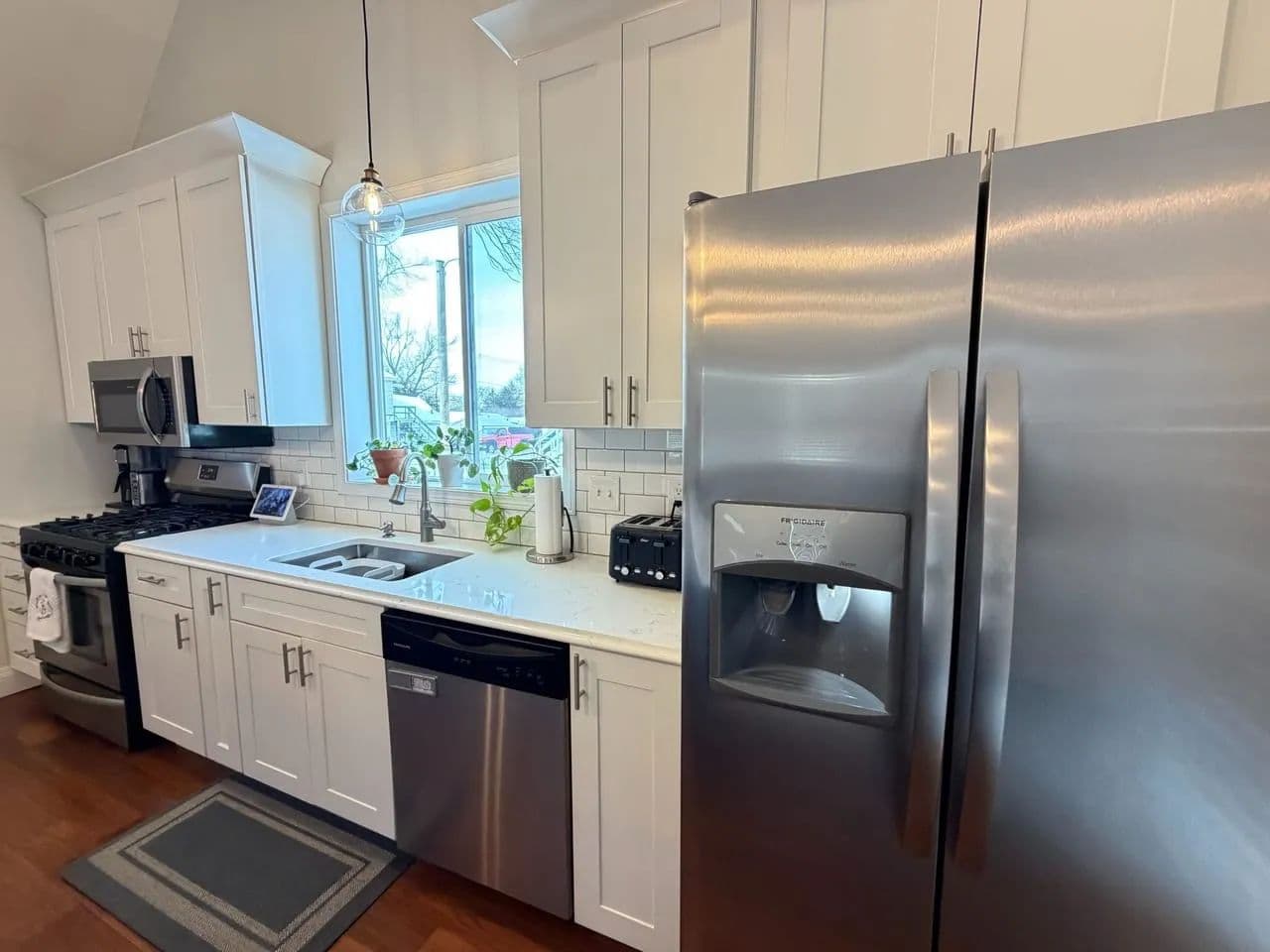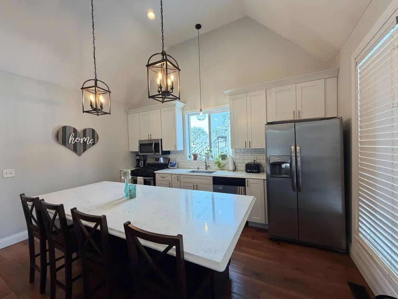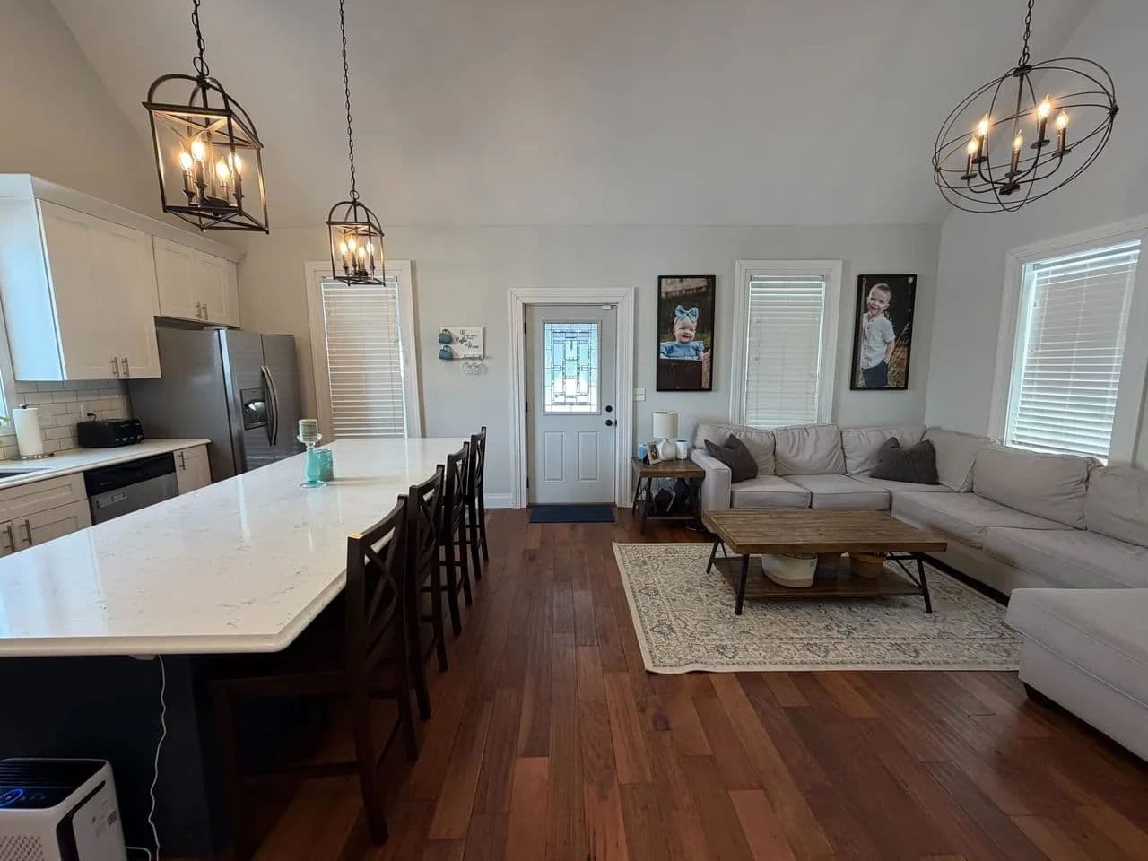 Welcome to this beautifully transformed residence, completely remodeled in 2018 with meticulous attention to detail. During the renovation, most everything was updated like wiring, plumbing, drywall, trim, doors, flooring, and energy-efficient replacement windows throughout. Step onto the inviting covered front porch, the perfect spot for morning coffee and enter into the beautifully vaulted-ceiling great room that flows seamlessly with the kitchen. The spacious island serves as the heart of the home, ideal for entertaining or casual meals. The kitchen boasts tall cabinetry, solid quartz countertops, updated lighting, and a convenient walk-in pantry for ample storage. Pretty laminated wood flooring runs throughout the main living areas, creating warmth and easy maintenance, while carpeting adds comfort to all bedrooms. This thoughtfully designed home offers 4 bedrooms total. 2 on the main floor, including a luxurious primary suite featuring an en-suite bathroom with a tiled walk-in shower, double vanity, and a walk-in closet. Two additional bedrooms upstairs that share a full bathroom with dual single vanities and tub shower unit. A private laundry room on main floor (keeping everyday clutter out of sight) and a partially secluded back porch accessed from the main level. Your semiprivate oasis for relaxing evenings. The attached garage connects at the rear and opens directly into the fully fenced backyard. Enjoy the 2-car width asphalt driveway installed just last year, plus a handy storage shed that conveys with the property. Furnaces for upstairs and downstairs creating zone-controlled temperature. Main floor furnace was replaced last year This home combines modern upgrades, functional layout, and charming outdoor spaces - ready for you to move in and make it your own. Don't miss this rare find in town with its great location, close to the park, walking trail and schools.