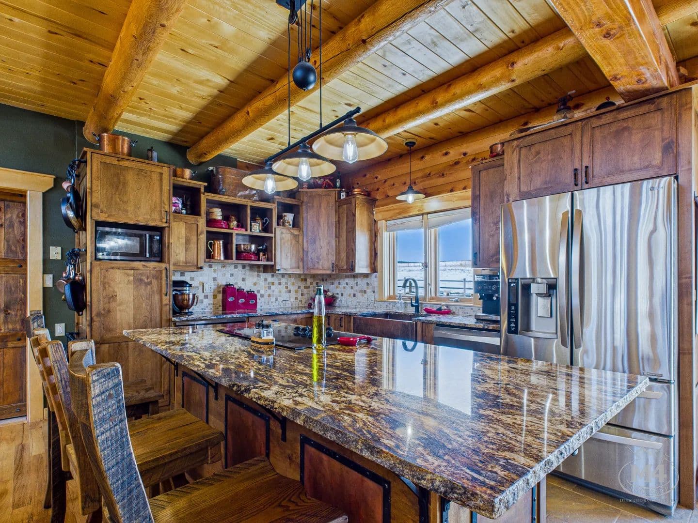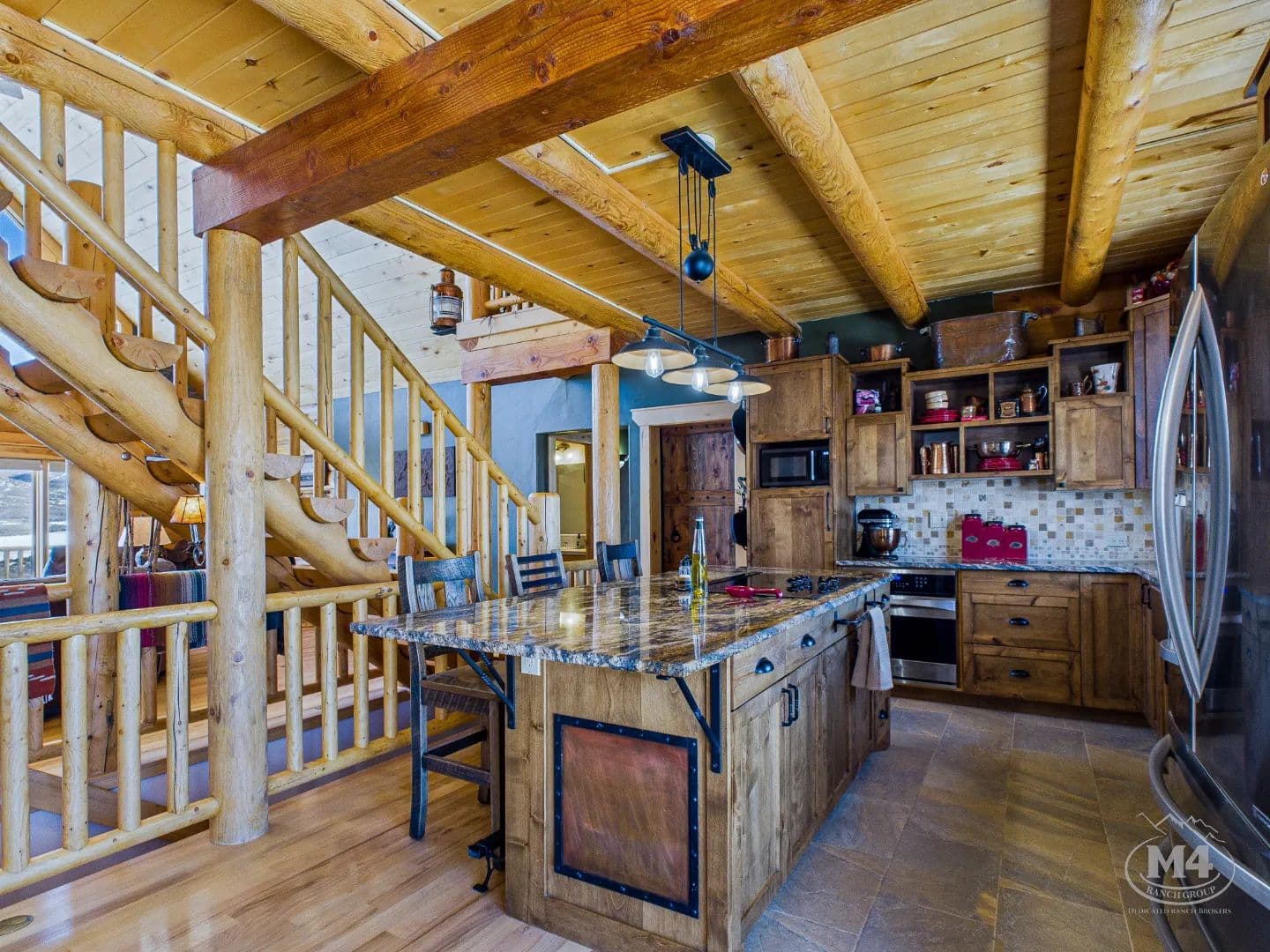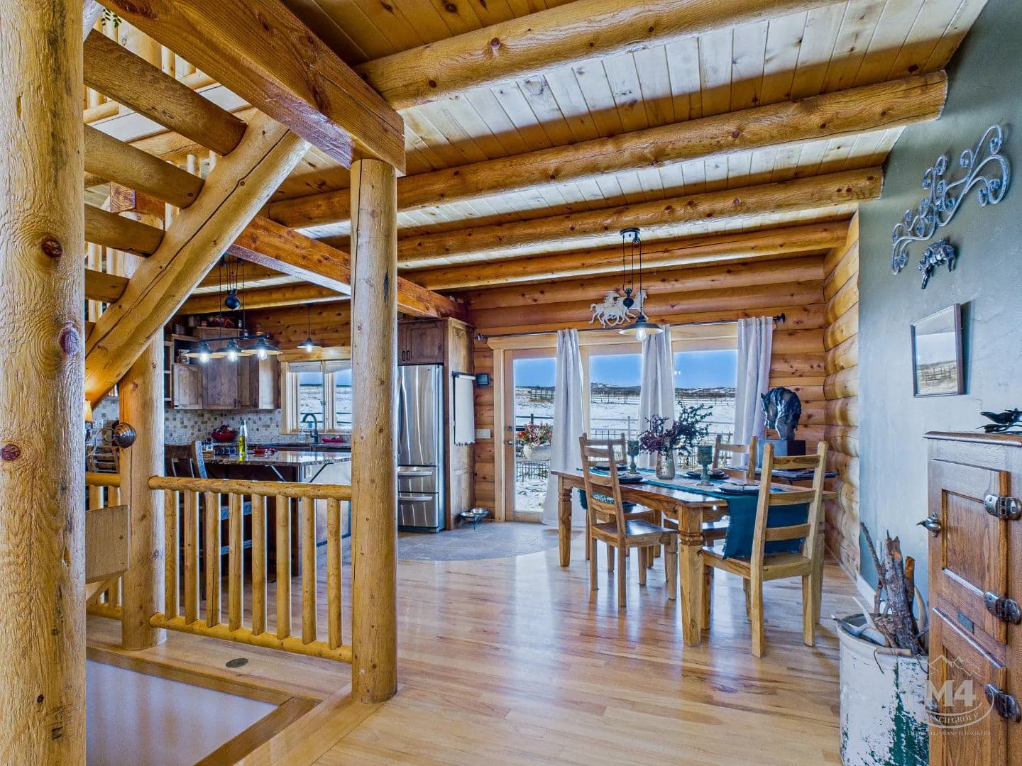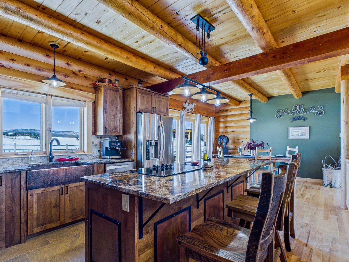 At the heart of Quietude Ranch is a beautifully maintained 5-bedroom, 3-bath log home designed for year-round comfort and lodge-style living. The home features in-floor radiant heat throughout, paired with a pellet stove in the living room that adds warmth and classic mountain ambiance.