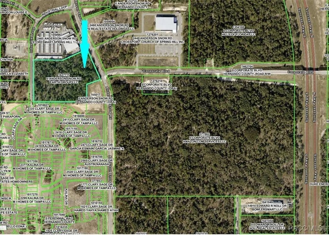 Discover a prime piece of real estate at the junction of Corporate Blvd and Anderson Snow Rd. This 8.5-acre +/- lot offers unmatched potential with an expansive 393 ft of road frontage on Anderson Snow Rd and a generous 502 ft on Industrial Loop. The lot is a wooded paradise, offering a natural backdrop. Whether you're planning a corporate establishment or another innovative venture, the land's PDP (CP) Corporate Park zoning ensures flexibility and potential for diverse developments. Location is key, and this land is perfectly situated, FDOT daily traffic 24,000. Surrounded by a mix of public storage, MI Homes development, a church and Amazon.com services, the community ambiance is balanced and thriving. And for those looking to connect beyond the immediate vicinity, the close proximity to Suncoast Parkway and Brooksville Regional Airport is a significant advantage. Ease of utility access further enhances the appeal of this lot. Electric connections are within easy reach, and the land is primed with access to public water and sewer facilities. This is a premium lot in a strategic location. It's a smart investment for anyone looking to capitalize on growth and development opportunities. Don't miss out!