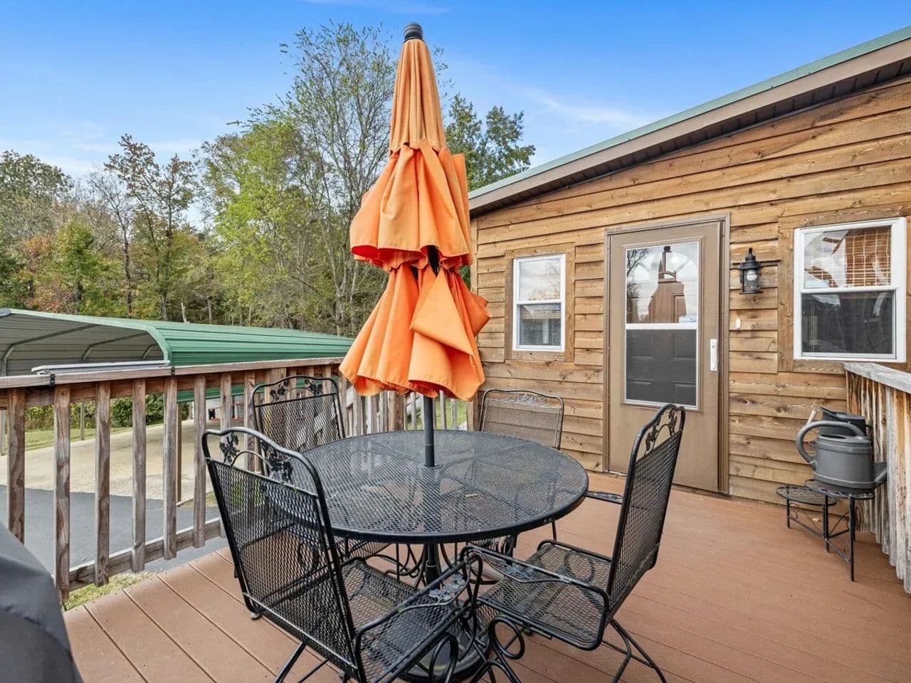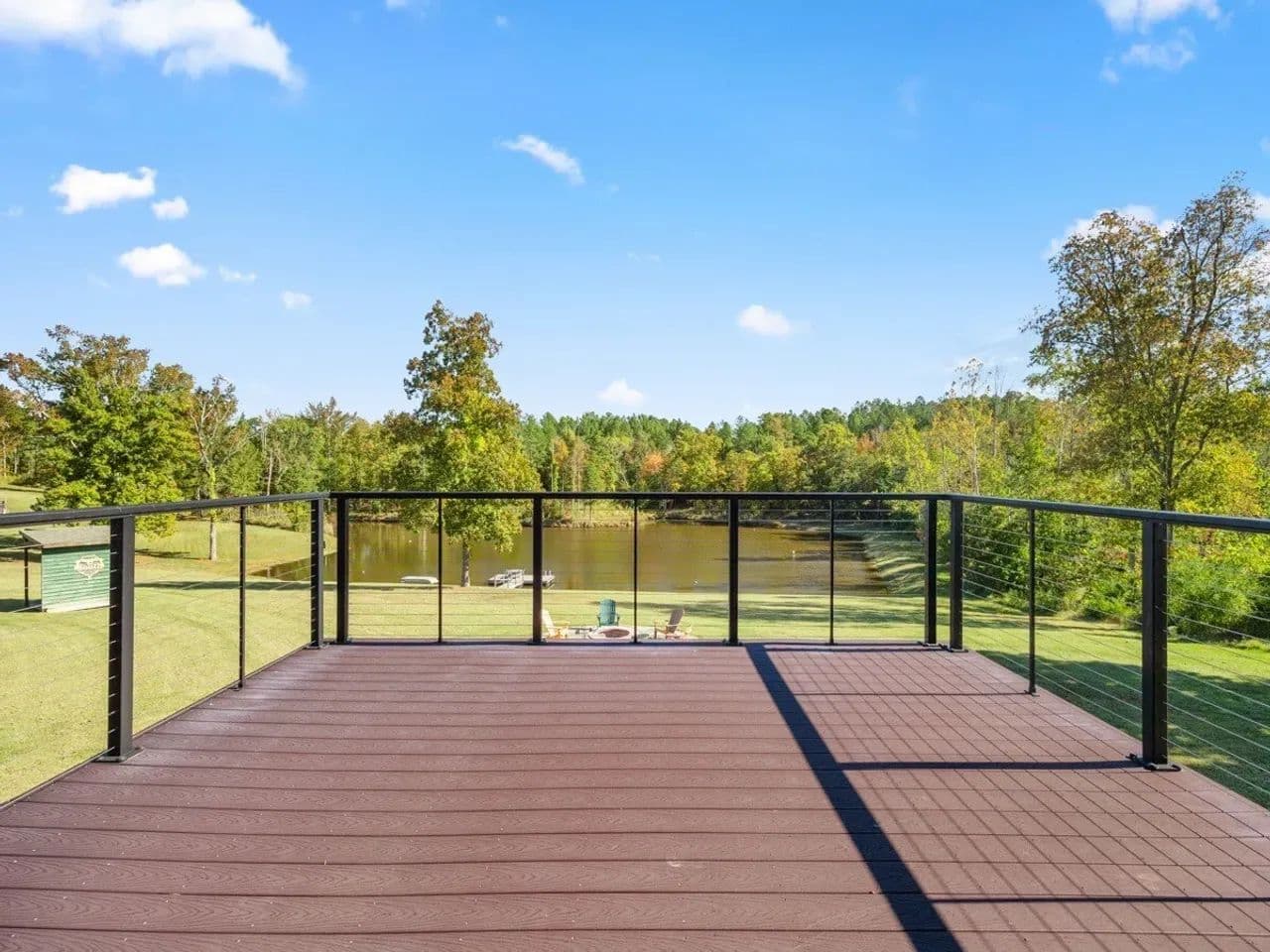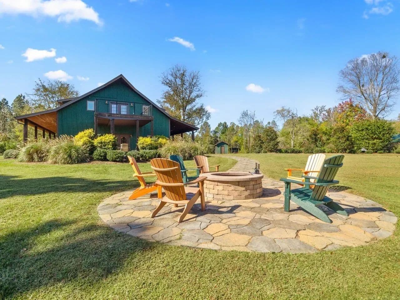 Outdoor Spaces: A large upper-level deck covered side porches on both sides, and a shaded sitting area beneath the deck provide ample room for socializing and enjoying views. A rock path leads to a firepit overlooking the stocked pond—perfect for unwinding after a day of activities, sharing stories, or roasting marshmallows. All outdoor furniture, including folding tables and chairs for large groups, are included.