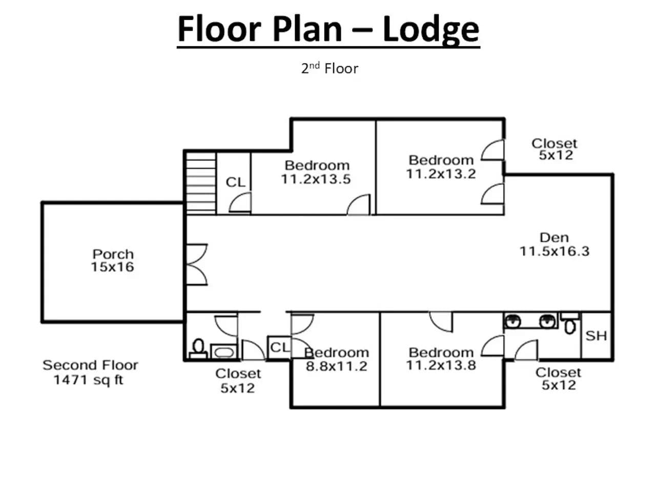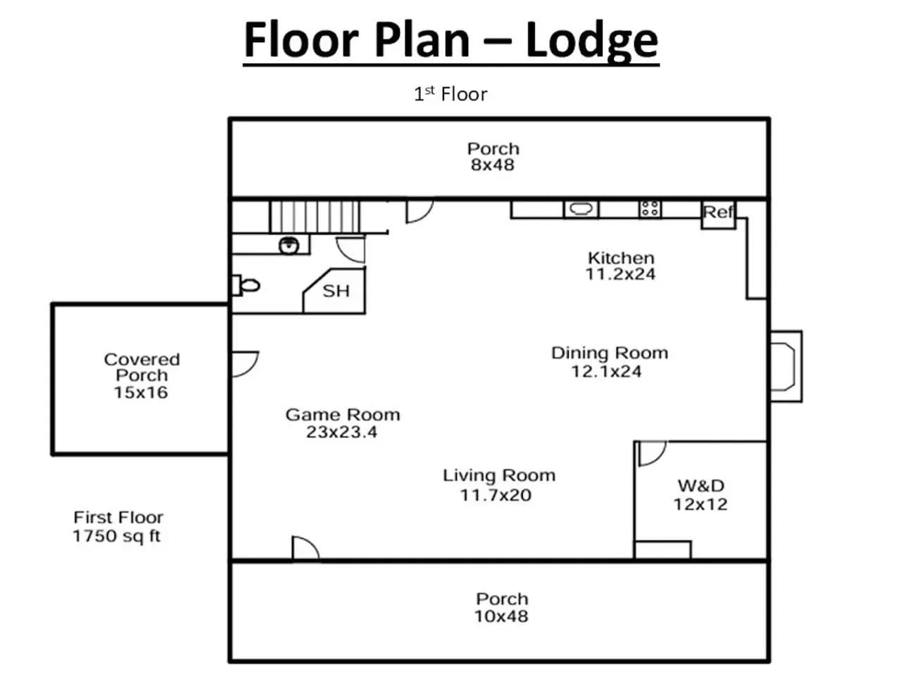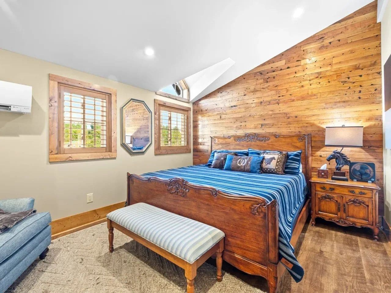 Outdoor Spaces: A large upper-level deck covered side porches on both sides, and a shaded sitting area beneath the deck provide ample room for socializing and enjoying views. A rock path leads to a firepit overlooking the stocked pond—perfect for unwinding after a day of activities, sharing stories, or roasting marshmallows. All outdoor furniture, including folding tables and chairs for large groups, are included.