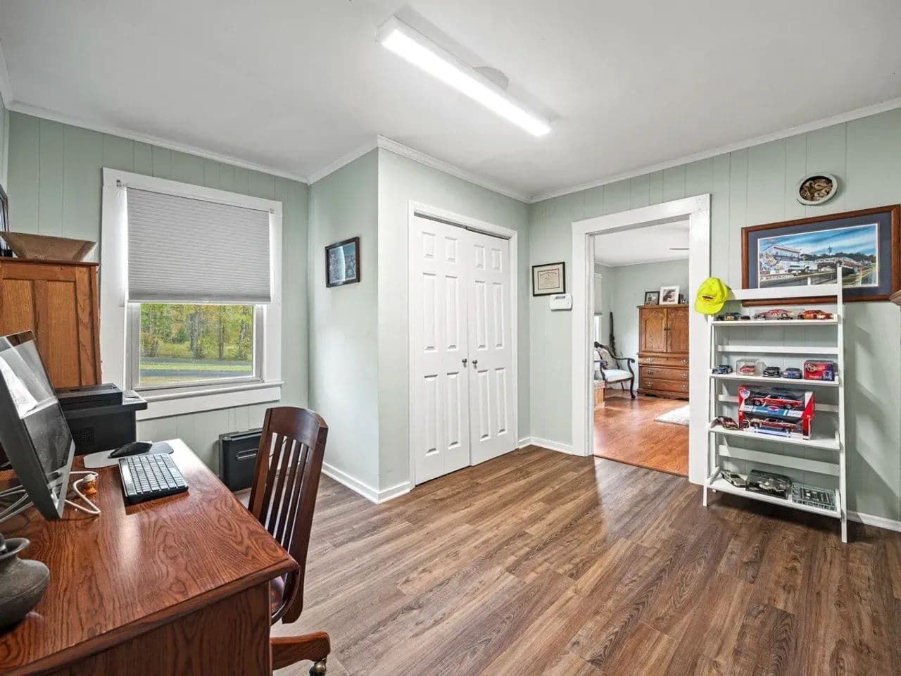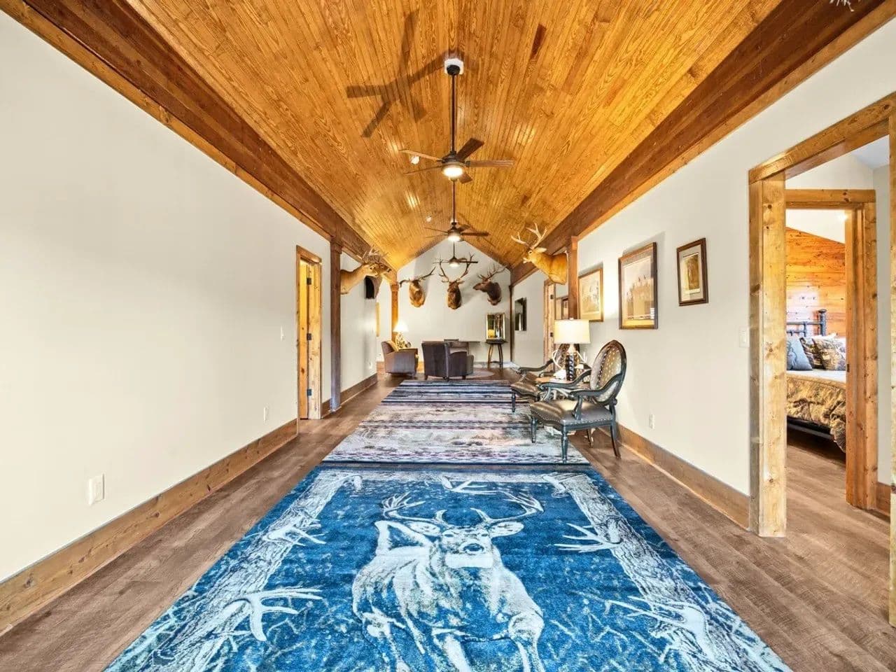 Hunter-Friendly Amenities: The lower level boasts a mud room for gear storage, a large safe for firearms, and a washer/dryer. Set up for entertaining and relaxing with its extra-large fireplace with gas logs or can be used as a wood burner too, TV sitting area with 82” flat screen, custom pool table, and dart board. Walls are primed for displaying hunting trophies, enhancing the classic hunt camp vibe. A large full bathroom with tile shower on this level accommodates overnight guests.