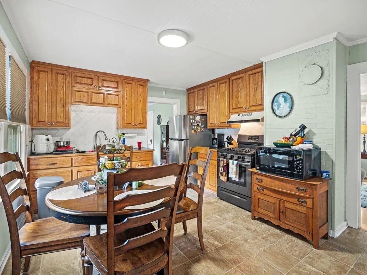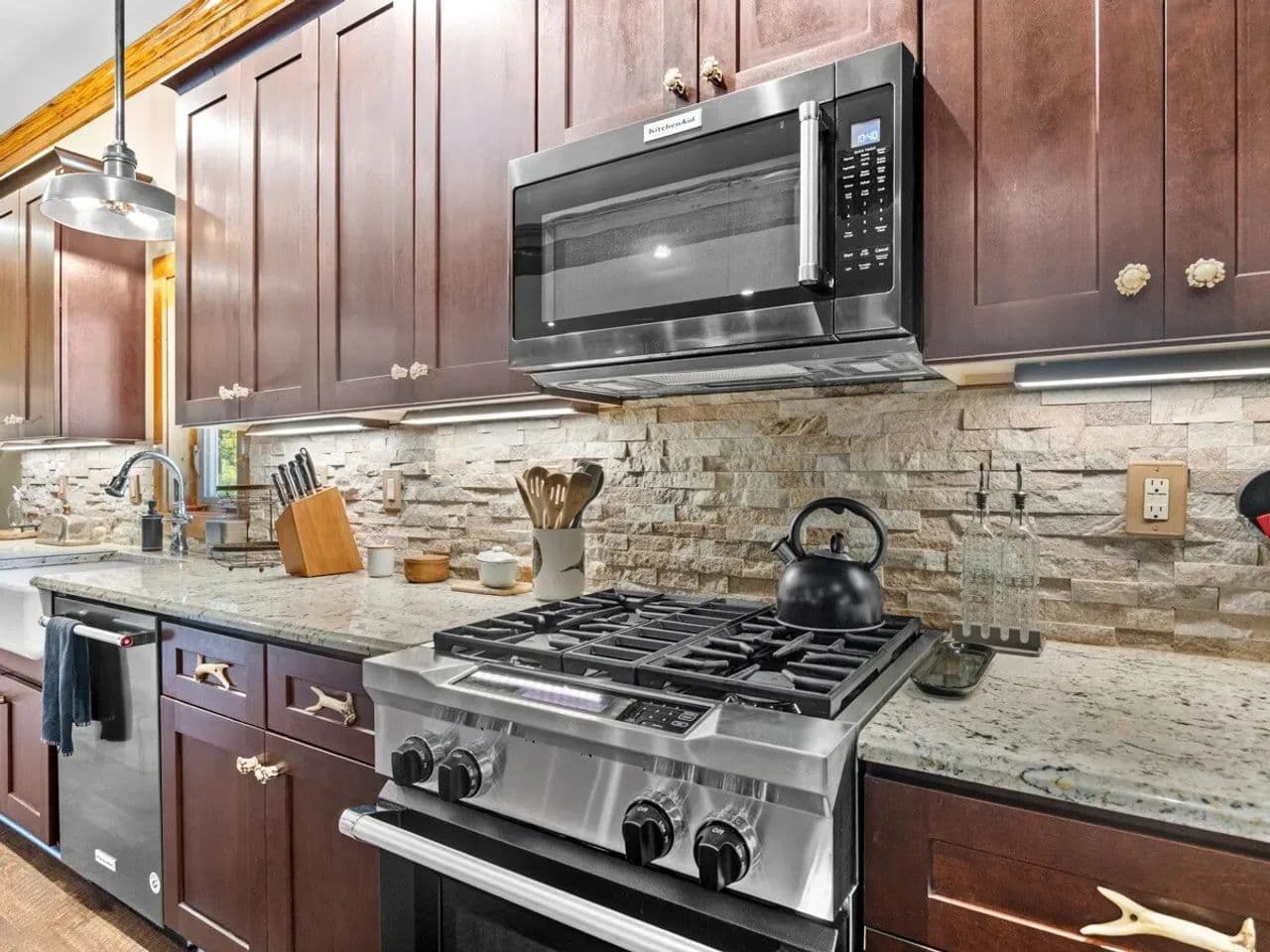 Spacious Kitchen: Equipped with a built-in icemaker, dishwasher, refrigerator, gas range, microwave, and wine cooler. Ample cabinets and drawers, along with generous countertops for food prep and serving, surround a large farm sink. Well-lit and functional, it includes iron bar chairs, tables, and a dining set—all conveyed with the sale.