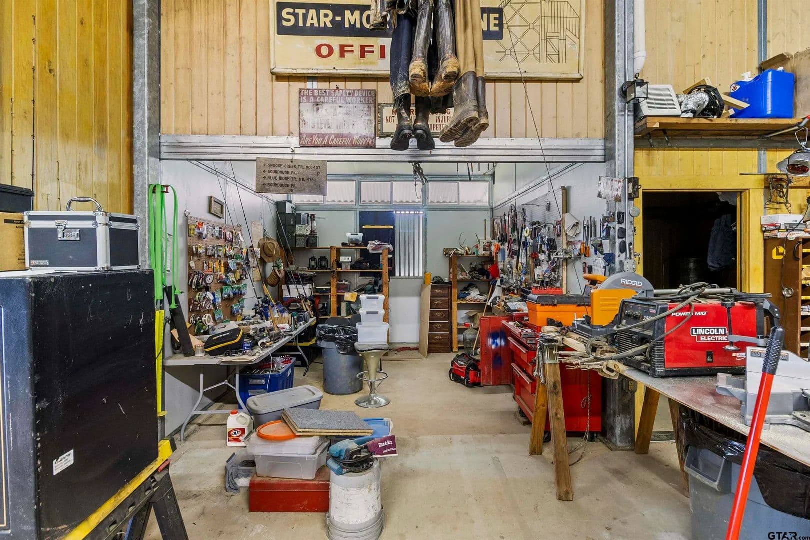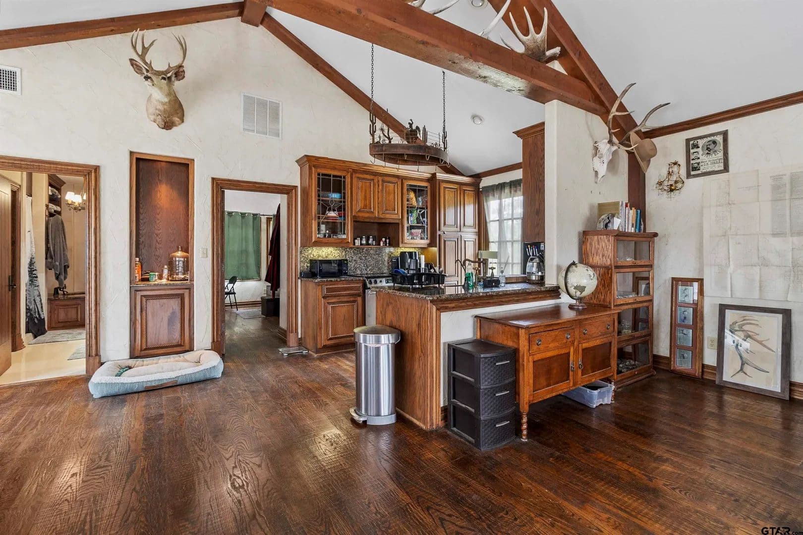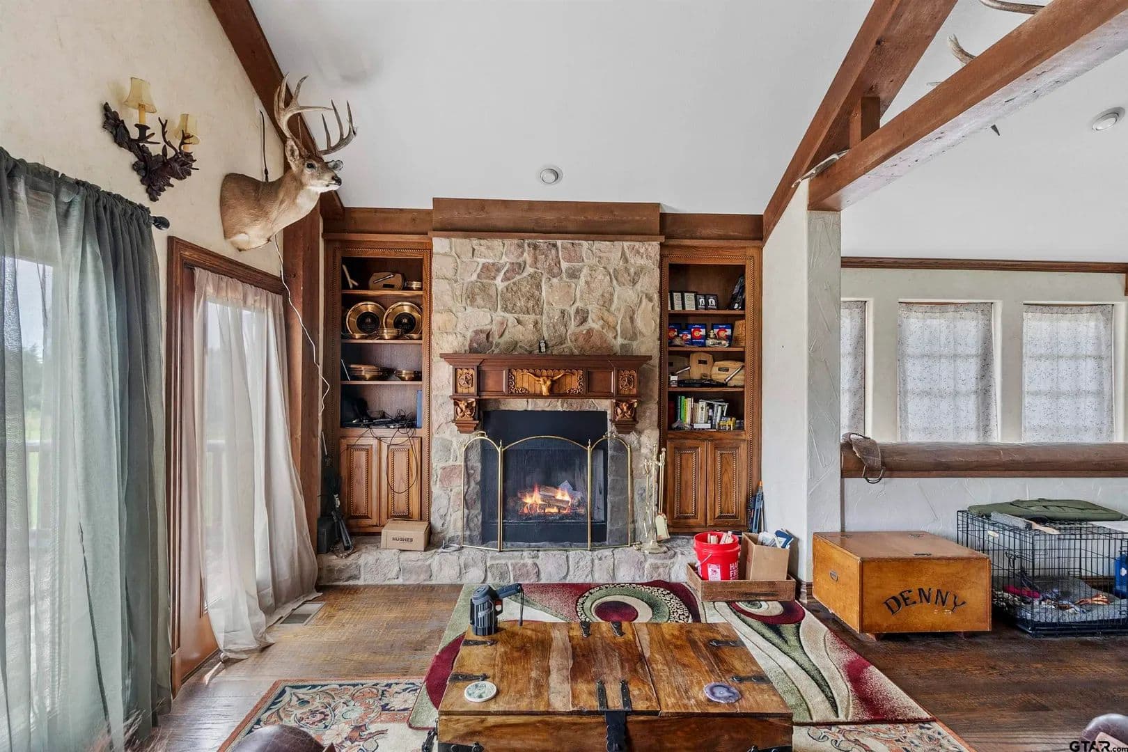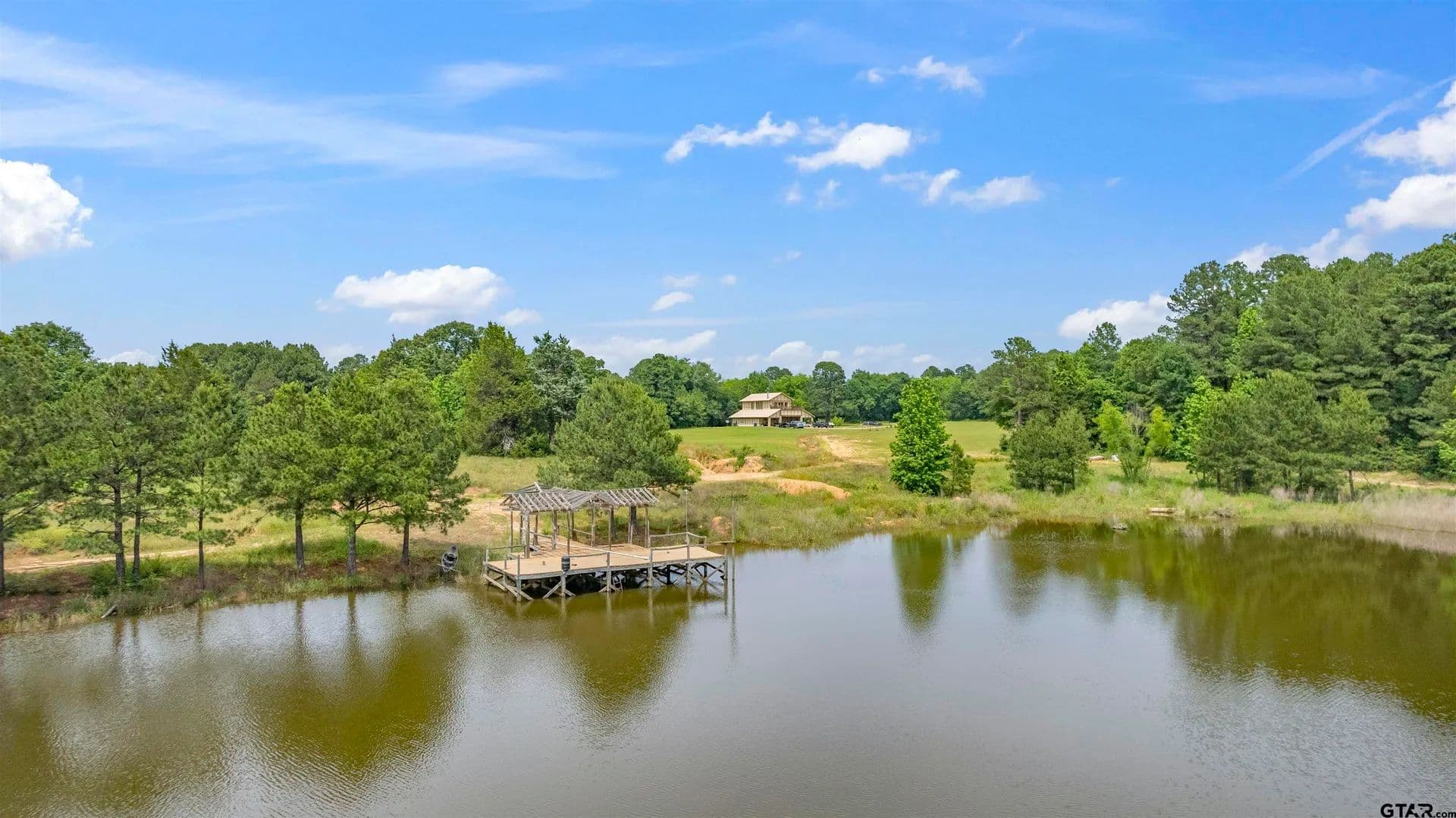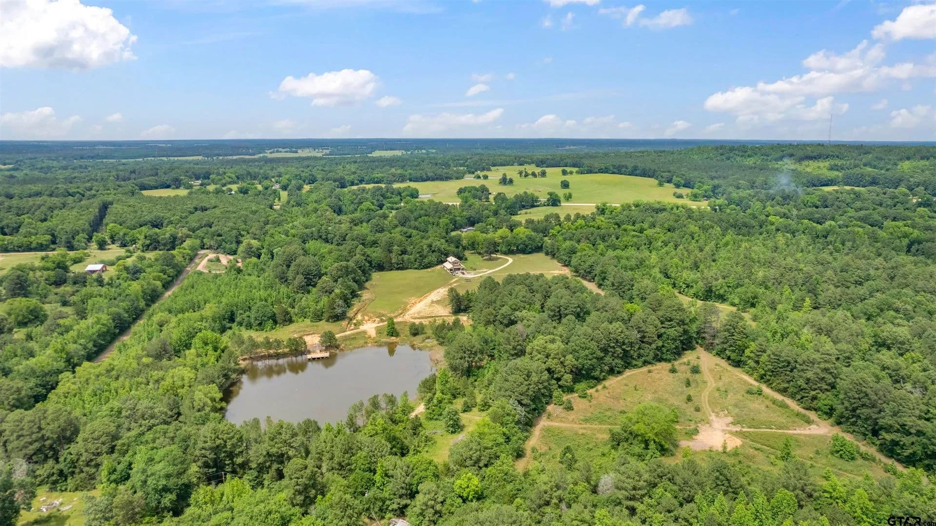 Hunting retreat, private oasis, or resort venue? You decide! This unique property, with 40 acres and a natural spring-fed pond, hosts a beautiful modern Barndominium with an elegant 2 bed 2 bath living space and equestrian barn stalls or workshop below! Hand scraped wooden floors, vaulted beam ceilings, custom carved wood accents, and granite counters make the upstairs a stunning backdrop for modern country living. Gorgeous custom cabinets throughout and built-ins around the stone fireplace and exceptionally carved mantle truly make the living space special. The bathroom is a luxurious escape with a lavish soaking tub, separate shower, and extra-long counter. A bonus bedroom with bunk beds and bath downstairs would be great for visitors! Spend your evenings on the enormous upper deck and watch the wildlife, including deer and wild hogs, travel through the property. Four barn stalls plus a tack room below are perfect spaces for horses—or they could be great office spaces, workshops, bedrooms, or a chic venue space! With barn doors on both ends and great lighting, this space has endless opportunities. The private spring-fed pond, approximately 2 acres and accessed by a large dock and maintained ATV trails, is stocked with bass, bluegill, and catfish. A smaller pond behind the home is a peaceful spot in the trees. Pomegranate, nectarine, and pear tress plus blackberry bushes on the property will bring a bonus harvest. Pads for two other building sites also exist with water and electrical hookups and are ready for your build. Add cabins, workshops, or more barns! Great cleared sites around the home and the property are also perfect for gardens or orchards--the possibilities here are numerous! This unique and stunning property is waiting for you! Call today!
