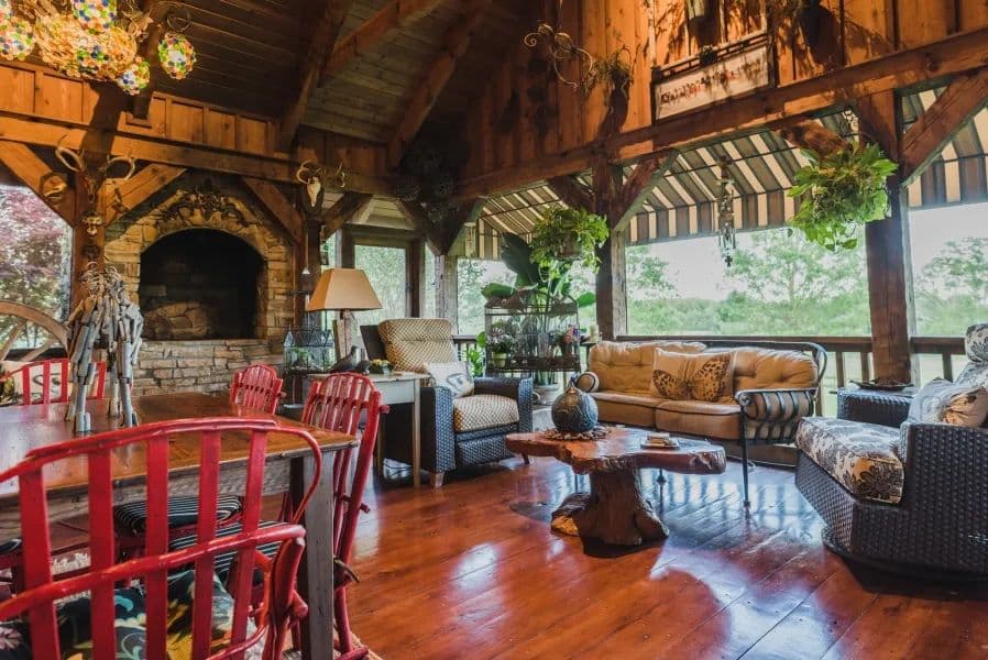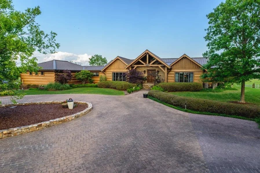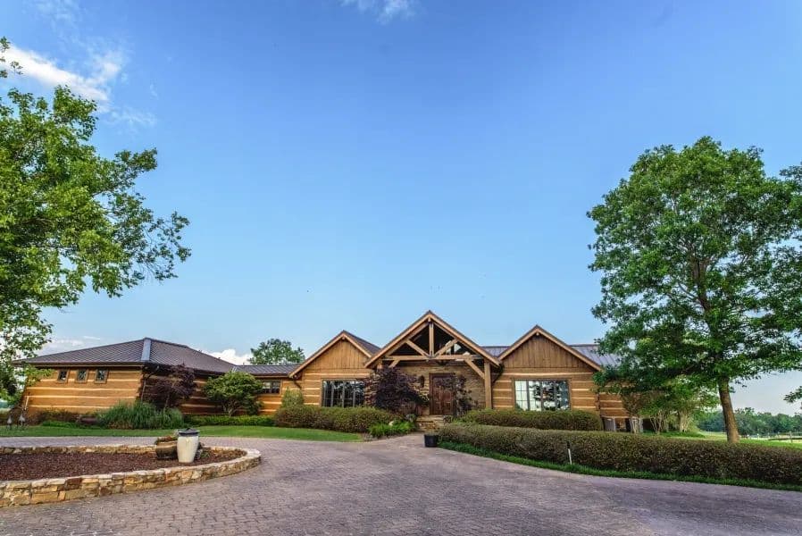 The main house is a 5,000 +/- square foot custom built pine square log home by Hearthstone Homes (Tennessee). The house has a commercial grade metal roof, 3 bedrooms, 2 full baths, 2 half baths. Heart pine floors harvested from an old cotton gin in Georgia, Pecky Cypress board paneling, custom faux plaster walls, antique front door, custom handmade ironwork, custom handmade trim, travertine marble master bath with steam room shower. Custom kitchen cabinets with black marble tops. Triple garage with 3 storage rooms, yard sprinkler system alarm system, 2 fireplaces, built-in porch charcoal grill area. Custom oak plank-board floor in screened porch adjoining sun deck. Custom rosewood master bedroom office cabinets, large laundry room with office and custom distressed beadboard cabinets with marble tops. In addition to the main house, there is 4 bedroom, 3 1/2 bath guest house.