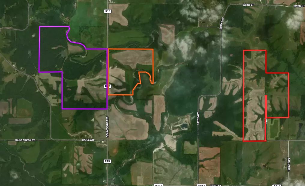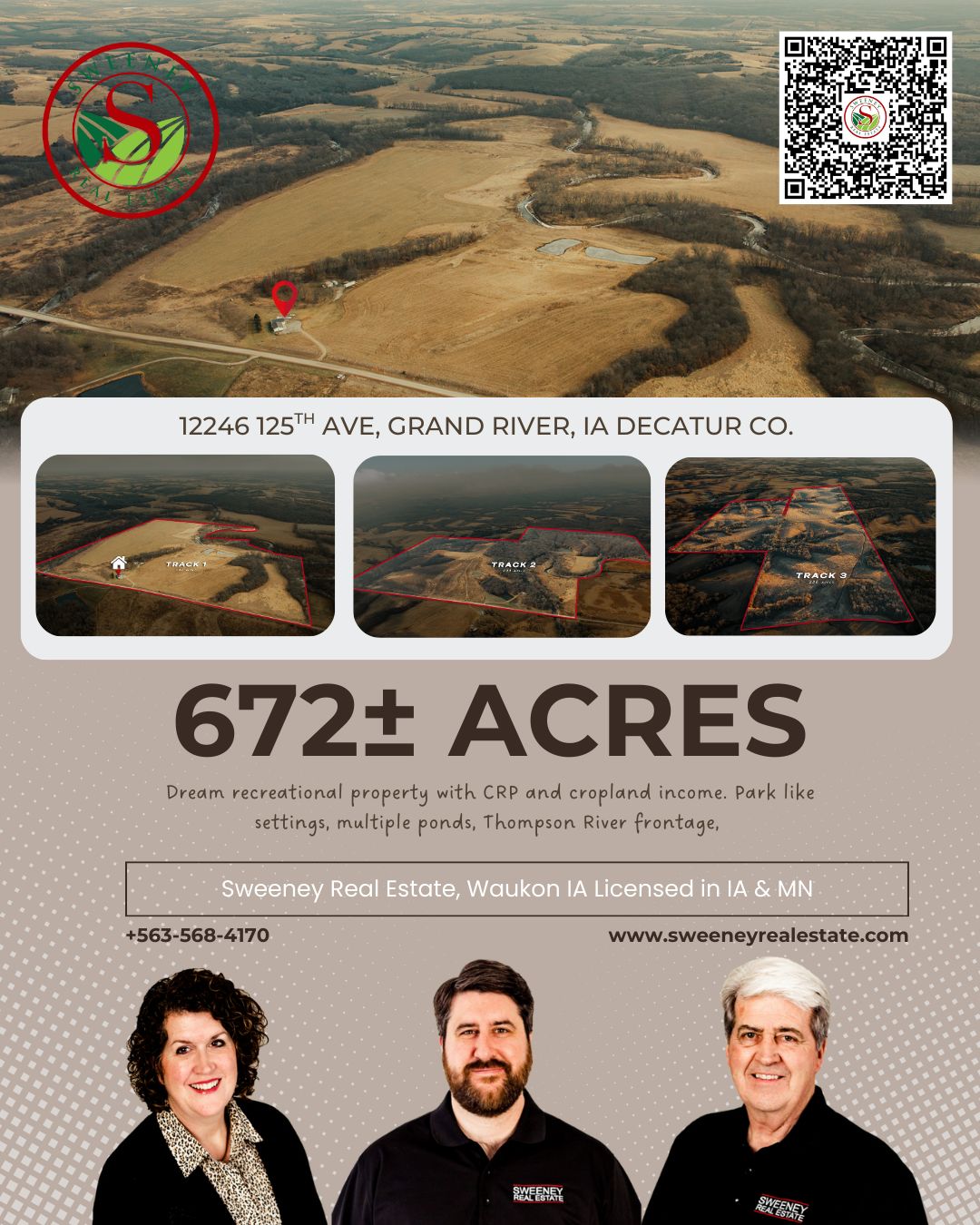 We are happy to present a rare opportunity to acquire a highly diversified farmland and recreational property in southern Iowa. Encompassing approximately 672± acres across three tracts, this offering combines productive cropland, income-generating CRP acres, timber, water features, and outstanding wildlife habitat. The tracts are offered in combination, while entertaining other options providing flexibility for owner-operators, investors, and recreational buyers seeking both immediate income and long-term appreciation. Well known for its quality hunting and outdoor recreation, the property supports strong populations of whitetail deer, turkey, upland birds, and other wildlife. Multiple ponds provide fishing opportunities, while the Thompson River winds through portions of the farm, offering additional fishing access as well as canoeing and kayaking potential. The diverse topography, timbered draws, and established cover create ideal wildlife corridors and enhance the overall recreational experience. Tract 1 – Section 16 (East of County Road R15 / 125th Ave) 131.29± Acres |34.72± CRP Acres. Tract 2 – Section 17 (West of County Road R15 / 125th Ave) 303.98± Acres | 98± CRP Acres. Tract 3 – Section 14 (East Tract)230± Acres | 88.76± CRP Acres. Located approx. 3.5 miles east of Tracts 1 & 2 Accessed via dead-end 145th Avenue. Buyer to verify all information and assume all CRP contracts. Call Sweeney Real Estate today for more information!