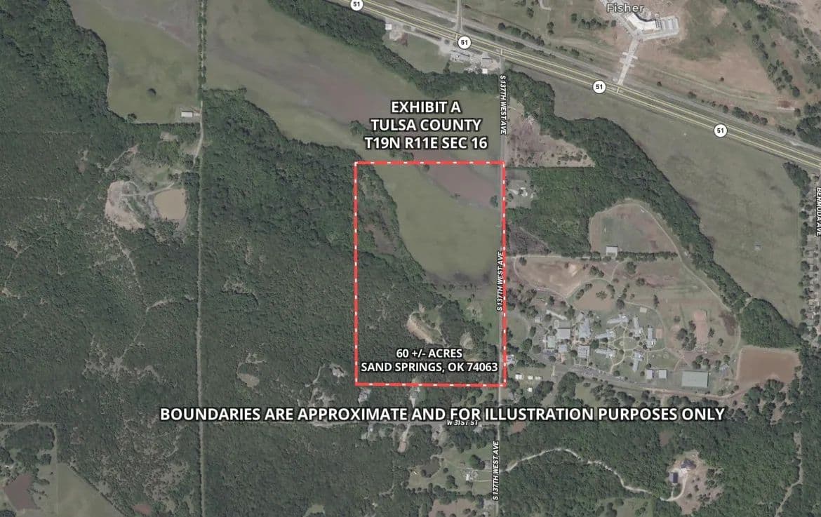Incredible opportunity to own 60 +/- acres just south of Sand Springs city limits, offering the perfect blend of rural charm and city convenience. Located only ½ mile from Hwy 51 and 4 miles from Hwy 412, this property provides quick and easy access to shopping, dining, and major employers in both Sand Springs and Tulsa.