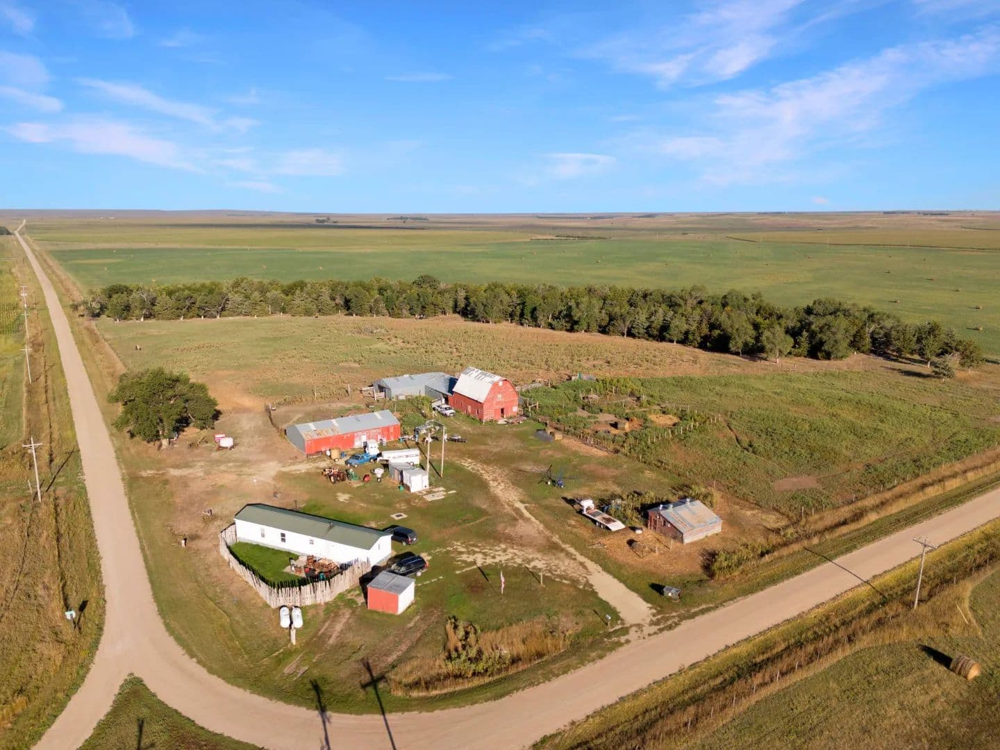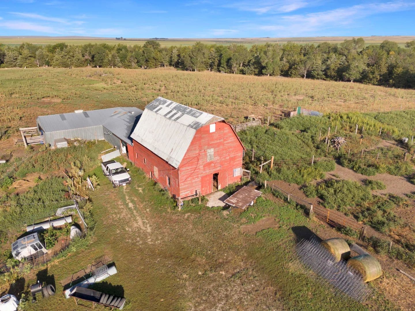 The 13-acre homestead site features barns, small shops, and storage buildings suitable for machinery, feed, or workshop use. The site includes a residential well, electrical service, and established windbreaks and corrals for livestock handling. A trailer home is currently located on the property and may be purchased separately, providing immediate living space or housing for staff.