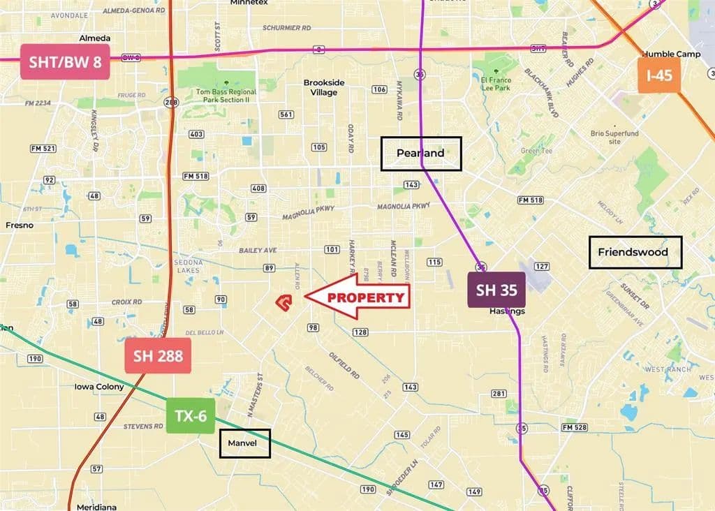 Wooded Manvel Ag Exempt 43.80 Acres by FM 1128 Near State Hwy 288 & State Hwy 6. The property consists of a 13.8-Acre Tract & three 10-Acre Tracts. Located West of FM 1128/Masters Rd, East of Hwy 288 & North of Hwy 6. Currently, Patterson Rd ends ~600 ft South & 300 ft North of the property's border. Future Thoroughfare plans show Scopel Road running East to West connecting FM 1128 to Croix Rd/CR 58 & CR 100 running just North of property from Dixie Farm Rd to 288. Once Patterson Rd is established, the Property will have ~1,063 ft of Road Frontage. The property will then have excellent access to 288, running North to Texas Medical Center & Downtown Houston; Hwy 6, West to Sugar Land & East to Galveston; I-45 (via Dixie Farm Rd); and Pearland to the North. The Site is zoned for Open Single-Family Development but is Perfect for Farm & Ranch Use while Holding for Future Development. Small slough/creek bed runs through a portion of the property. DO NOT WALK THE LAND WITHOUT LISTING AGENT!