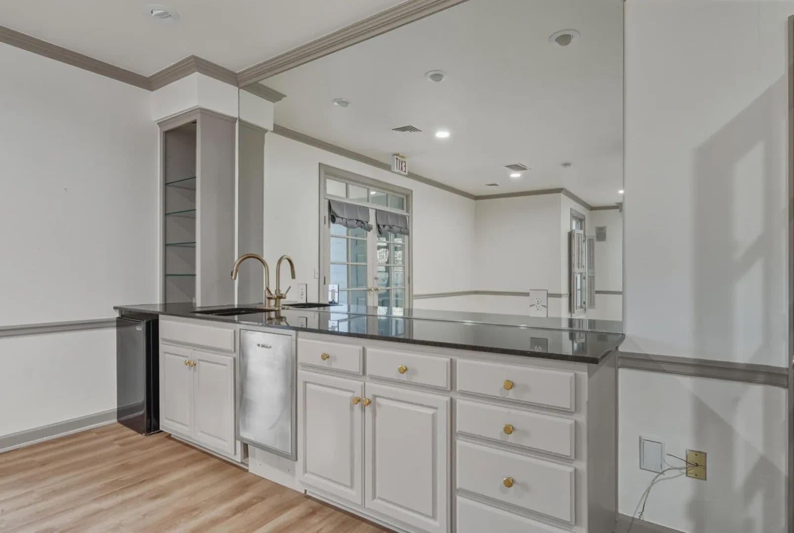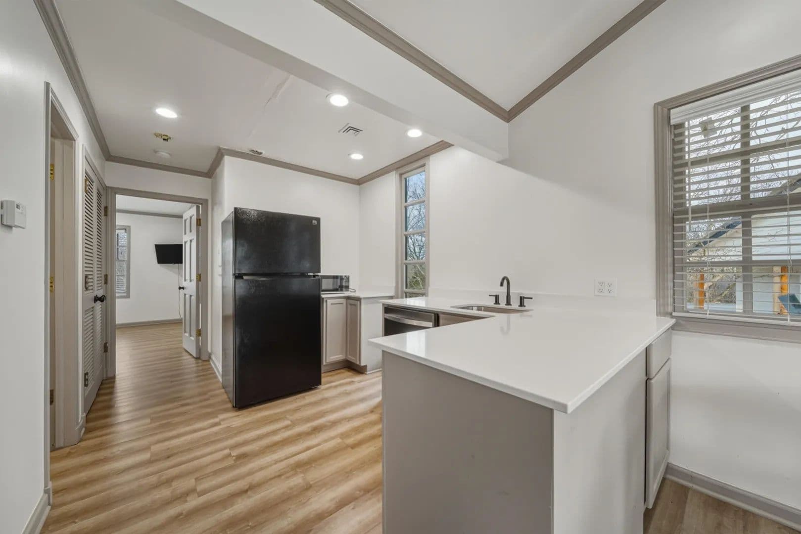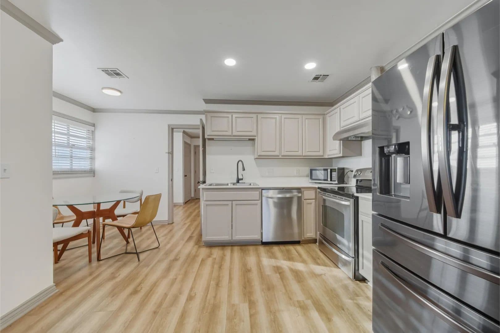 Full kitchen with refrigerator, dishwasher, microwave, full-size oven, and ample cabinetry