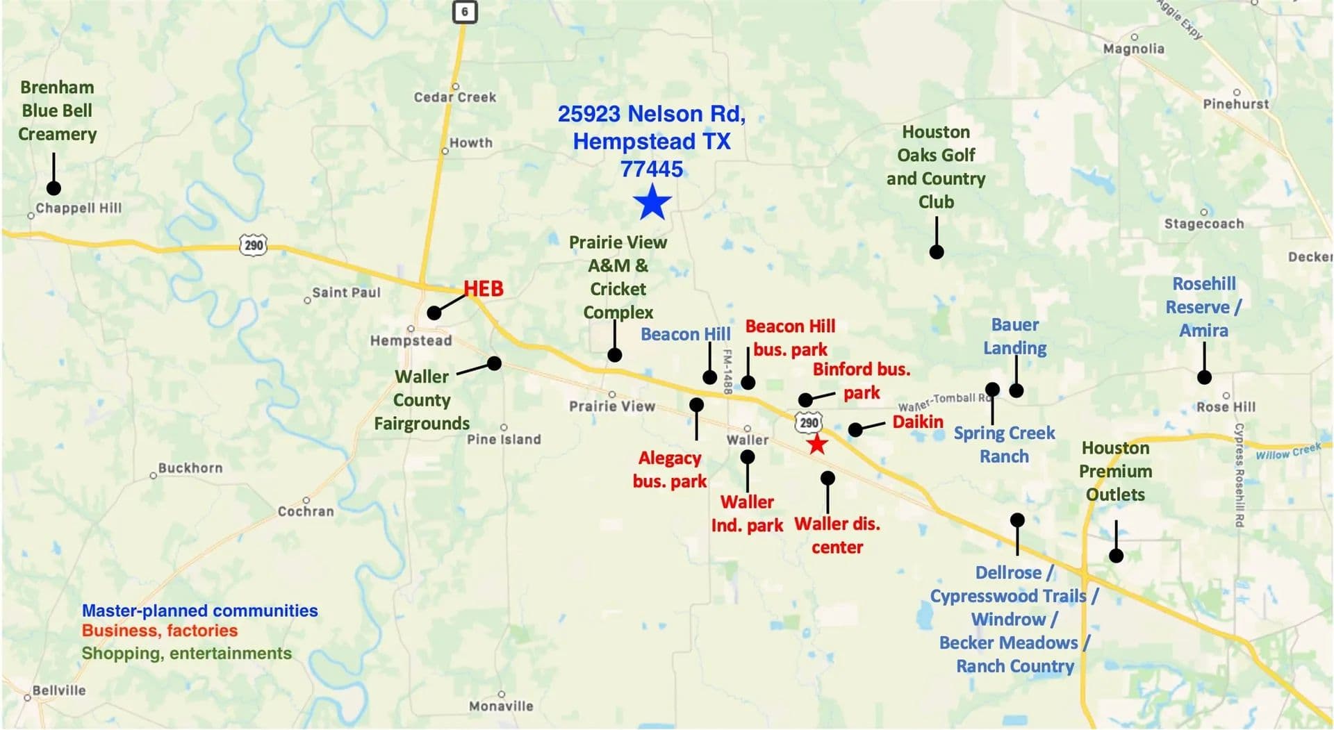 Property locates at 25923 Nelson Rd, Hempstead, TX 77445. Approximately 70 +/- acres available. Two road frontages. Property is conveniently located in a significant growing area in Waller County. Less than 10 min from Buc-ee's on HW 290, Waller high school and Prairie View A&M University. Easy access to FM 1488, US Hwy 290, State Hwy 6. About 15 minutes to Grand Parkway and 30 Minutes to Houston Premium Outlets and Bridgeland communities. Property currently has Ag Exemption. Low tax rate. No maintenance fees. Unrestricted (per seller) land for multiple use. No flooding (per seller).