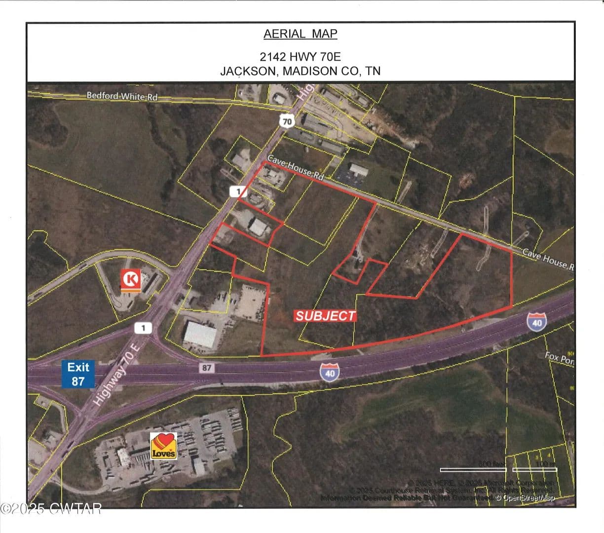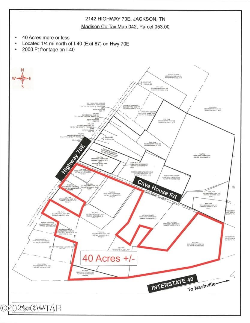 40 Acres more or less located on the southeast corner of Hwy 70E and Cave House Rd, ¼ Mi north of I-40, Exit 87. WILL DIVIDE. Currently just outside the city limits of Jackson, TN, can be annexed into the city upon request and rezoned and have access to sewer once annexation is complete. Multiple uses once property is rezoned: truck terminal, truck stop, hotel, restaurant, light industrial.