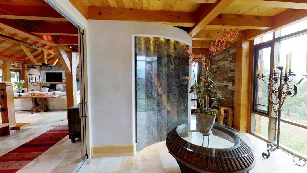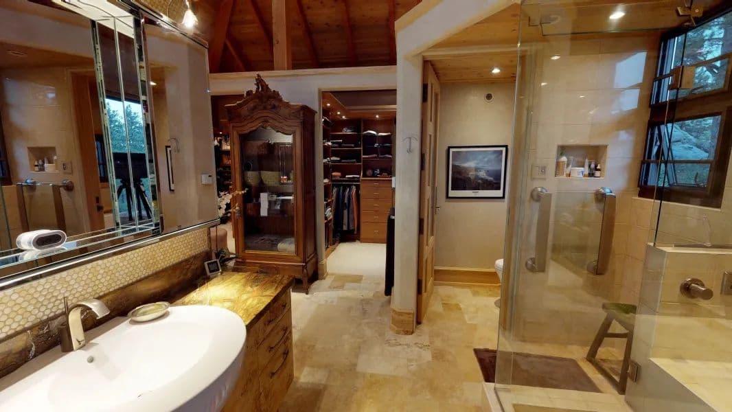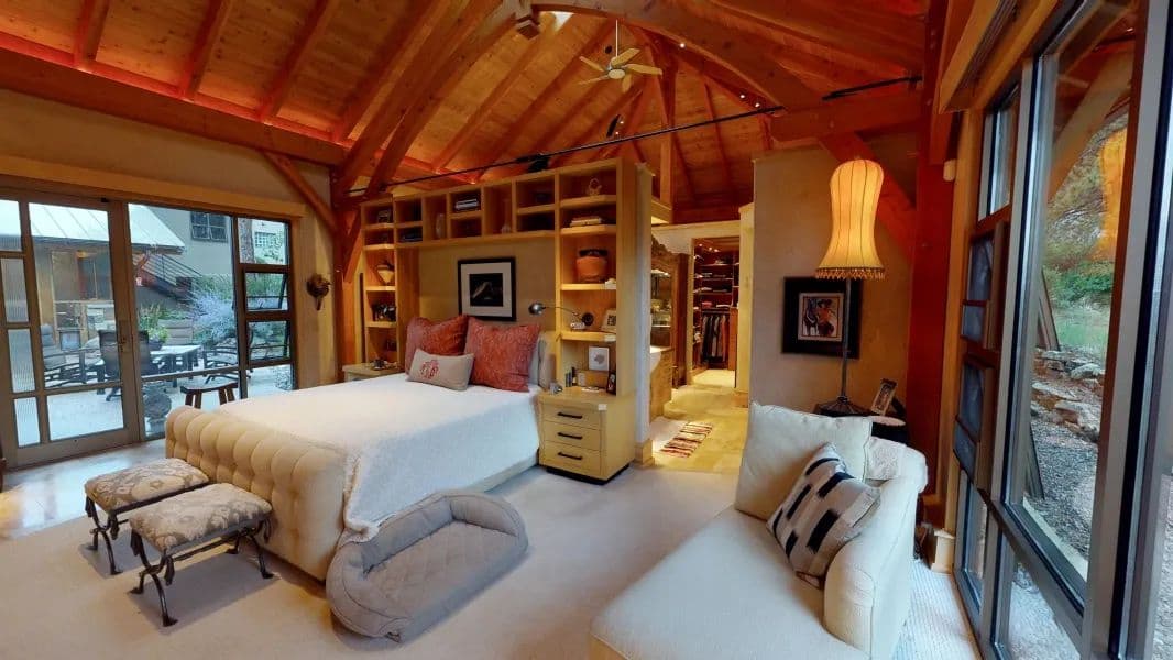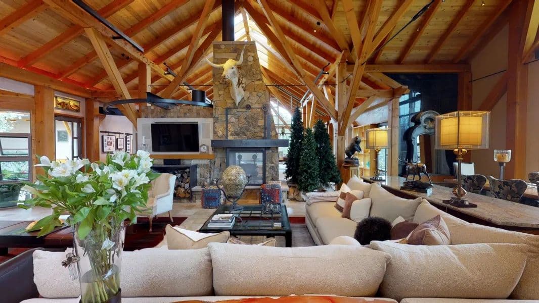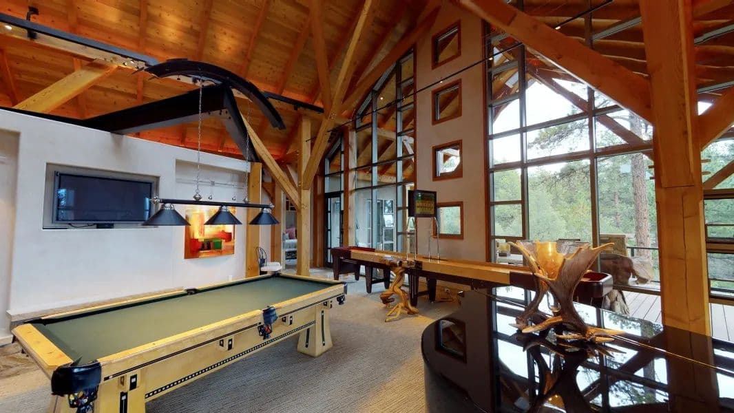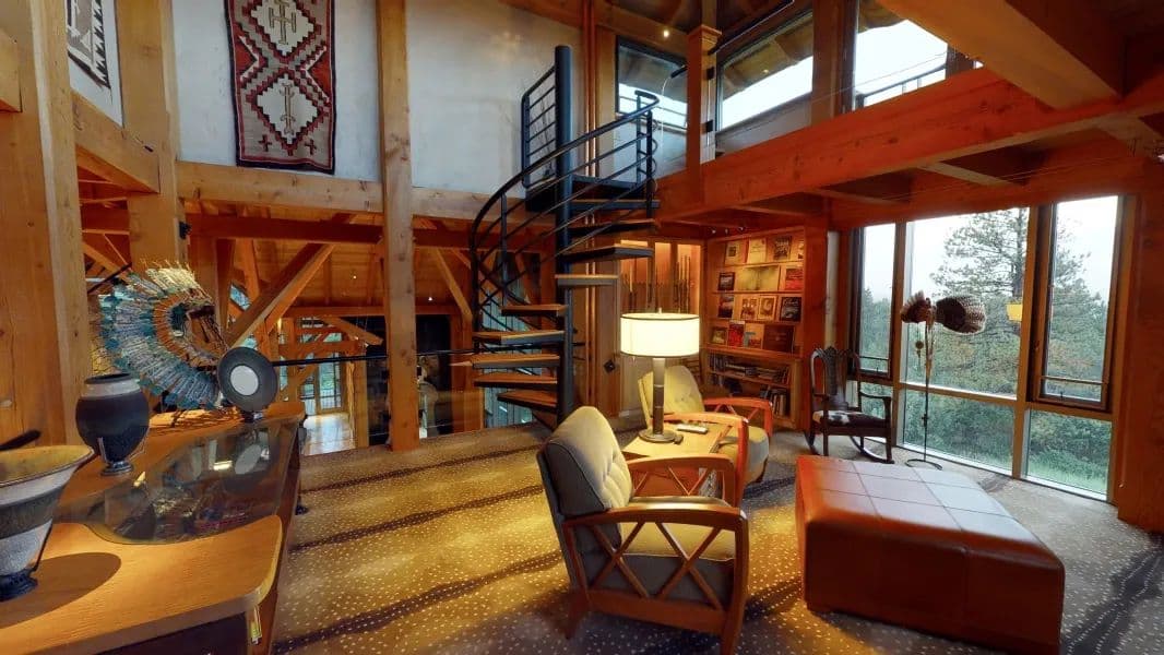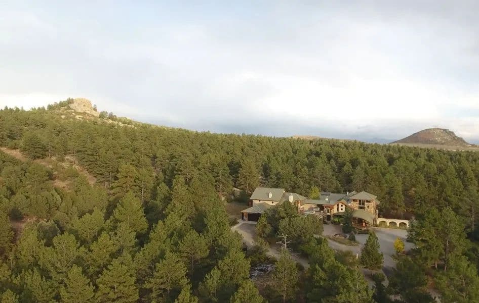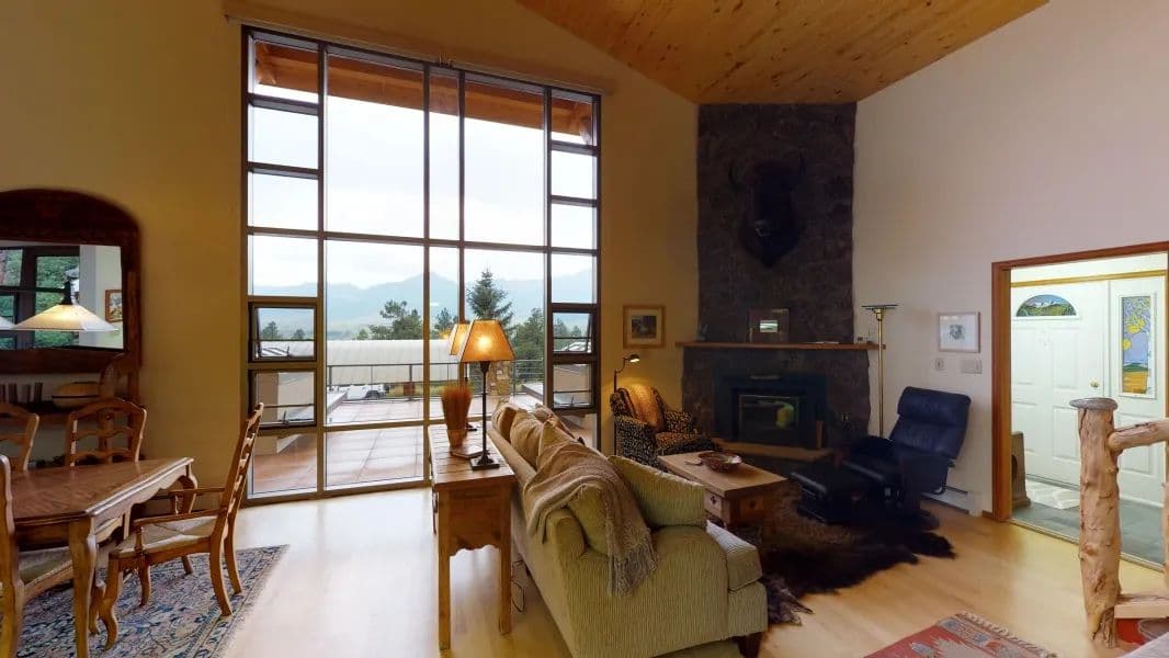 A 42-foot arched canopy marks its main entrance. The entrance leads to a vast great room & entertainment space with 22-foot high ceilings with a walk-around natural stone fireplace, a large dining area, & an open kitchen. The full-grain maple & birch burr cabinets are accompanied by beautiful granite counter tops. Equipped with high-end appliances, the kitchen is a true gourmet experience. The master bedroom & bathroom are exceptionally luxurious with a private soaking tub, a separate spa shower, & custom granite counters & cabinets. The upper level consists of a reading room which leads up a spiral staircase to an observation area with spectacular views. The lower level has an office, gym, a mechanical room & storage, as well as two large open spaces. Connected by an interior hallway, there is an entire guest space with 4 bedrooms, 3 baths, a secondary kitchen, living room, & dining space. There is also room in this home for an expanded office, & the home comes equipped with high speed internet via underground fiber optics, a true rarity in Colorado Mountain Homes! There is a 5-car & a 2-car attached garage & two large metal buildings/garages that have accommodated 13 cars/trucks. There is also a rustic sleeping cabin, a gorgeous deck, & several garden spaces.
