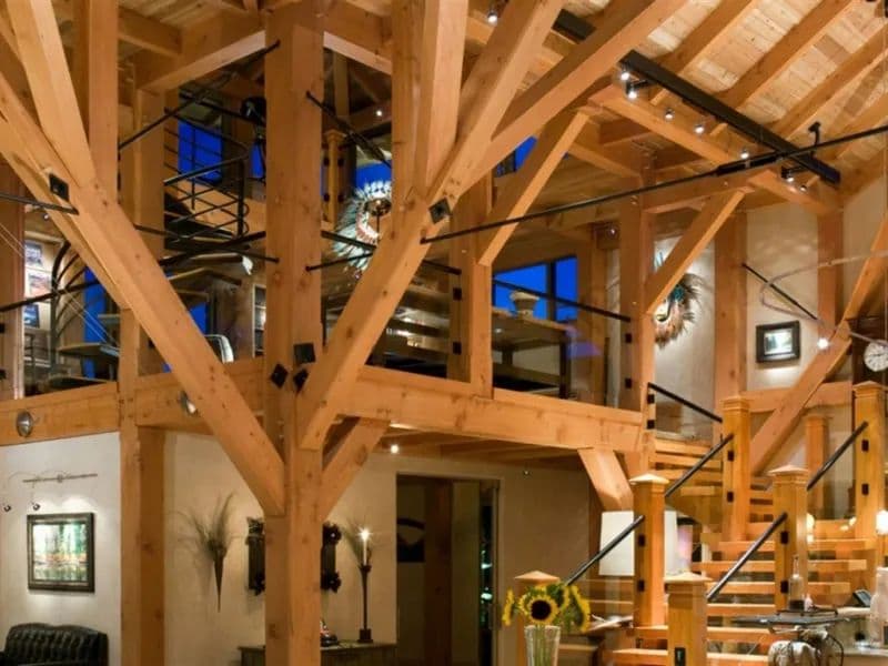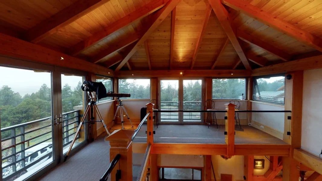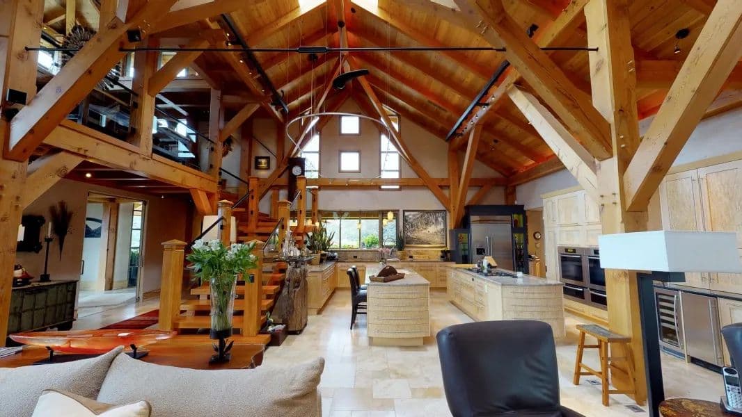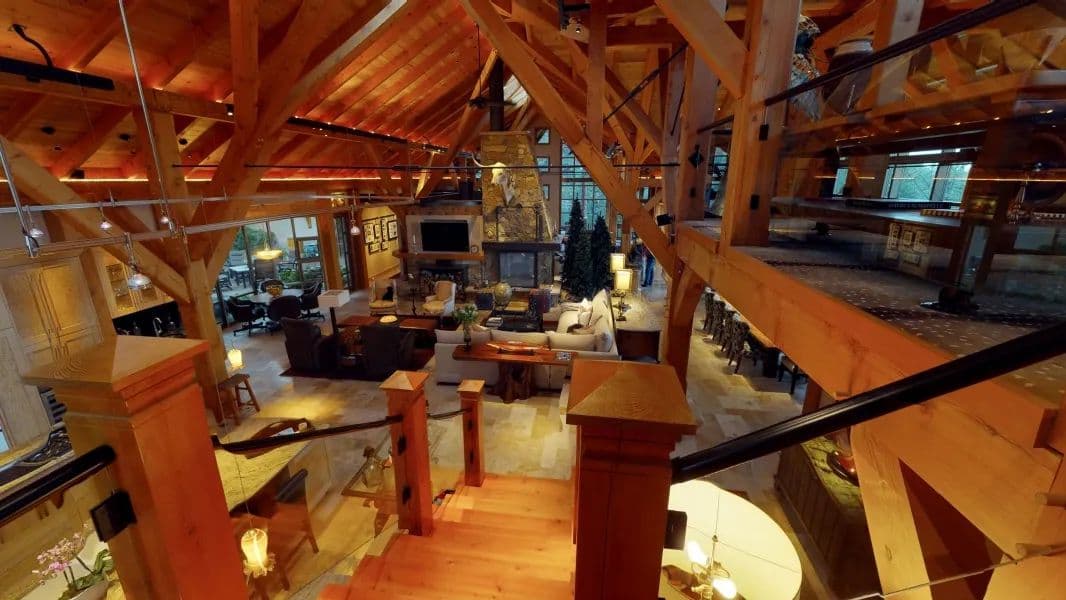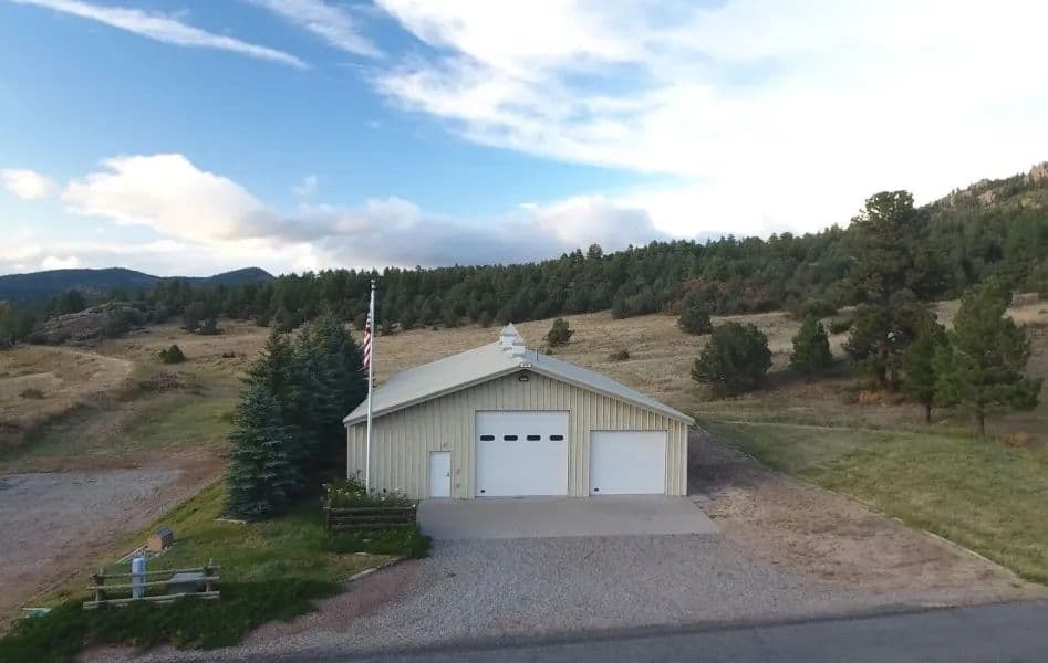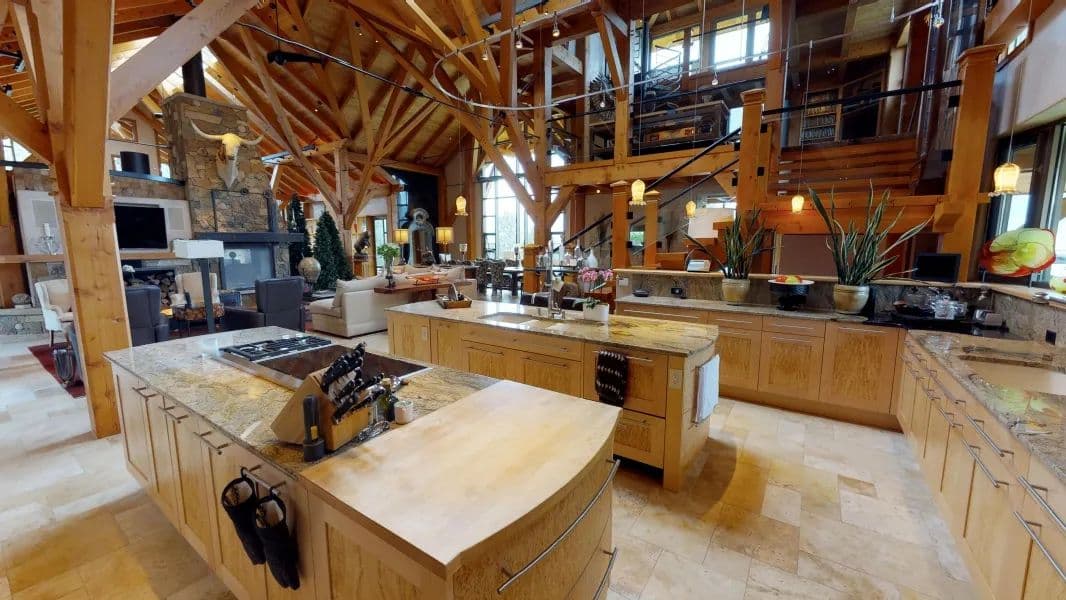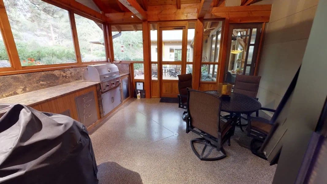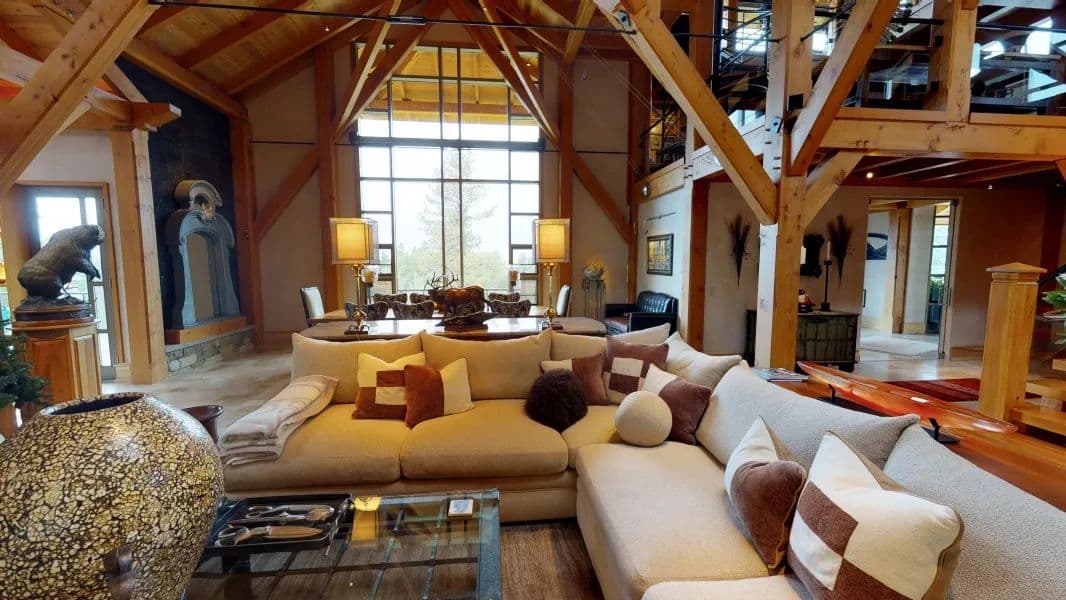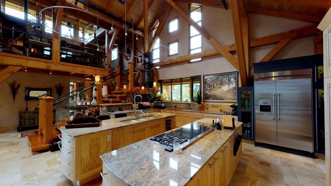 A 42-foot arched canopy marks its main entrance. The entrance leads to a vast great room & entertainment space with 22-foot high ceilings with a walk-around natural stone fireplace, a large dining area, & an open kitchen. The full-grain maple & birch burr cabinets are accompanied by beautiful granite counter tops. Equipped with high-end appliances, the kitchen is a true gourmet experience. The master bedroom & bathroom are exceptionally luxurious with a private soaking tub, a separate spa shower, & custom granite counters & cabinets. The upper level consists of a reading room which leads up a spiral staircase to an observation area with spectacular views. The lower level has an office, gym, a mechanical room & storage, as well as two large open spaces. Connected by an interior hallway, there is an entire guest space with 4 bedrooms, 3 baths, a secondary kitchen, living room, & dining space. There is also room in this home for an expanded office, & the home comes equipped with high speed internet via underground fiber optics, a true rarity in Colorado Mountain Homes! There is a 5-car & a 2-car attached garage & two large metal buildings/garages that have accommodated 13 cars/trucks. There is also a rustic sleeping cabin, a gorgeous deck, & several garden spaces.