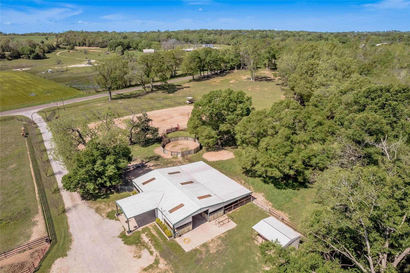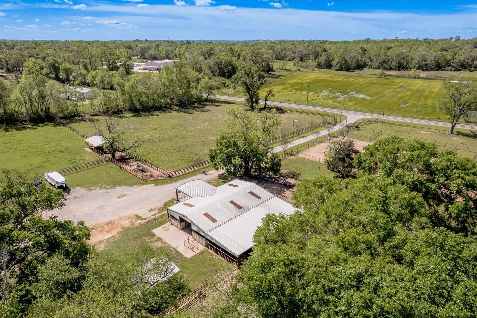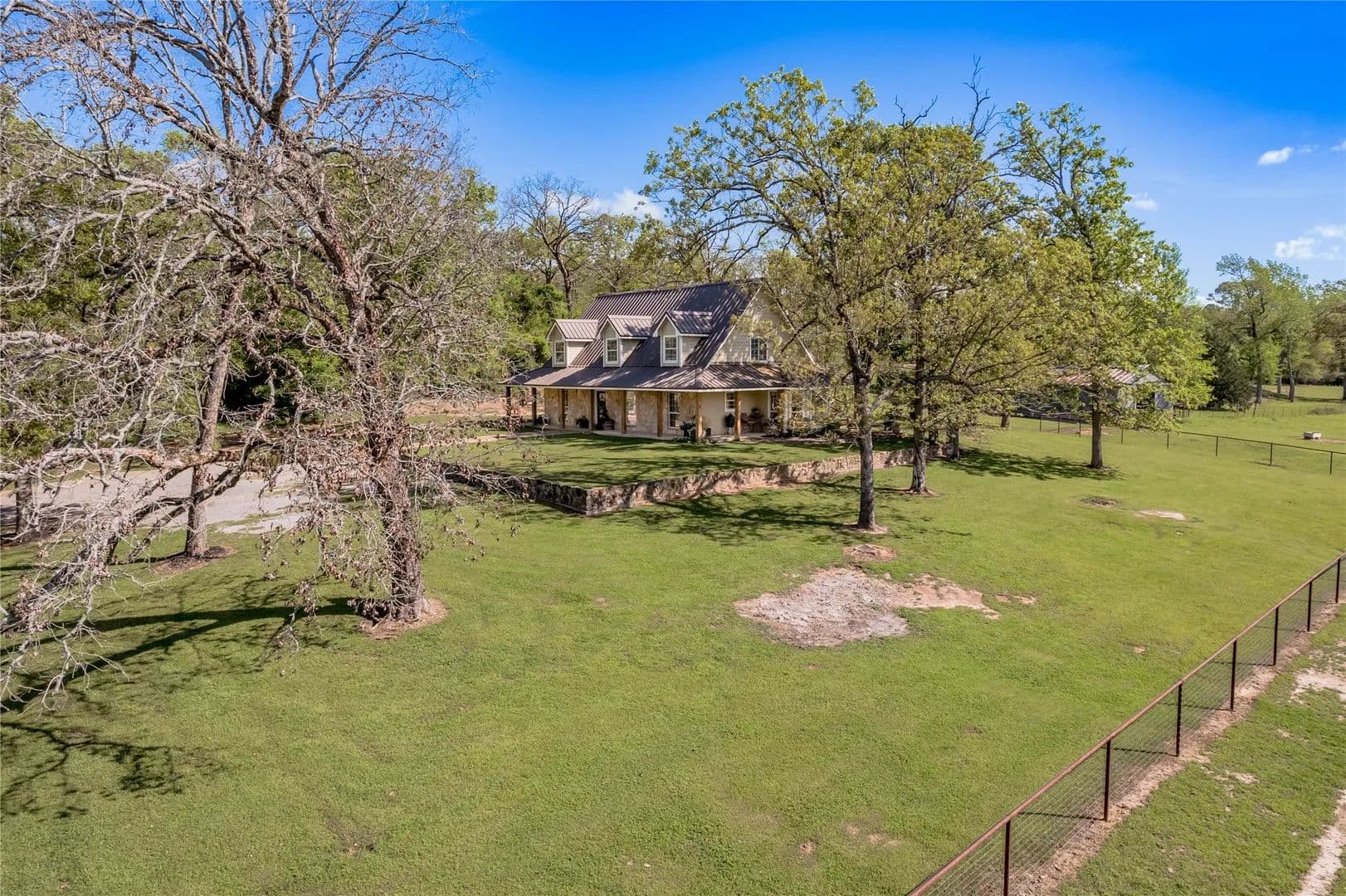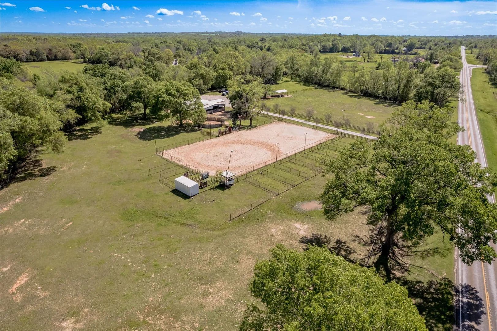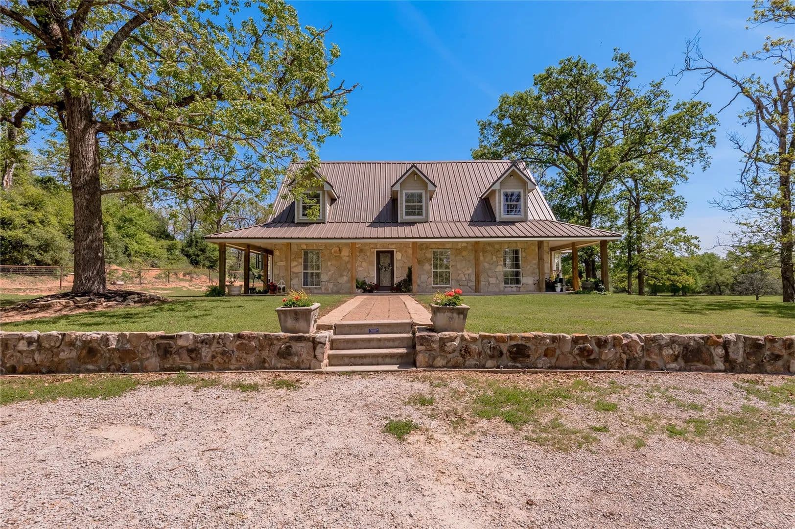 Bring the Horses! Designed, built, and previously used as a horse training facility, this property is a dream for the horse enthusiast. Gated entry w/pipe fencing; lighted arena w/covered announcer stand, livestock holding pens, cattle return alley; custom 60' the round pen; extra parking for trucks/trailers; and a custom 7-stall barn with covered entrance. Barn has new electrical; stalls have dedicated runs; built-in feeders & auto waterers, wash rack, vet stocks, and 2 open 12x12 storage areas. 6 individual pastures; 5 with covered stalls. As you continue up the drive and you'll cross the live creek on the newly rebuilt bridge and arrive at the custom hilltop home. With welcoming covered porches and fantastic views, you'll be right at home here. This home offers a wonderful floor plan and great views from every room. Master suite with private bath and huge walk-in closet. Spacious downstairs living room with huge FP + 2nd living area up.