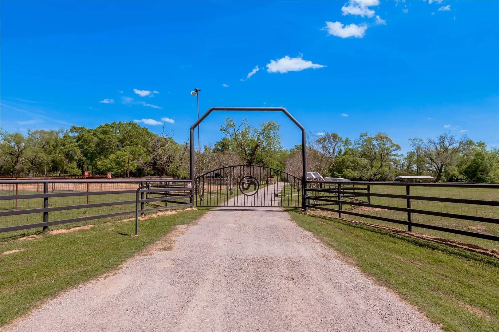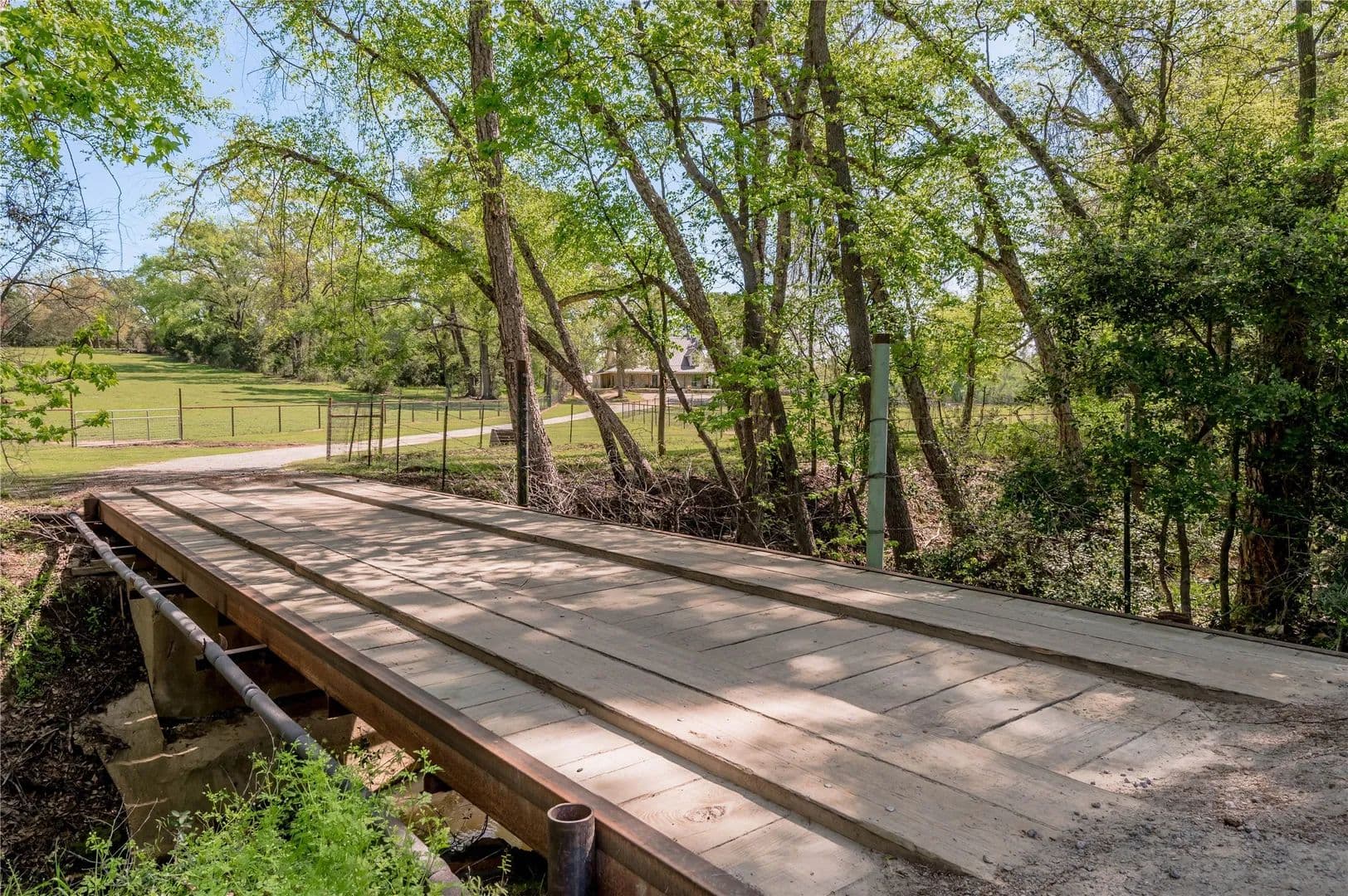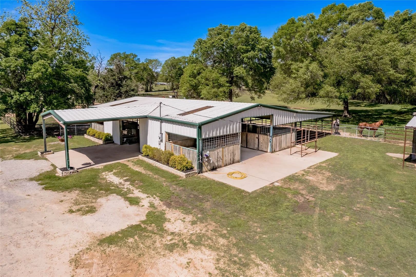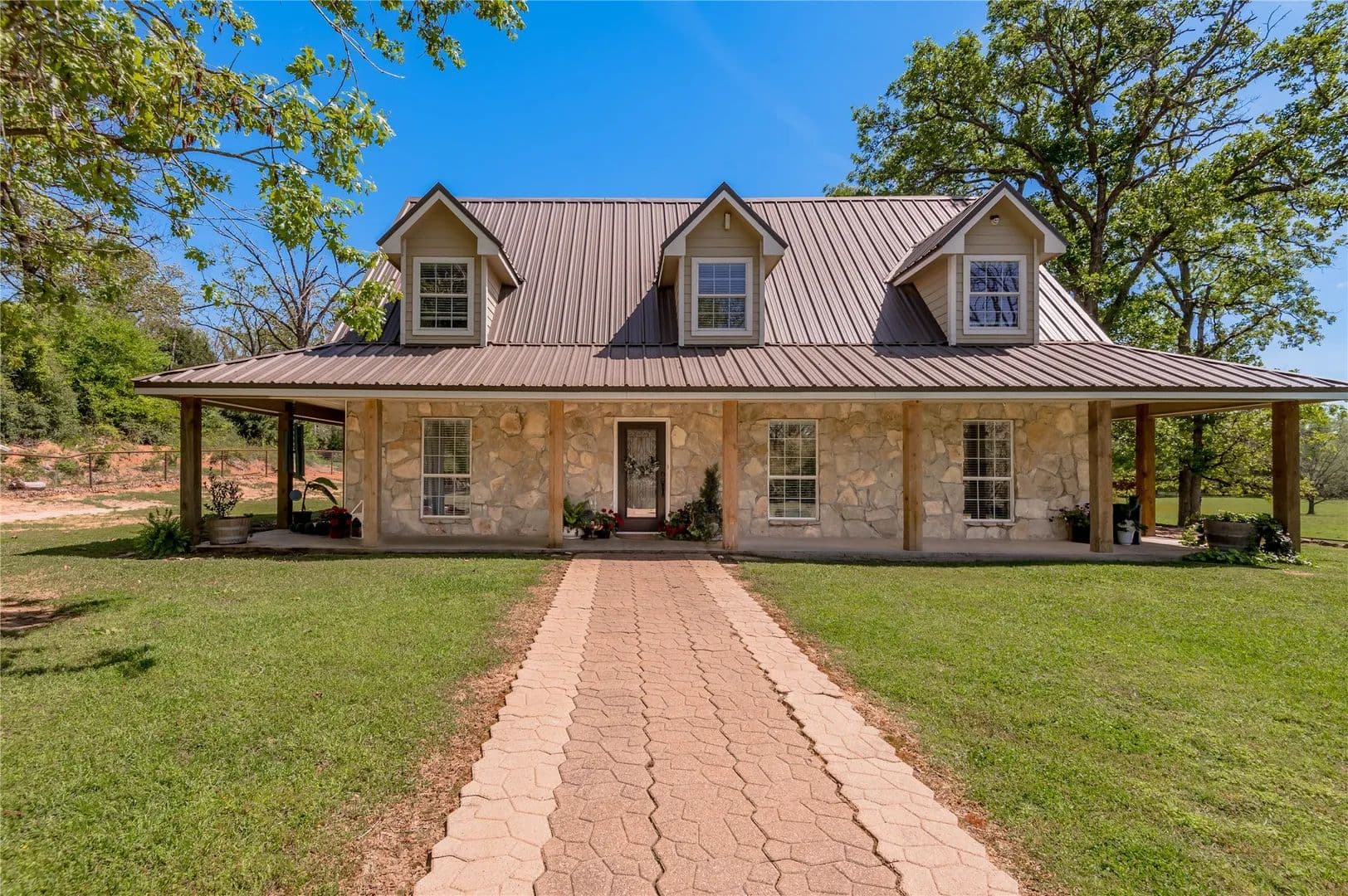 Bring the Horses! Designed, built, and previously used as a horse training facility, this property is a dream for the horse enthusiast. Gated entry w/pipe fencing; lighted arena w/covered announcer stand, livestock holding pens, cattle return alley; custom 60' the round pen; extra parking for trucks/trailers; and a custom 7-stall barn with covered entrance. Barn has new electrical; stalls have dedicated runs; built-in feeders & auto waterers, wash rack, vet stocks, and 2 open 12x12 storage areas. 6 individual pastures; 5 with covered stalls. As you continue up the drive and you'll cross the live creek on the newly rebuilt bridge and arrive at the custom hilltop home. With welcoming covered porches and fantastic views, you'll be right at home here. This home offers a wonderful floor plan and great views from every room. Master suite with private bath and huge walk-in closet. Spacious downstairs living room with huge FP + 2nd living area up.