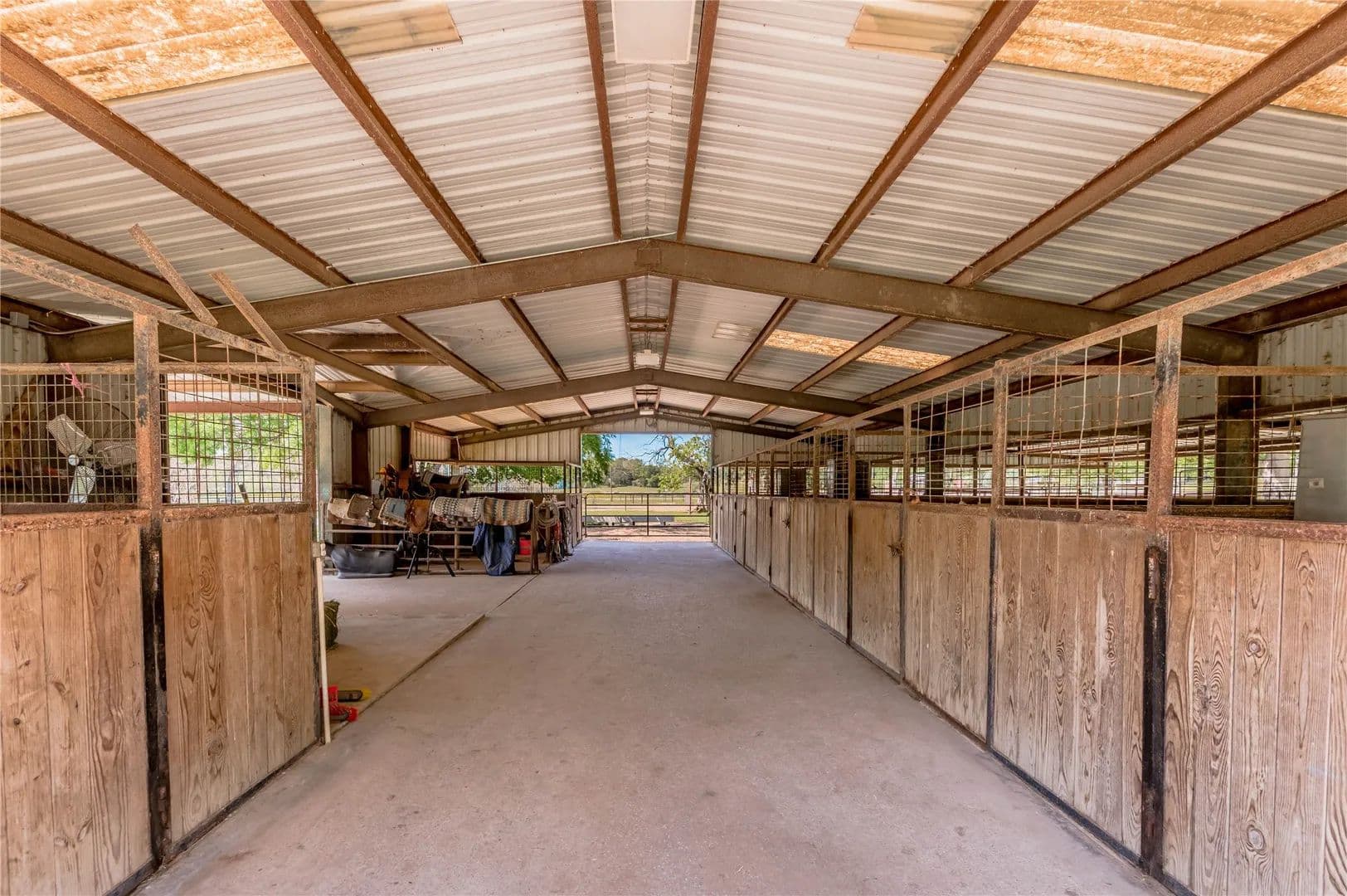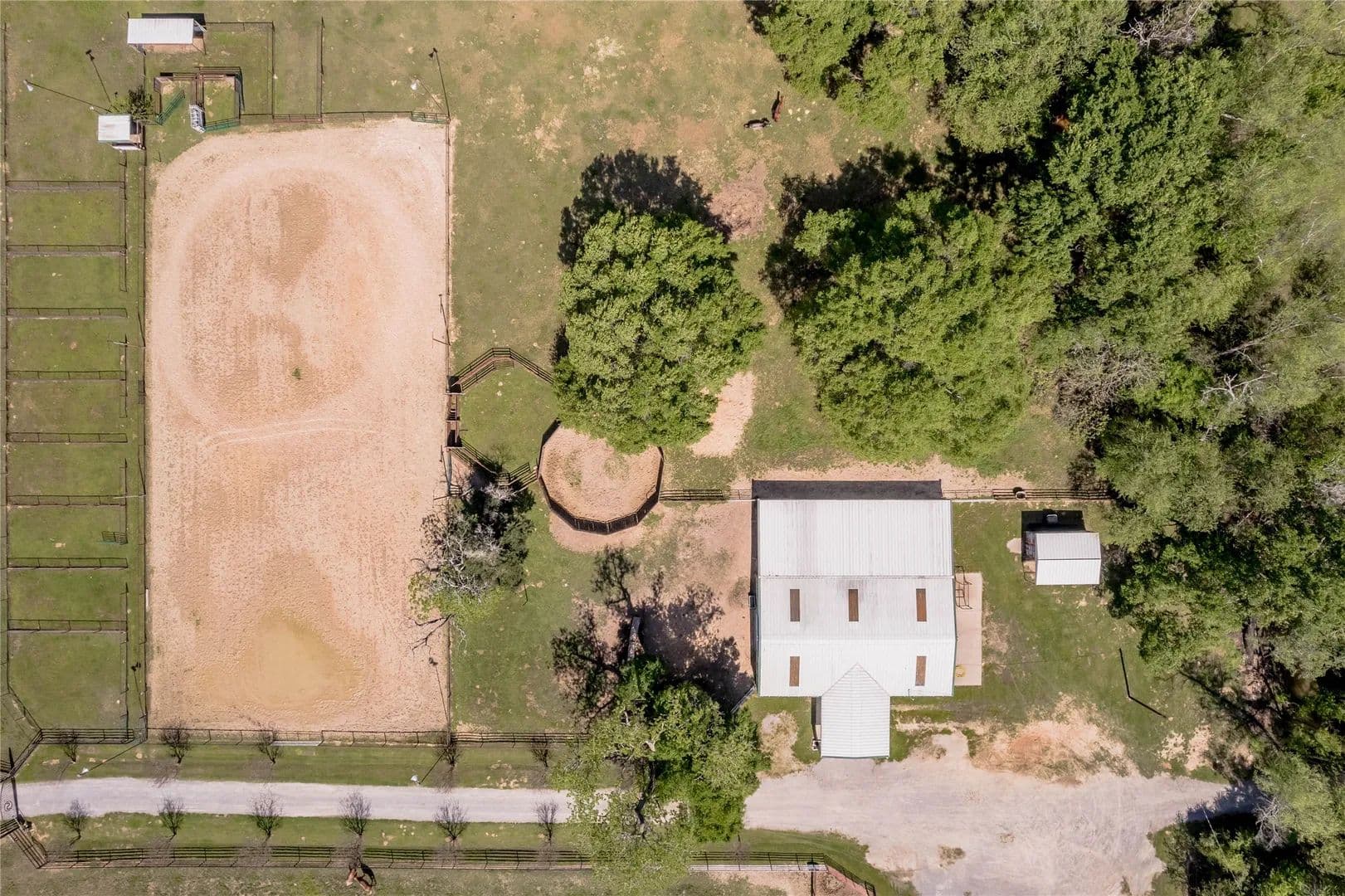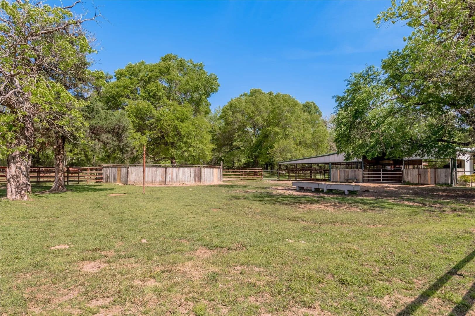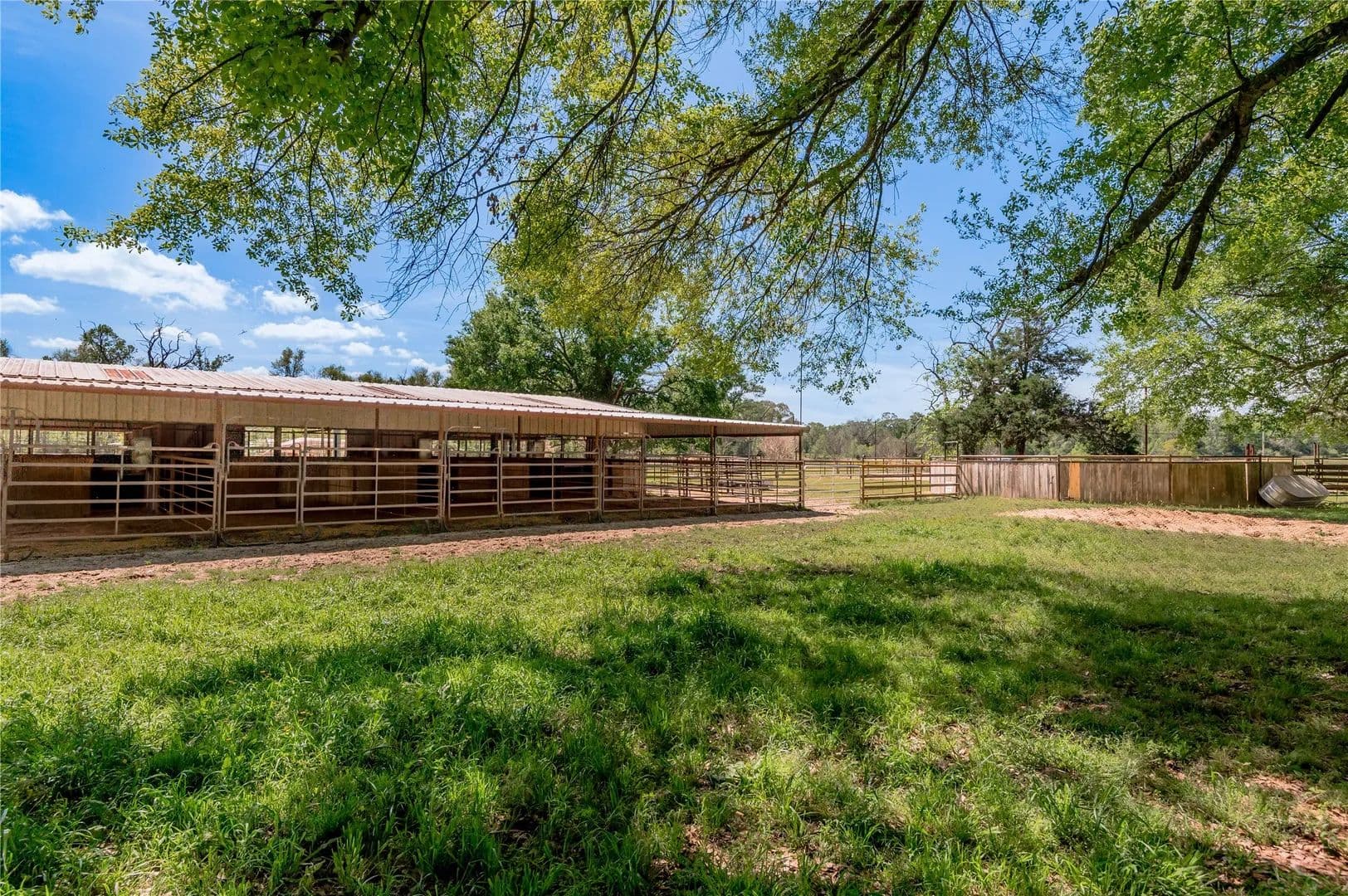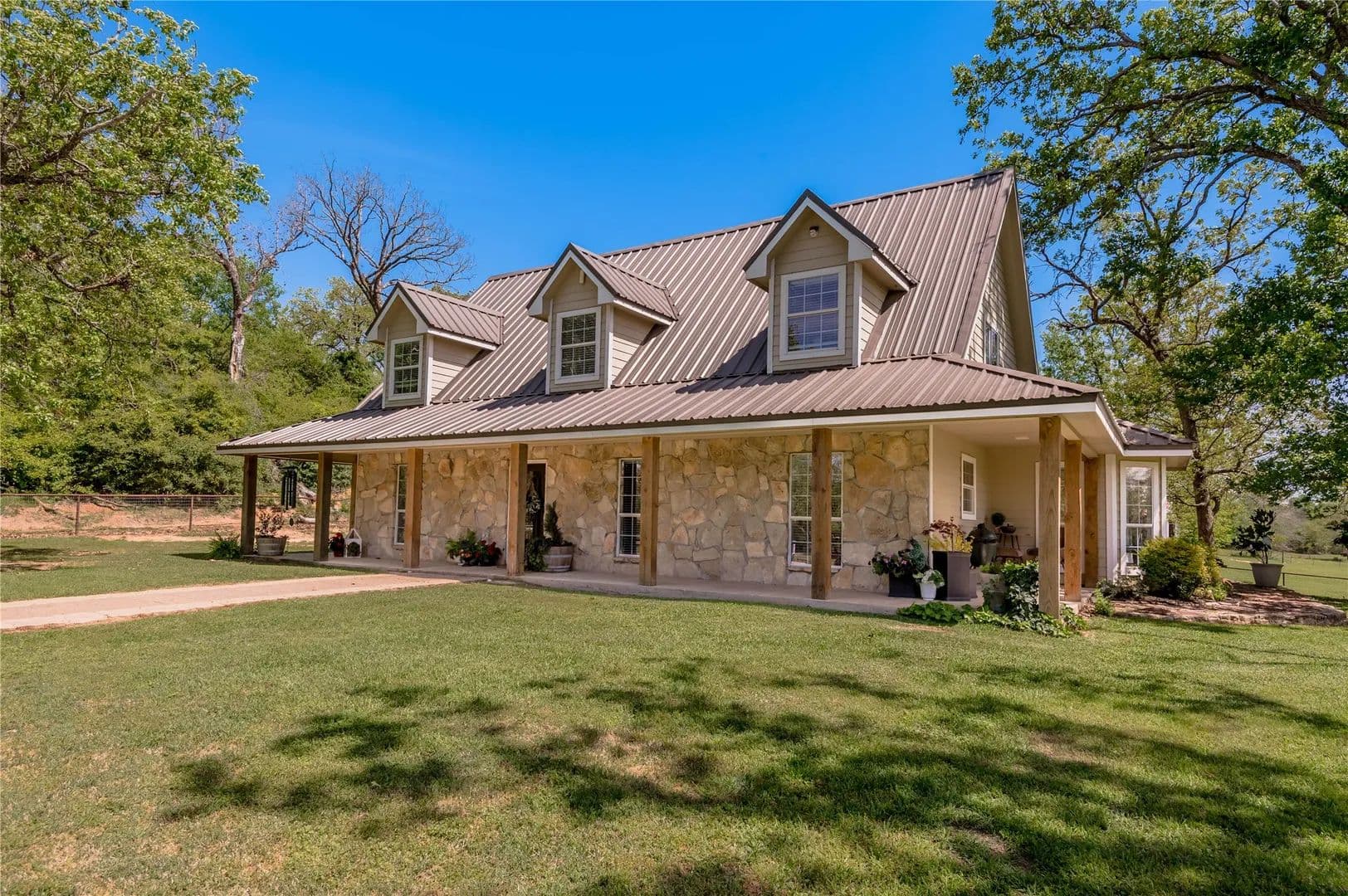 Bring the Horses! Designed, built, and previously used as a horse training facility, this property is a dream for the horse enthusiast. Gated entry w/pipe fencing; lighted arena w/covered announcer stand, livestock holding pens, cattle return alley; custom 60' the round pen; extra parking for trucks/trailers; and a custom 7-stall barn with covered entrance. Barn has new electrical; stalls have dedicated runs; built-in feeders & auto waterers, wash rack, vet stocks, and 2 open 12x12 storage areas. 6 individual pastures; 5 with covered stalls. As you continue up the drive and you'll cross the live creek on the newly rebuilt bridge and arrive at the custom hilltop home. With welcoming covered porches and fantastic views, you'll be right at home here. This home offers a wonderful floor plan and great views from every room. Master suite with private bath and huge walk-in closet. Spacious downstairs living room with huge FP + 2nd living area up.