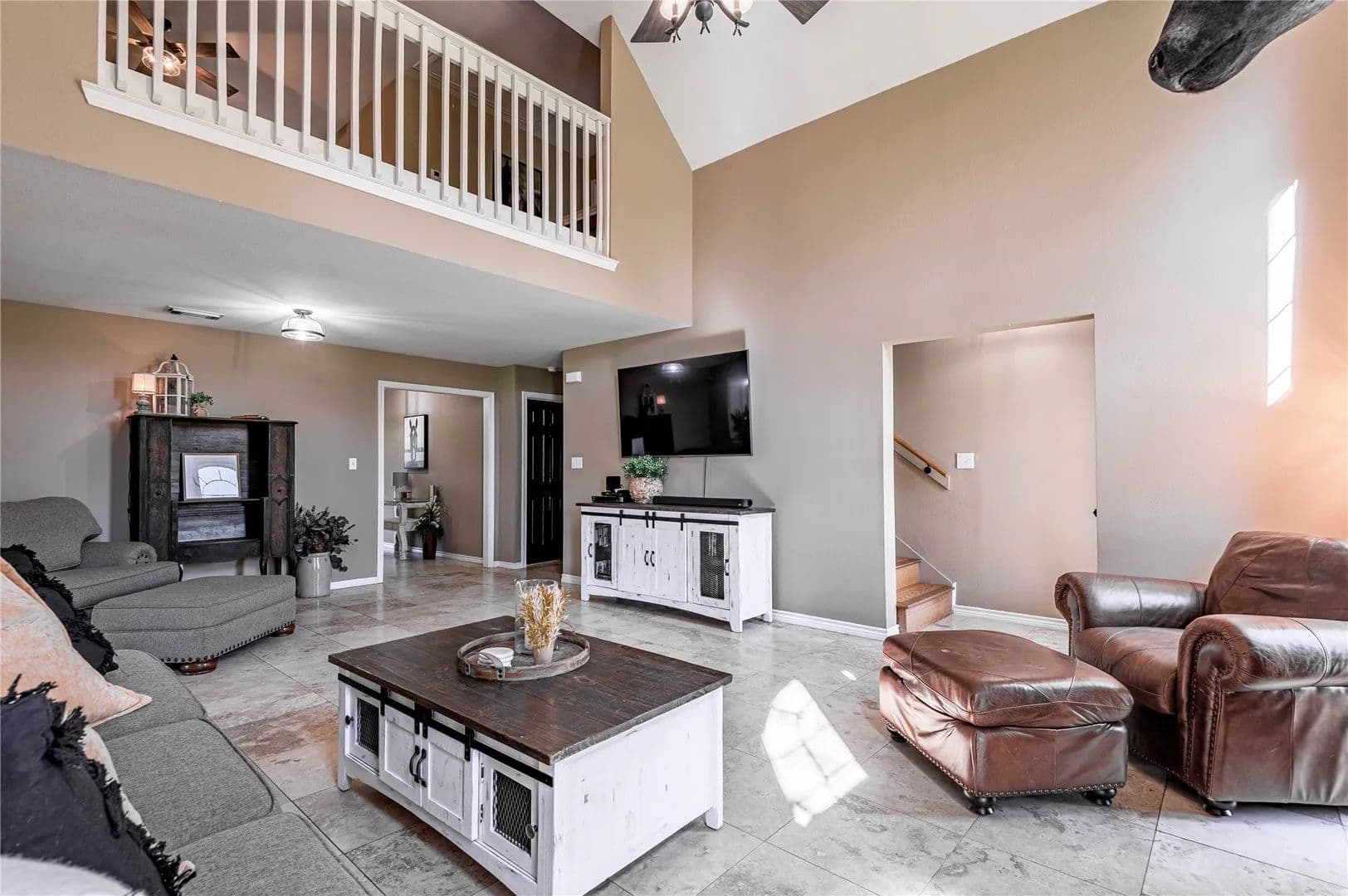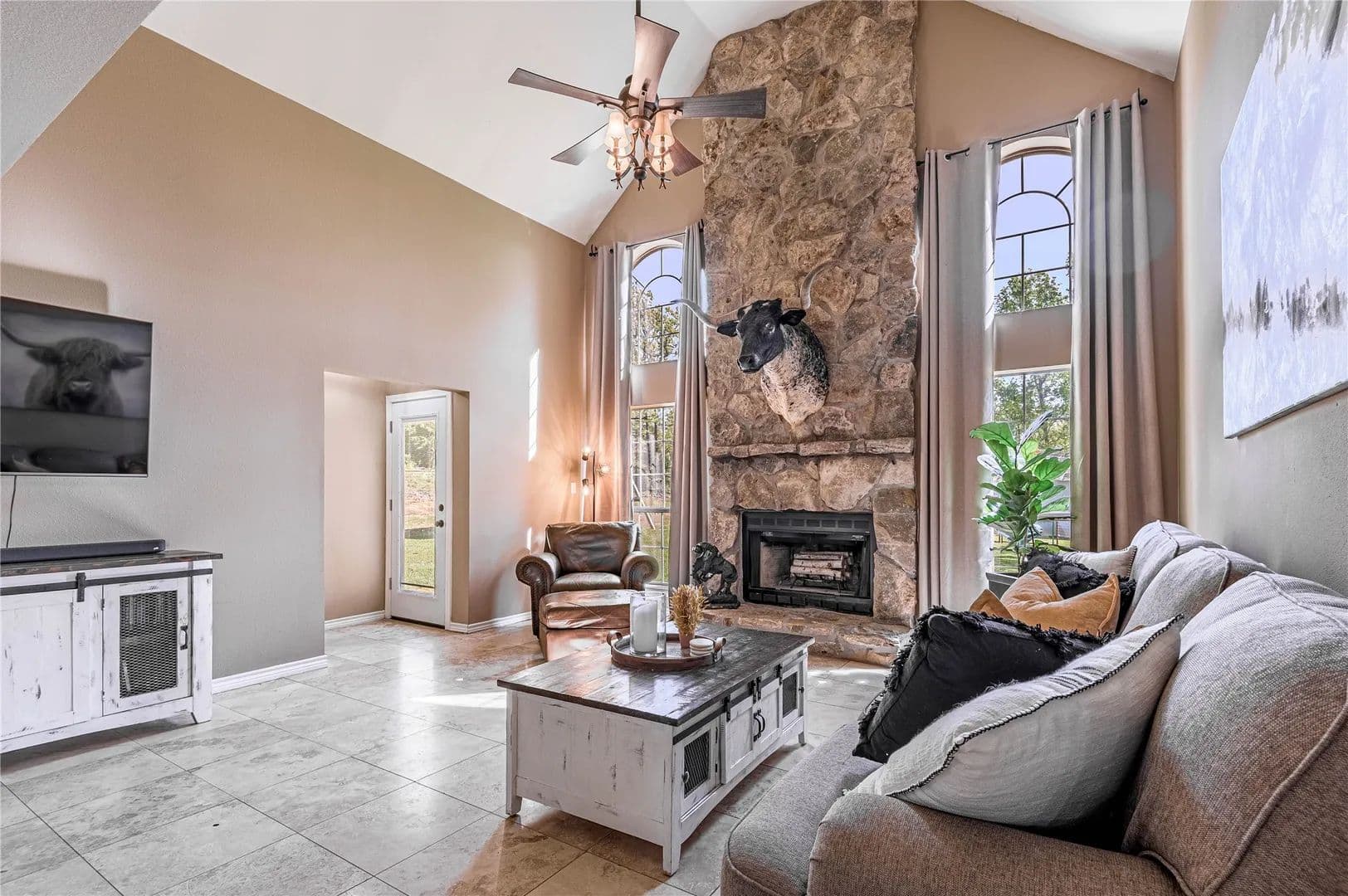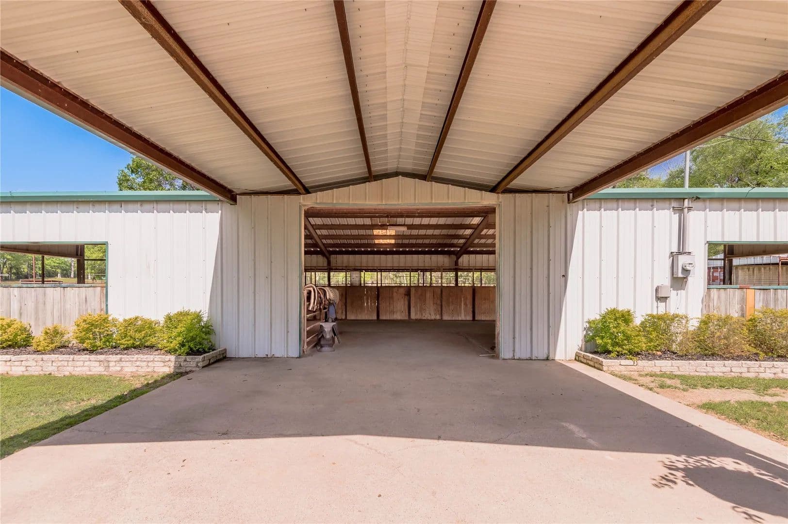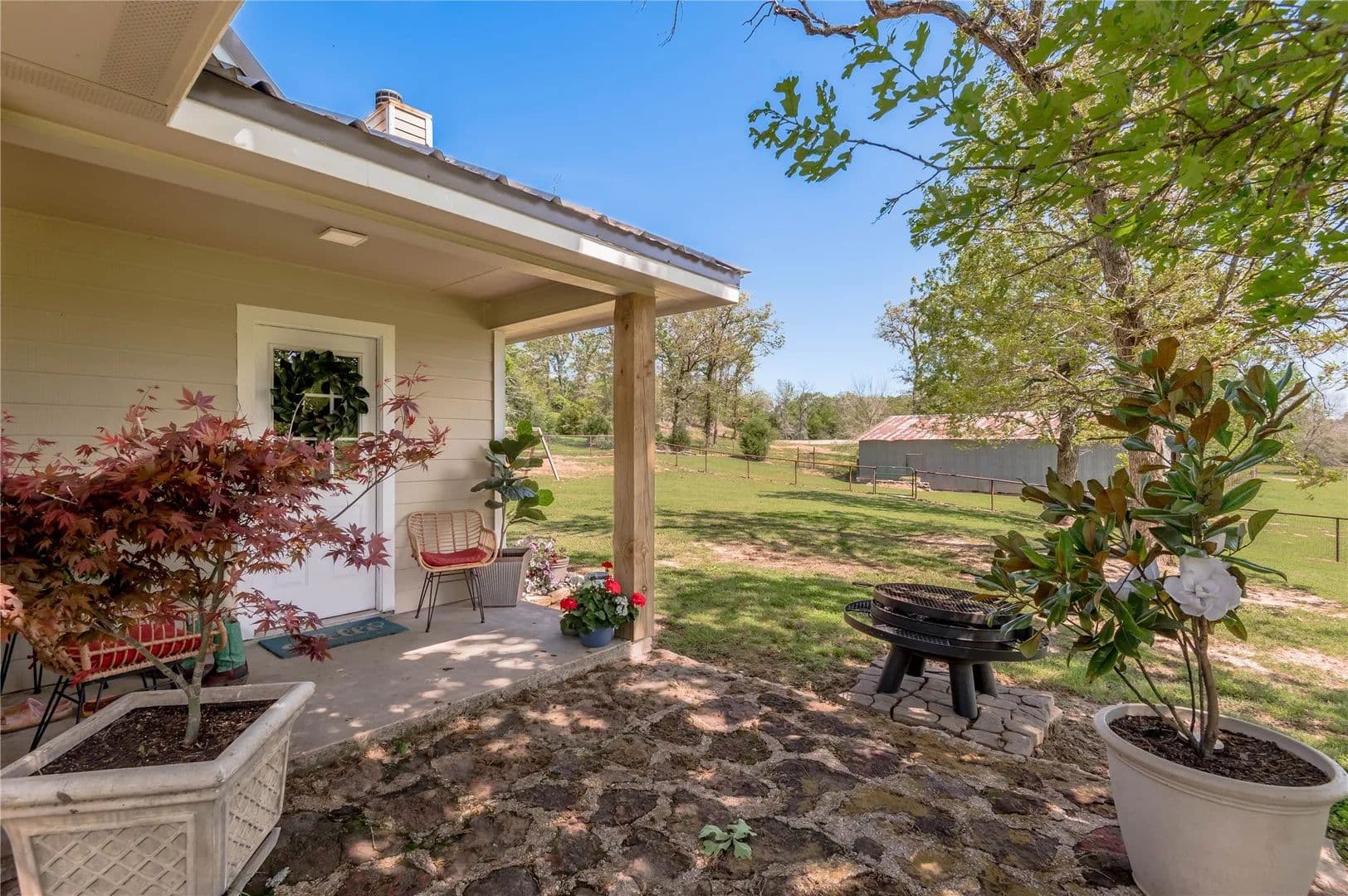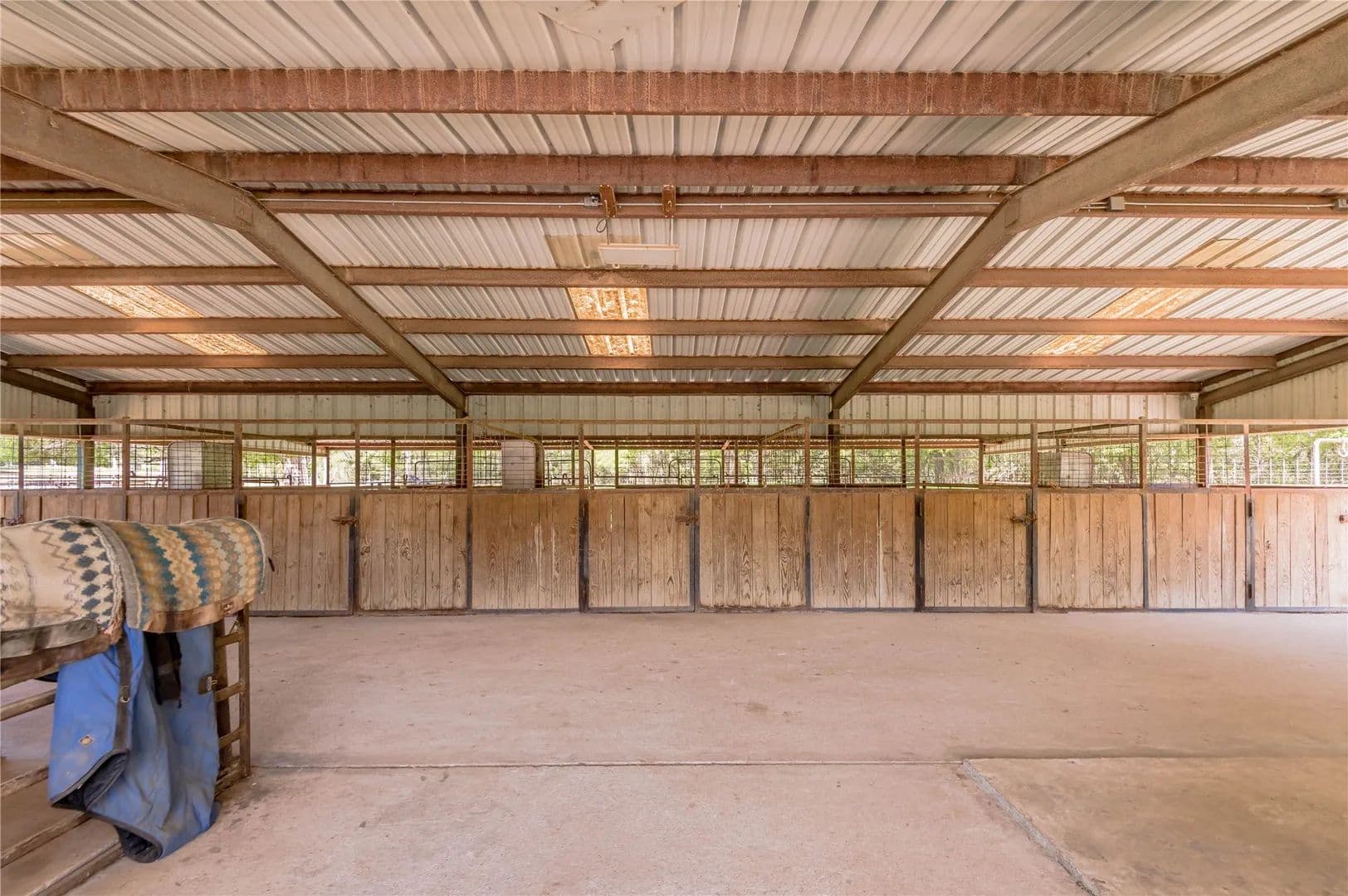 Bring the Horses! Designed, built, and previously used as a horse training facility, this property is a dream for the horse enthusiast. Gated entry w/pipe fencing; lighted arena w/covered announcer stand, livestock holding pens, cattle return alley; custom 60' the round pen; extra parking for trucks/trailers; and a custom 7-stall barn with covered entrance. Barn has new electrical; stalls have dedicated runs; built-in feeders & auto waterers, wash rack, vet stocks, and 2 open 12x12 storage areas. 6 individual pastures; 5 with covered stalls. As you continue up the drive and you'll cross the live creek on the newly rebuilt bridge and arrive at the custom hilltop home. With welcoming covered porches and fantastic views, you'll be right at home here. This home offers a wonderful floor plan and great views from every room. Master suite with private bath and huge walk-in closet. Spacious downstairs living room with huge FP + 2nd living area up.