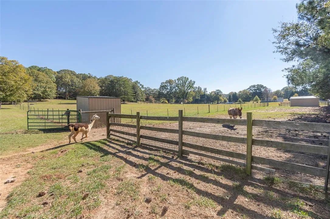 Fields are divided into various fenced and gated parcels with barns and buildings throughout.