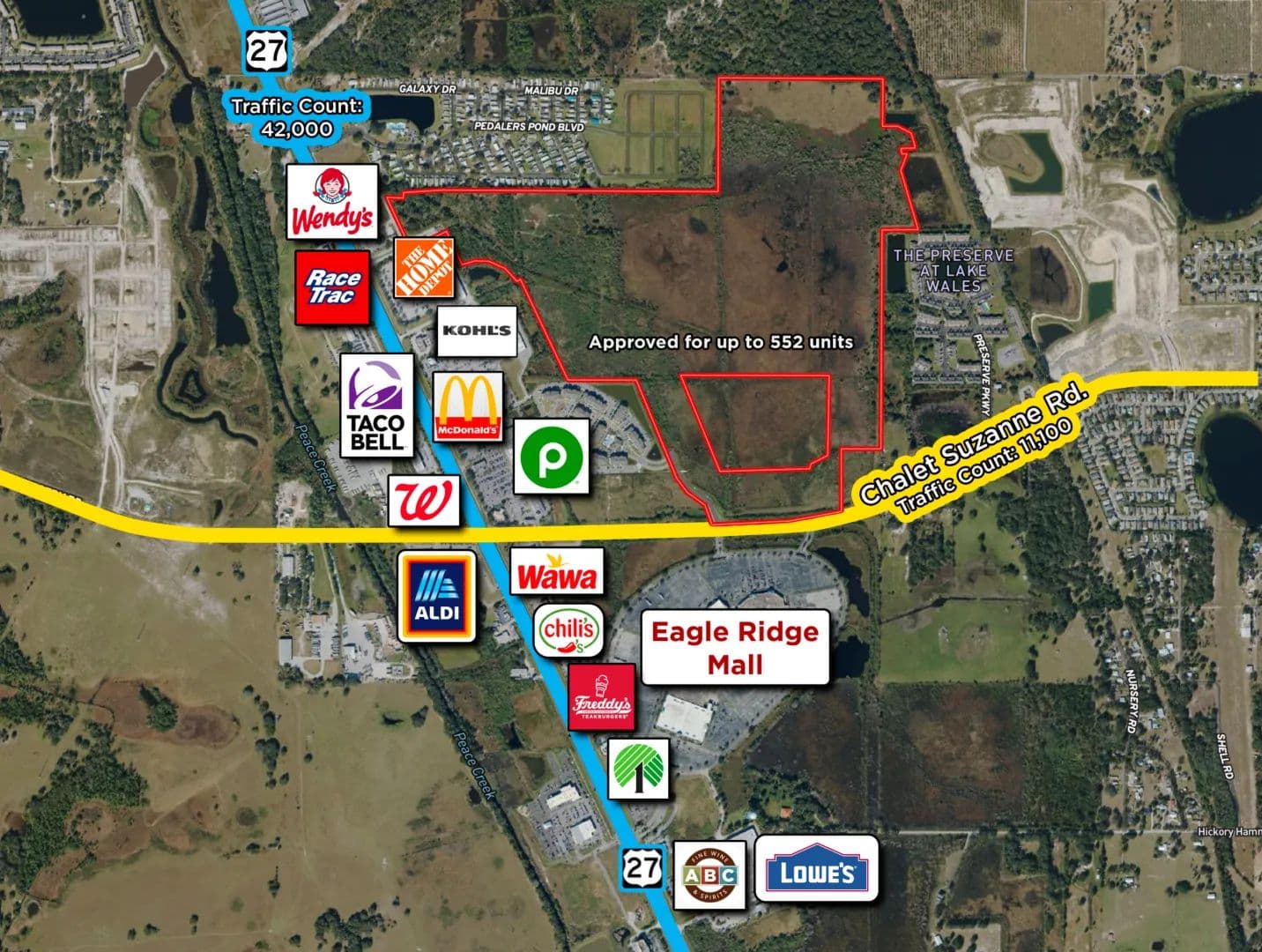 This ±200-acre mixed-use development opportunity is located along the US Highway 27 growth corridor in Lake Wales, Florida and carries Future Land Use designations of Medium Density Residential and Regional Activity Center (RAC). The site features 1,401.30 linear feet of frontage on Chalet Suzanne Rd, creating the potential for an approximately ±15-acre commercial frontage band suitable for neighborhood-serving retail, pads, and service-oriented users, while the balance of the property provides depth for a master-planned residential program including multifamily and single-family components. The property is positioned in a proven daily-needs retail node anchored by Publix, with nearby national and regional users including Aldi, Chili’s, Freddy’s, Sherwin-Williams, Planet Fitness, Lowe’s, and ABC Fine Wine & Spirits, and continued corridor momentum supported by Hampton Inn, a completed Chipotle, Slim Chickens, Starbucks, and a newly completed CubeSmart self-storage facility, along with multiple auto dealerships along US 27. As part of a coordinated development plan, a traffic signal and roadway connection may be achievable, and a prospective buyer is encouraged to meet with the City early to evaluate feasibility, access management criteria, alignment, and timing to maximize commercial exposure and internal circulation. The site is also associated with an approved PDP allowing up to 1,650 dwelling units and an approved 552-unit apartment project, with wetlands described as carrying 6 du/acre density treatment that may allow for density clustering onto uplands (buyer to verify)